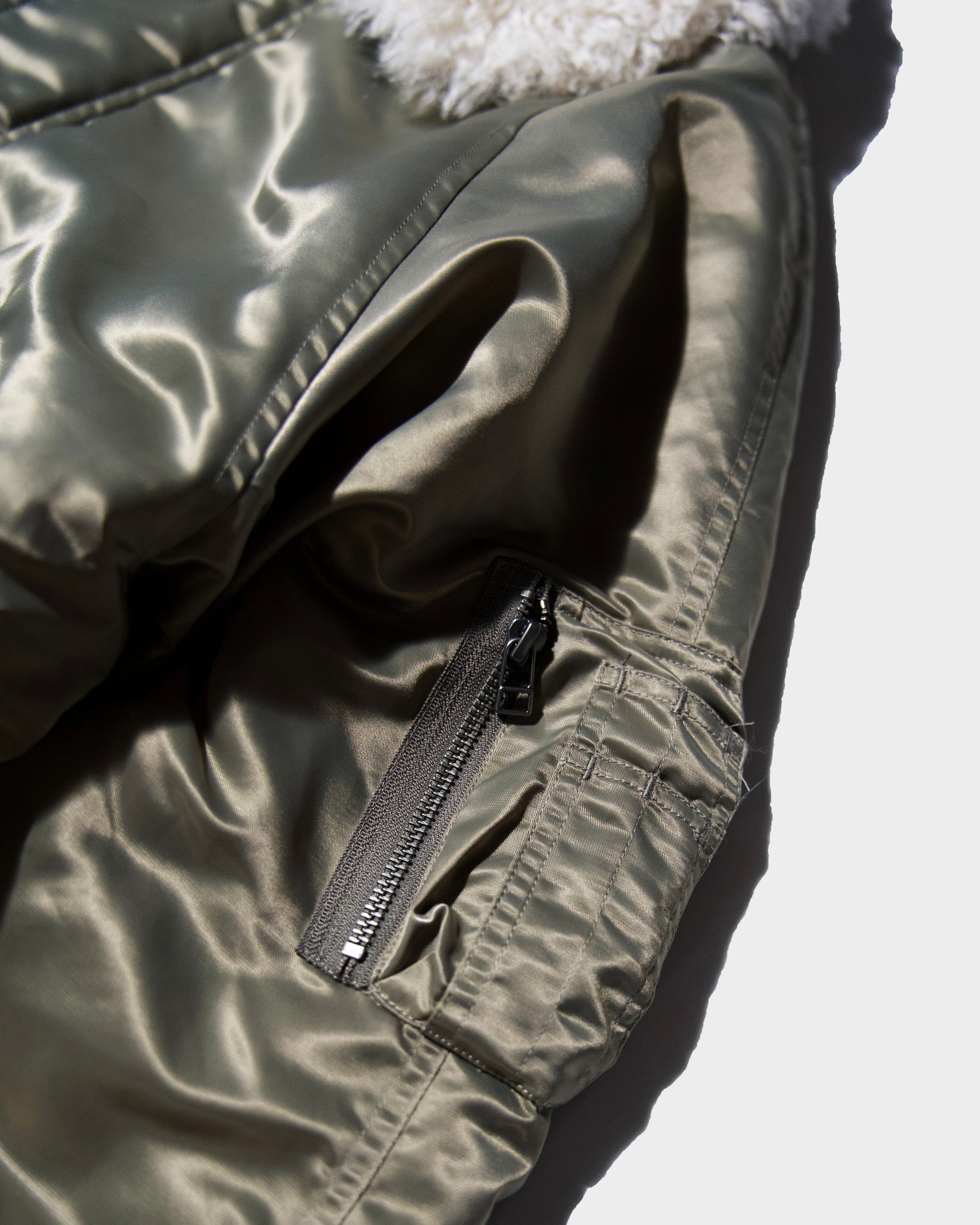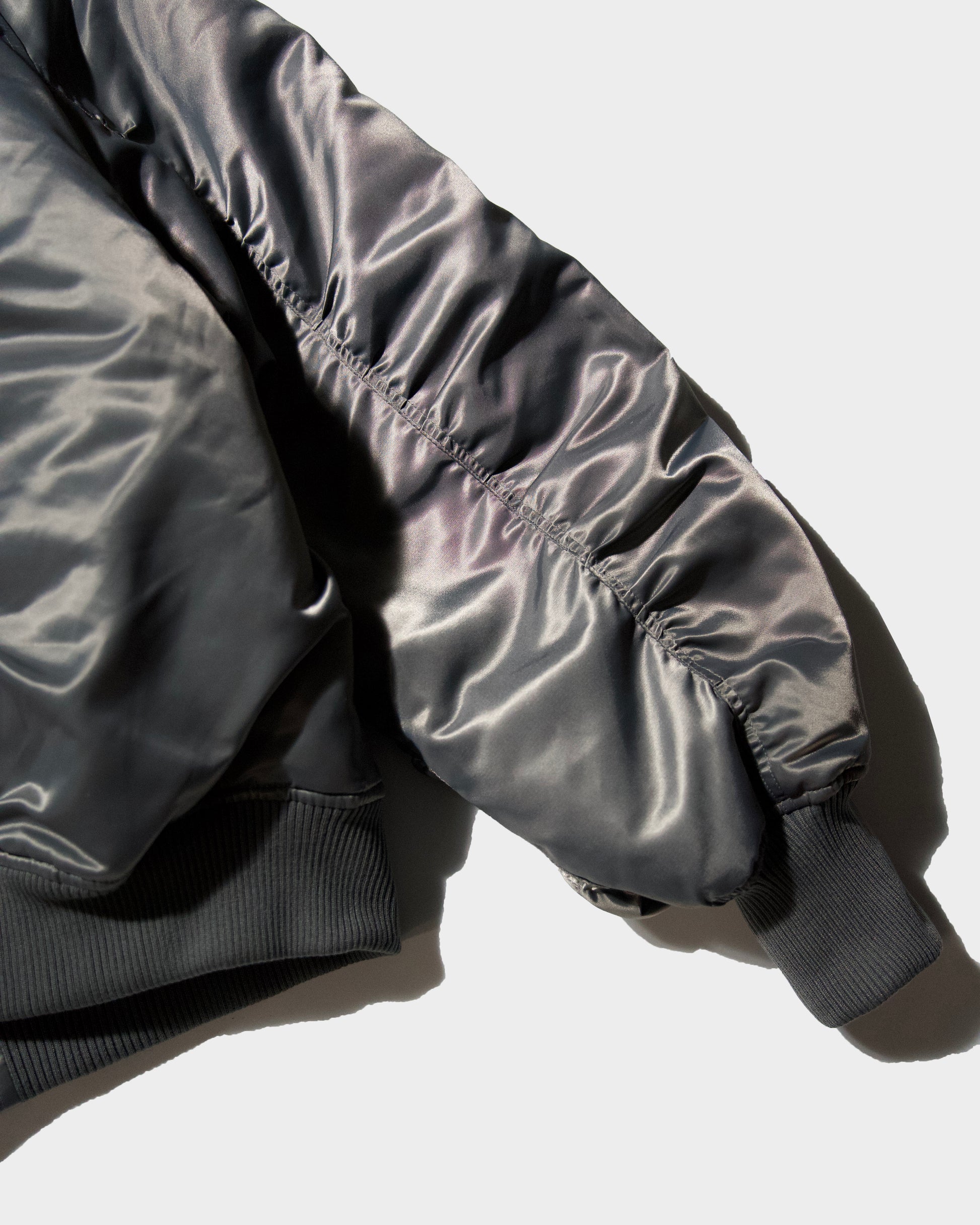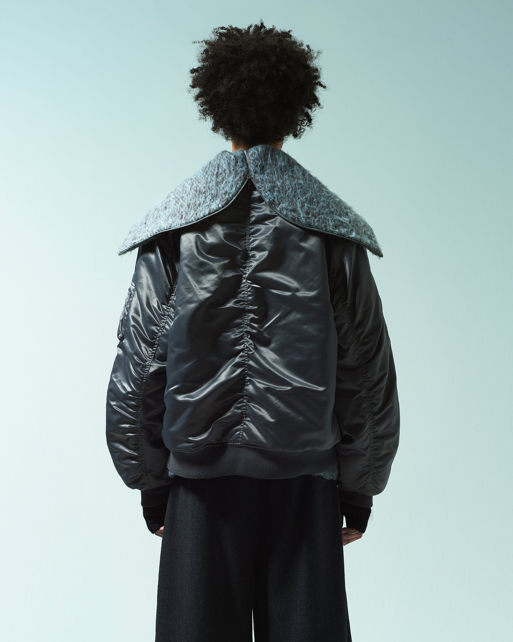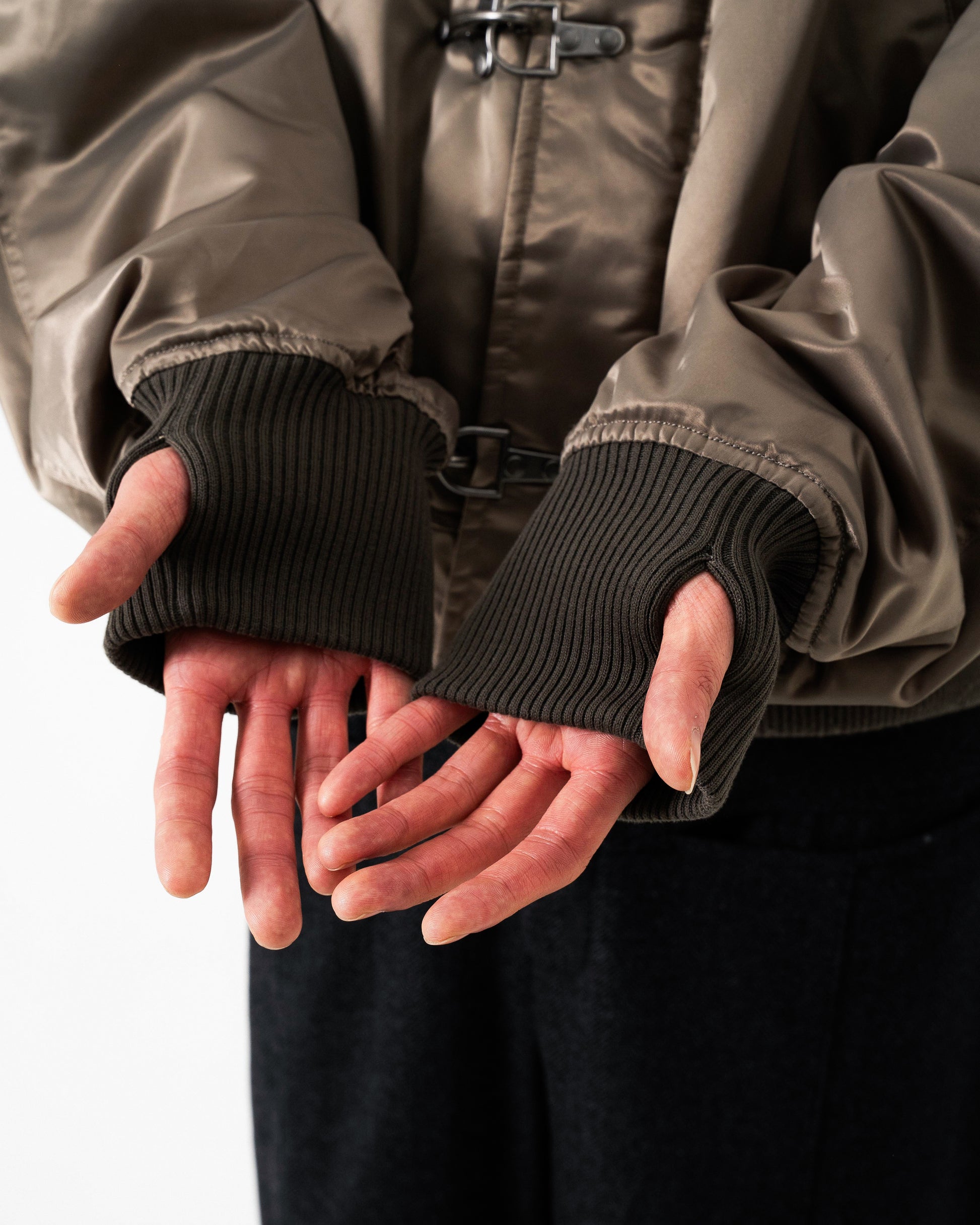 袖リブにはサムホールを配し、防寒性と実用性を強化。背面中央にはギャザーを入れ、丸みを帯びたボリュームと立体的なシルエットを形成。