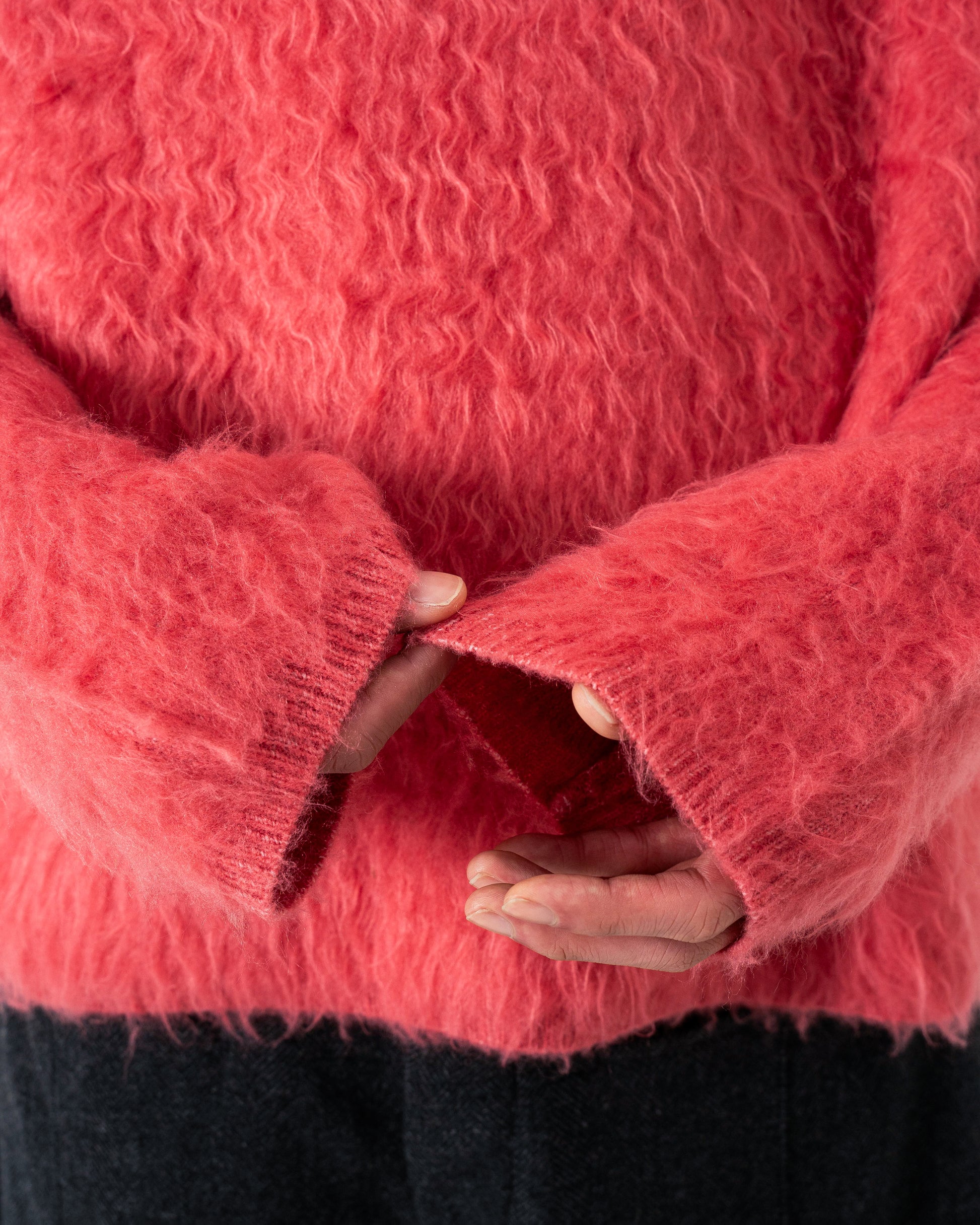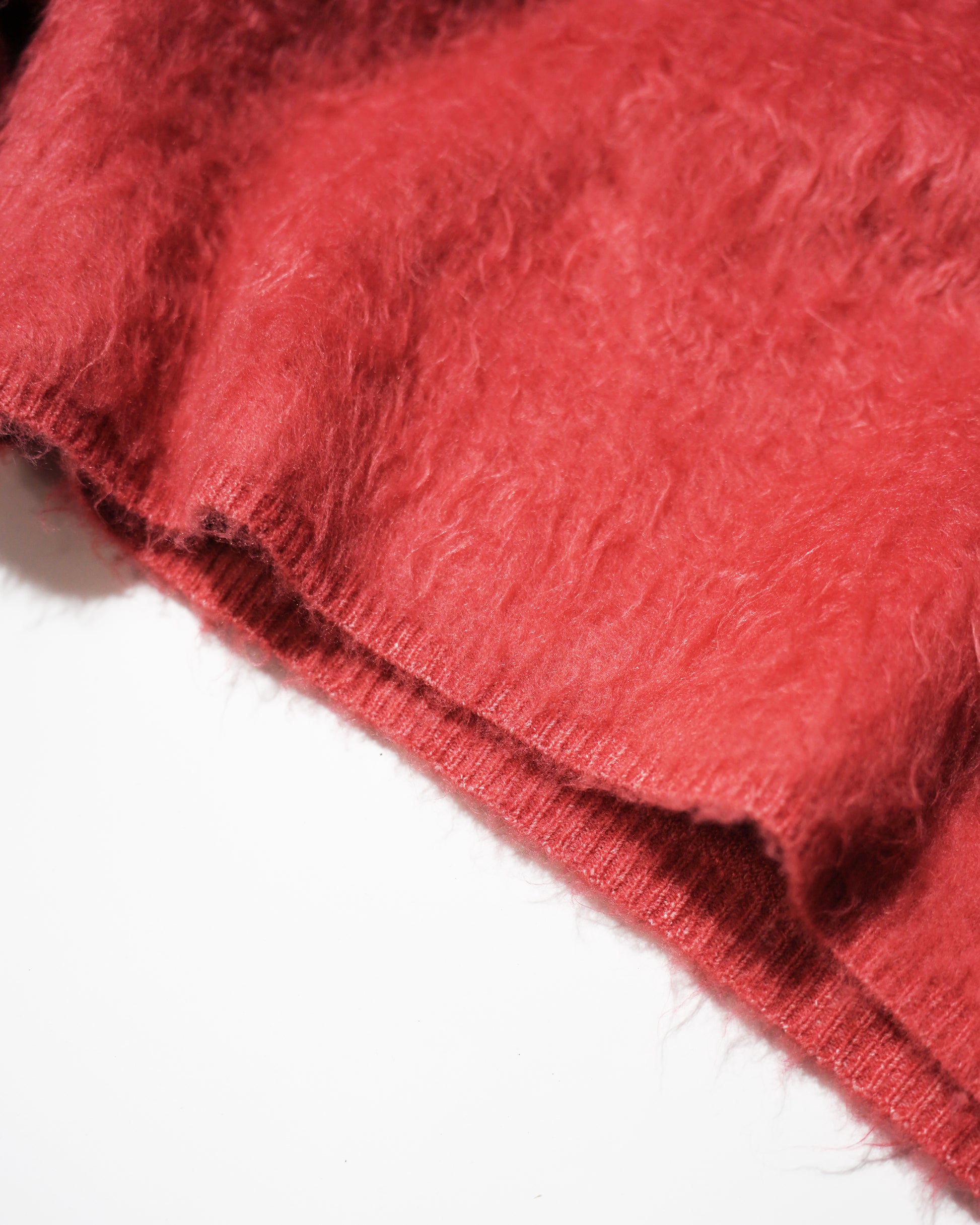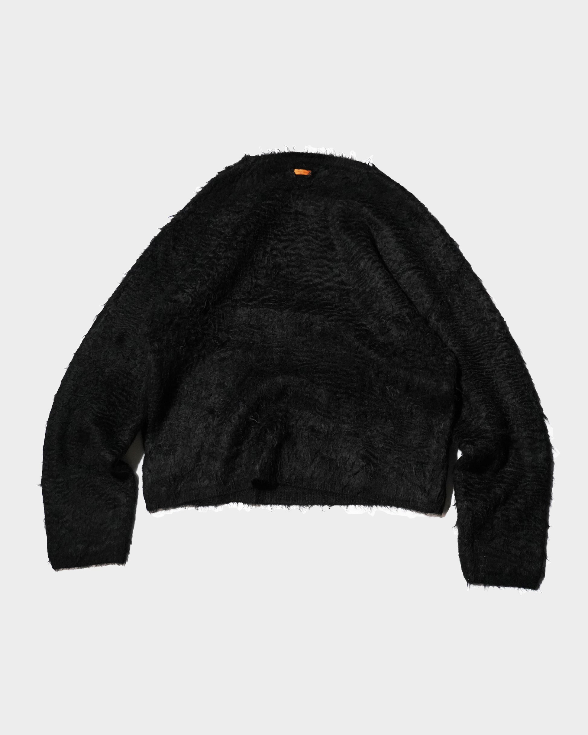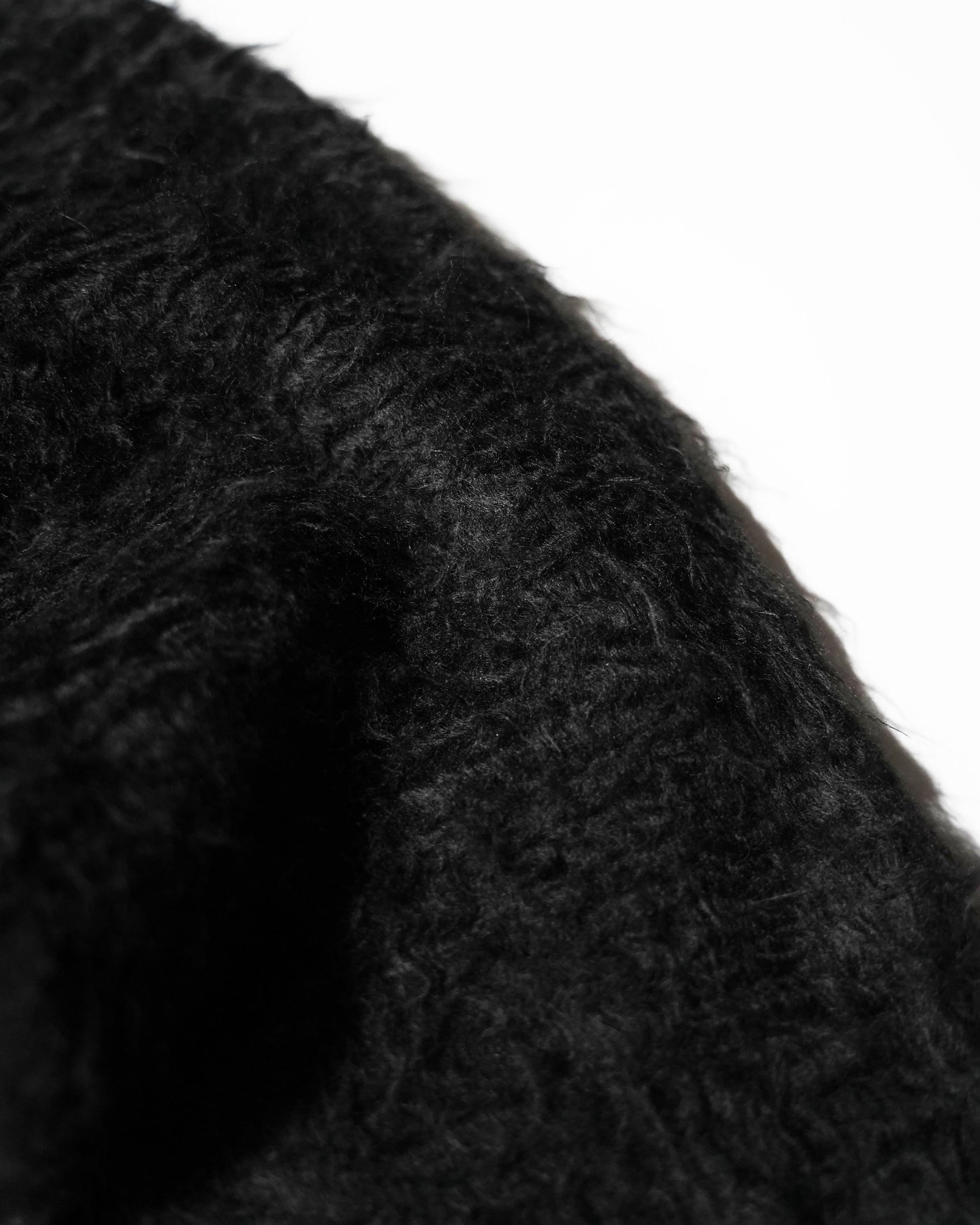 アクリルを主軸とした糸に起毛加工を施し、ヴィンテージモヘア特有の長い毛足と柔らかな陰影を再現。ショートレングスとゆとりある身幅の組み合わせが、レイヤードでも単体でもバランスよく収まりに。