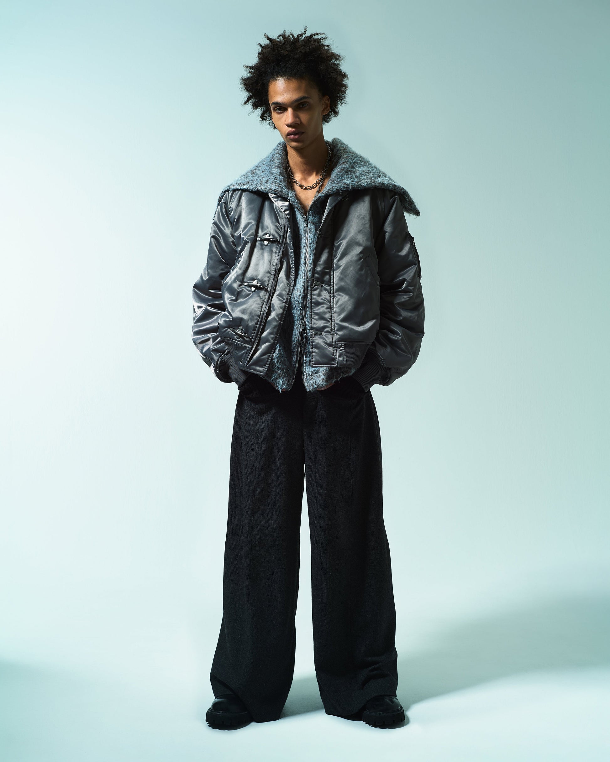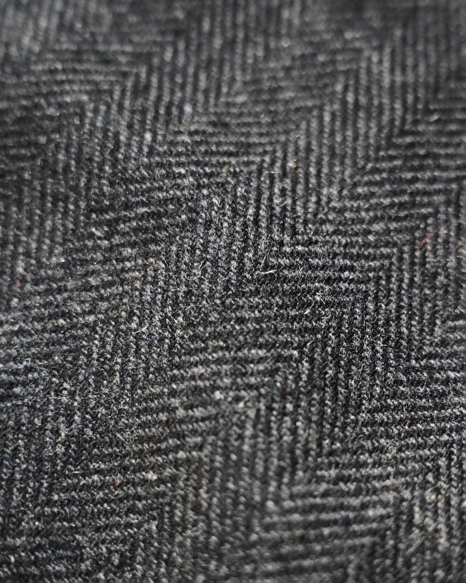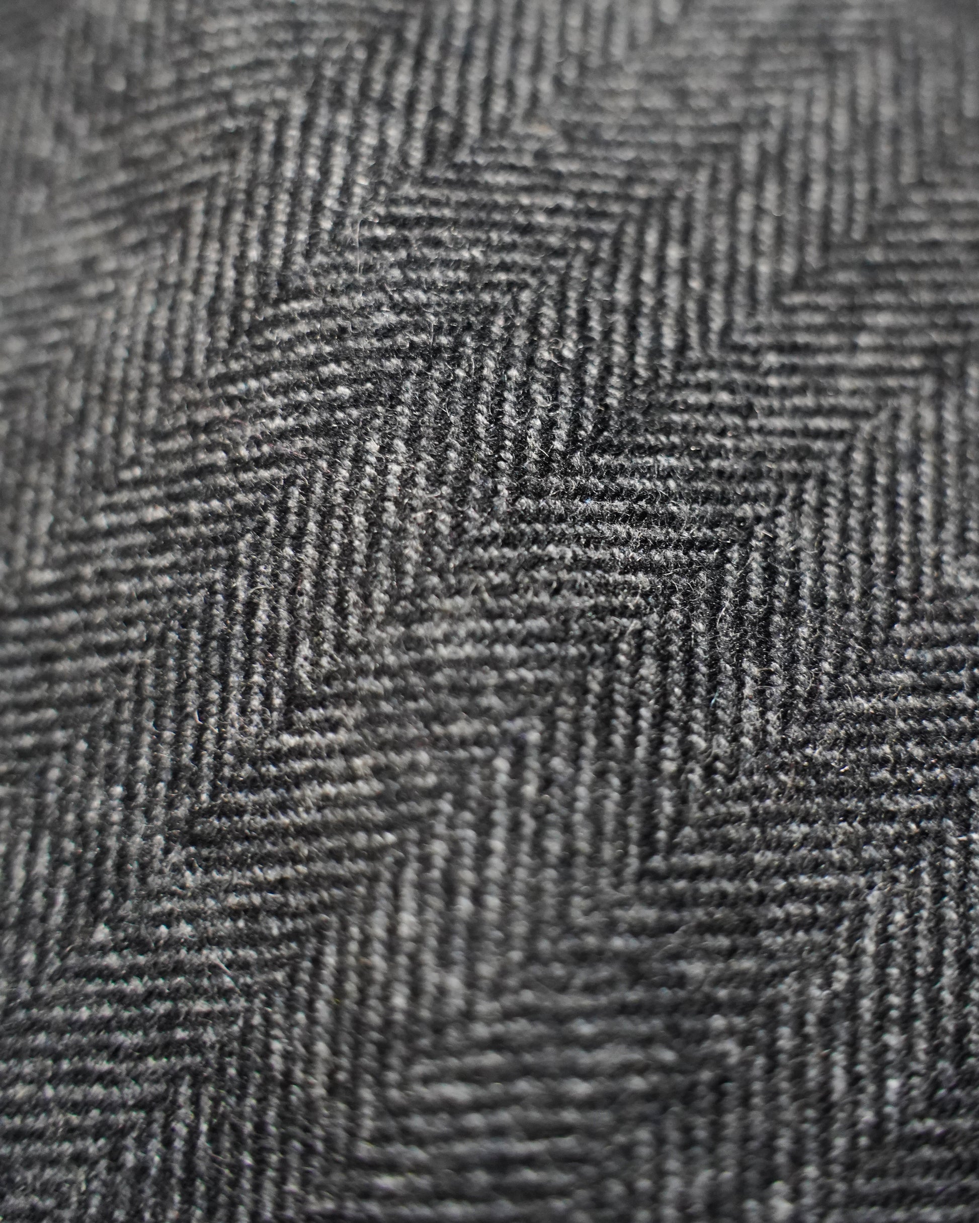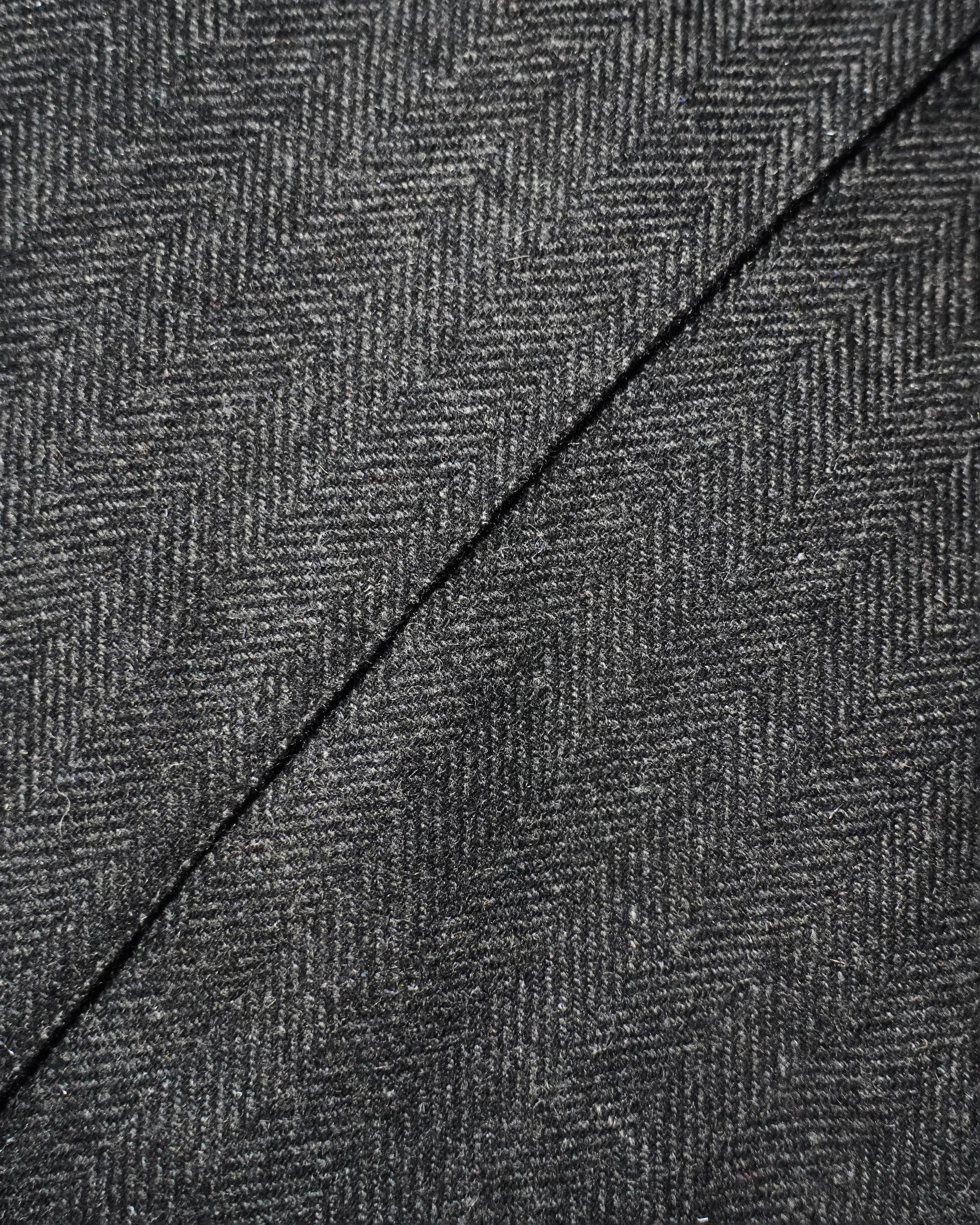 細かなヘリンボーン柄が素材の印象を引き締め、過剰になりがちなボリュームを抑えつつ、バギーらしい迫力を保つ構成。