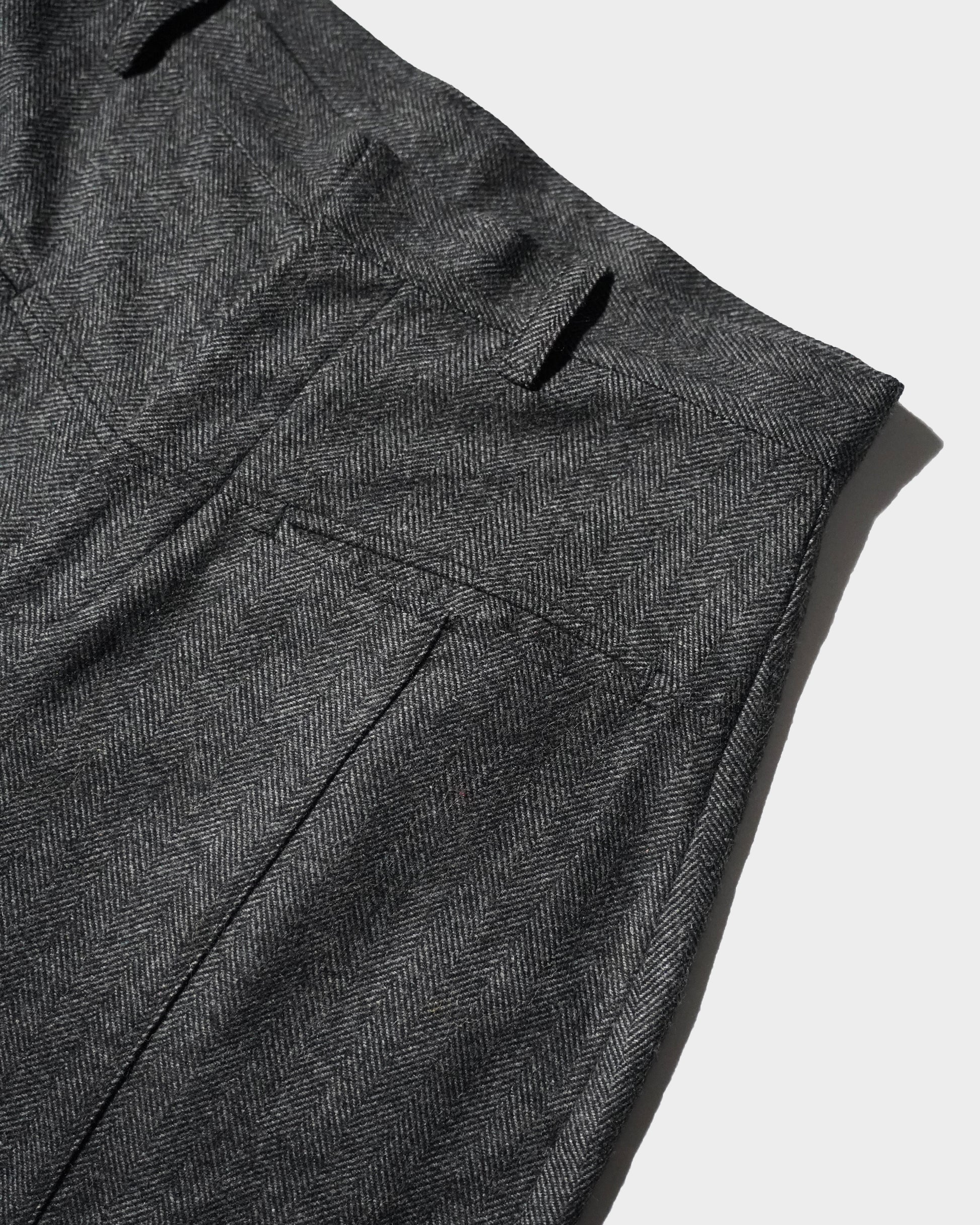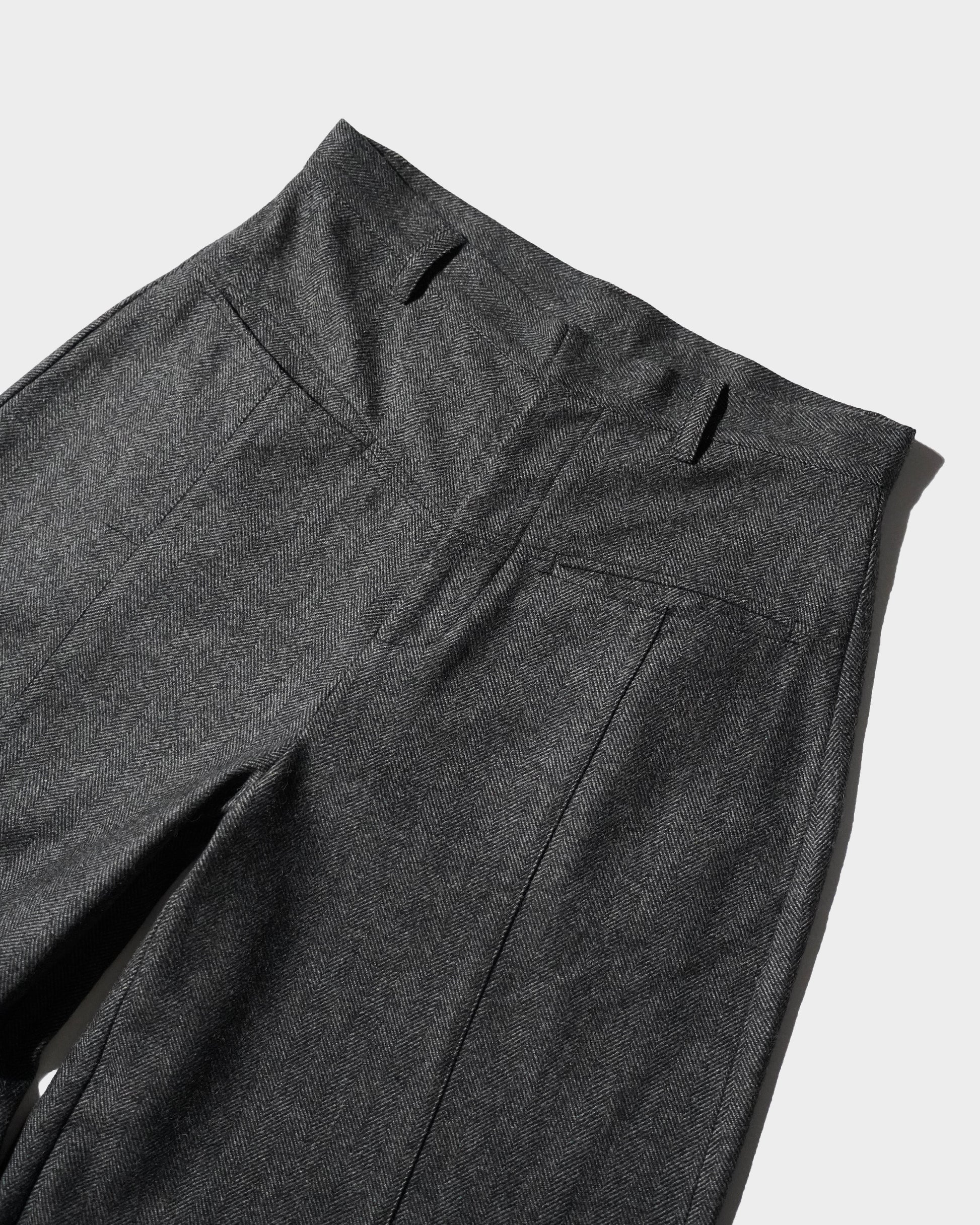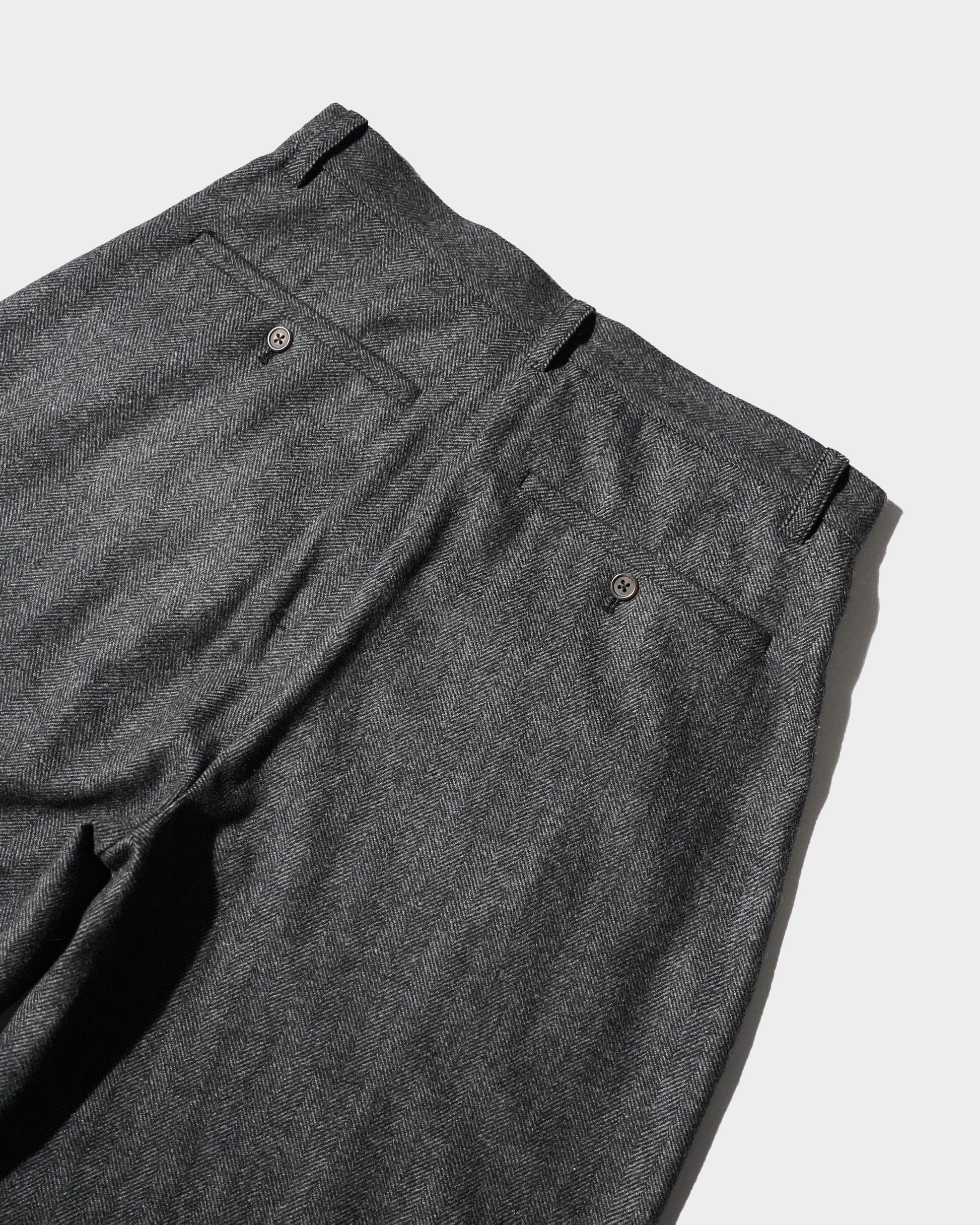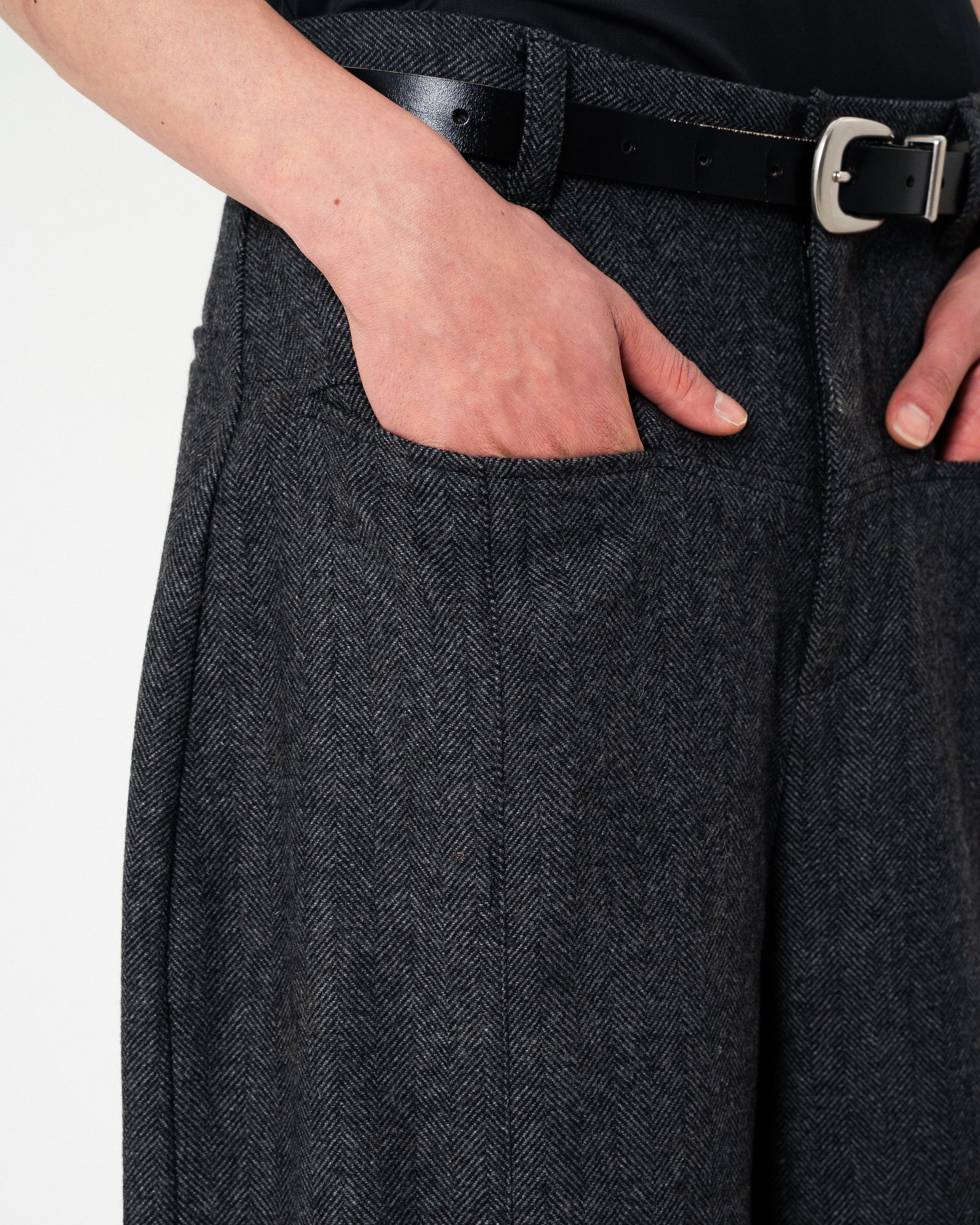 ブランドの定番として展開しているワイドバギーシルエットを、上品なウール混のヘリンボーン素材で再構築した一本。