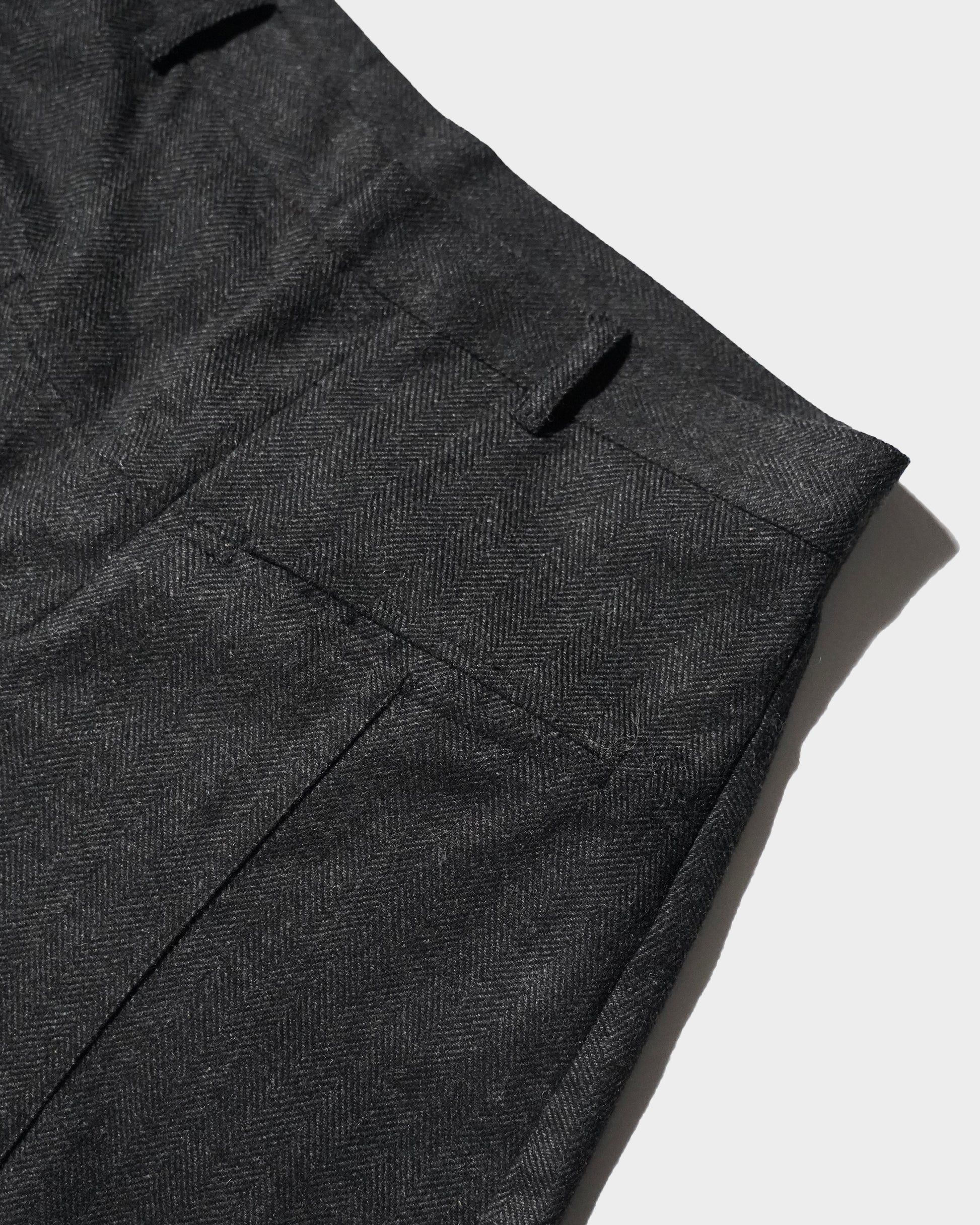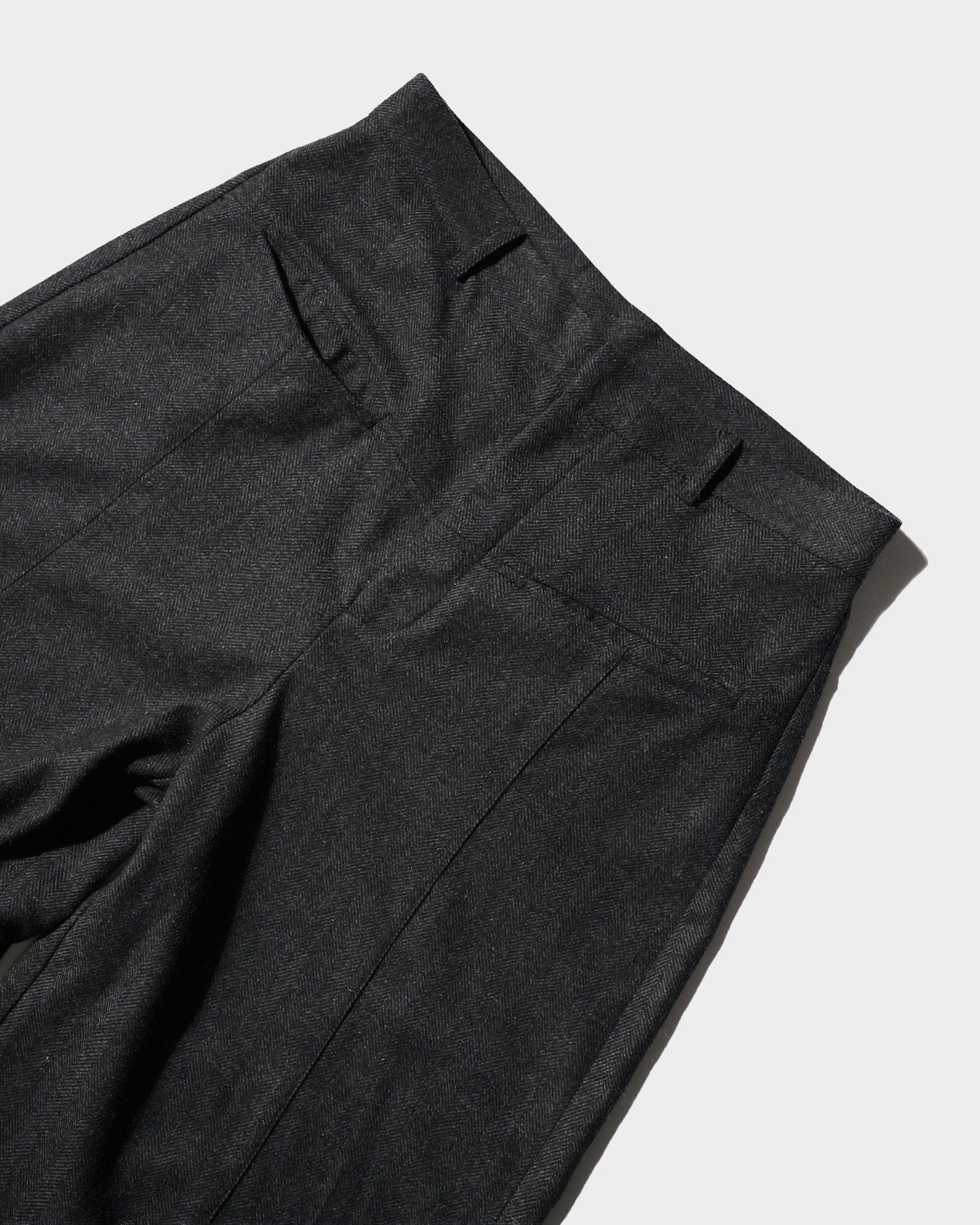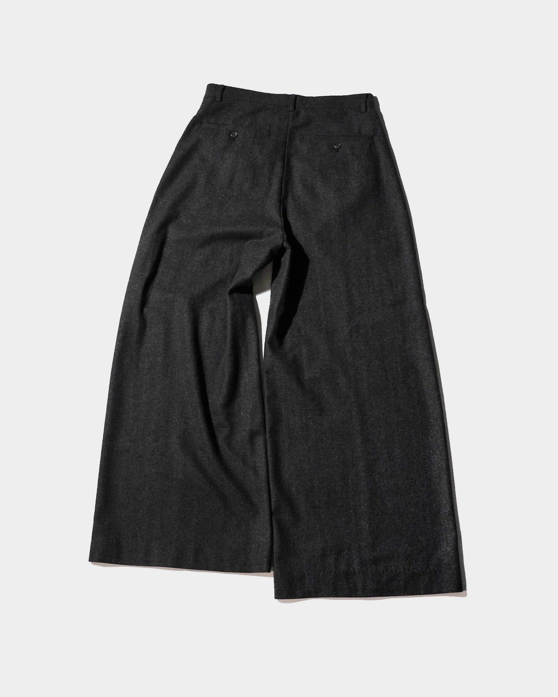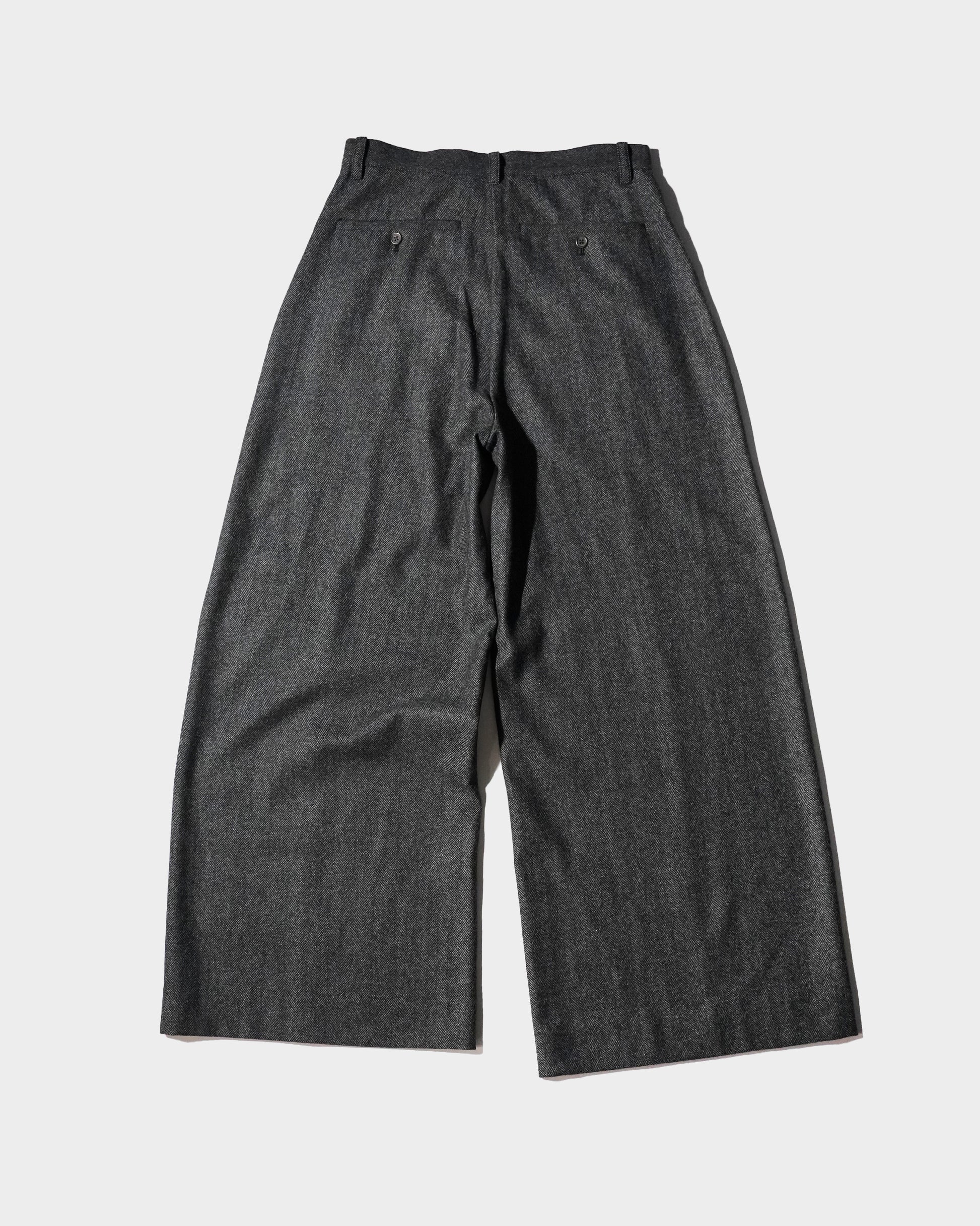 ブランドの定番として展開しているワイドバギーシルエットを、上品なウール混のヘリンボーン素材で再構築した一本。