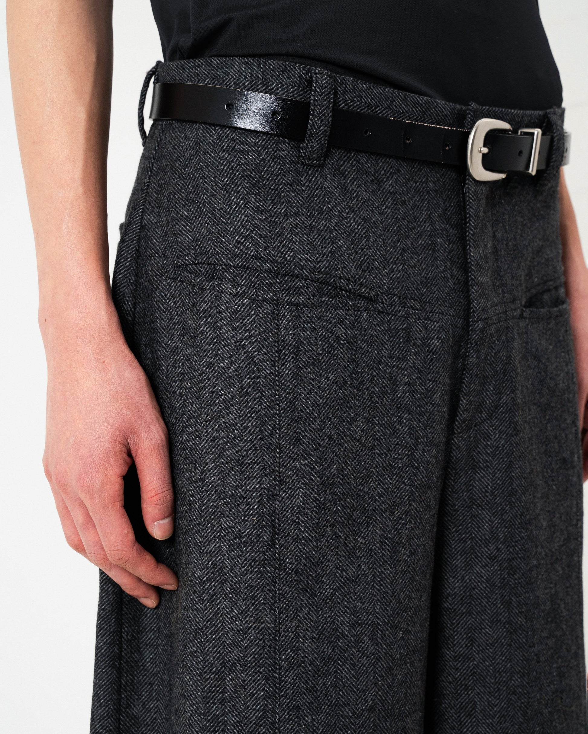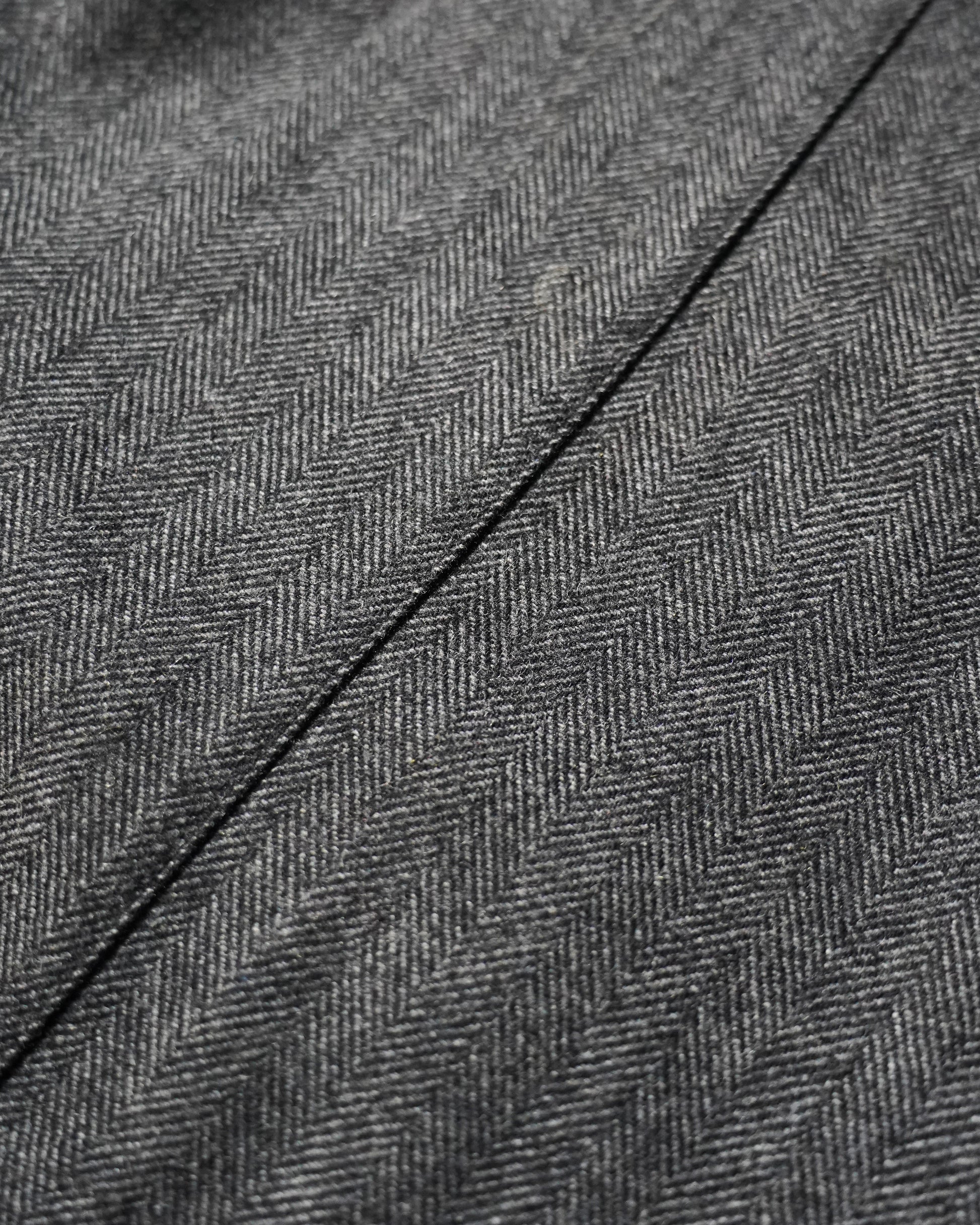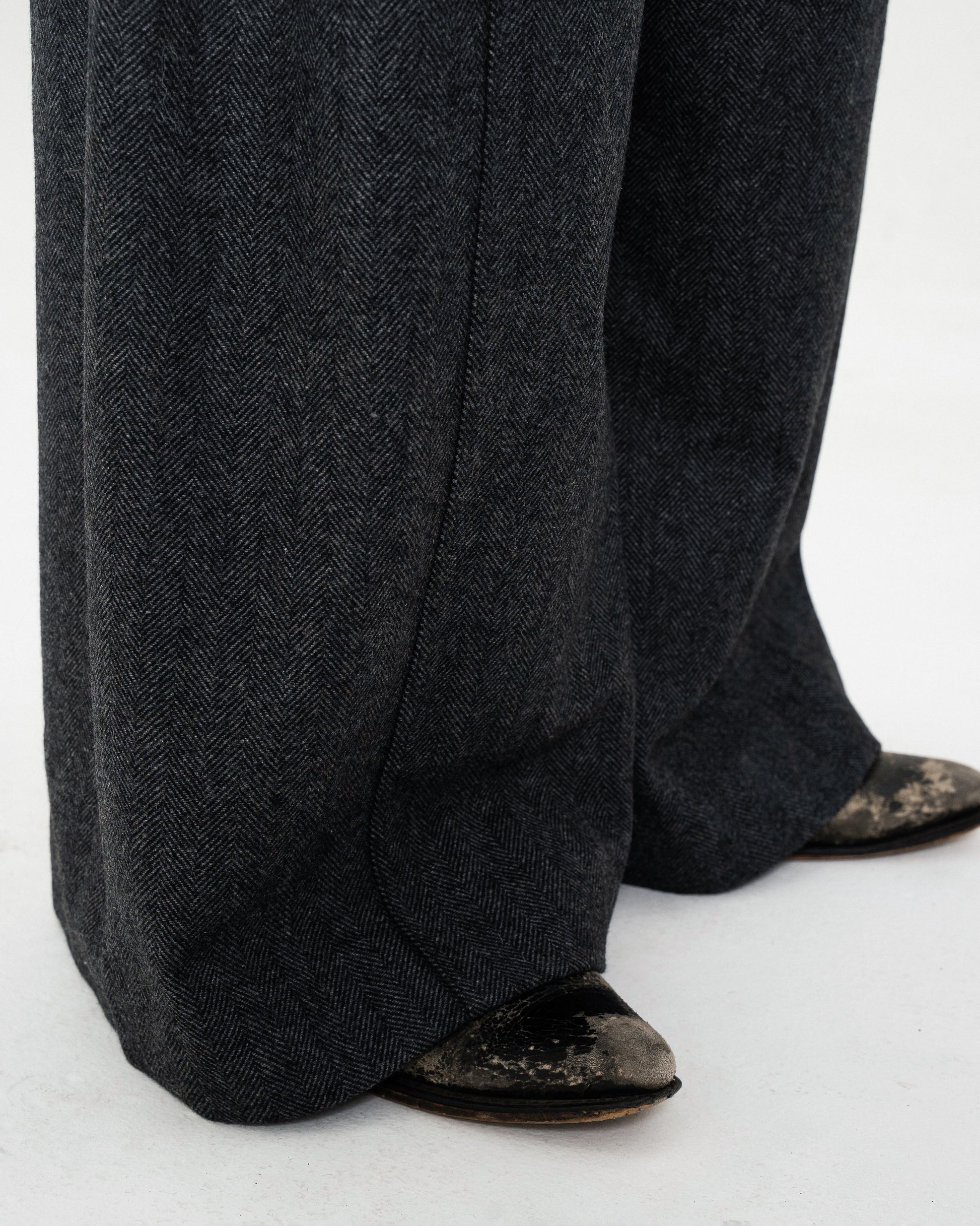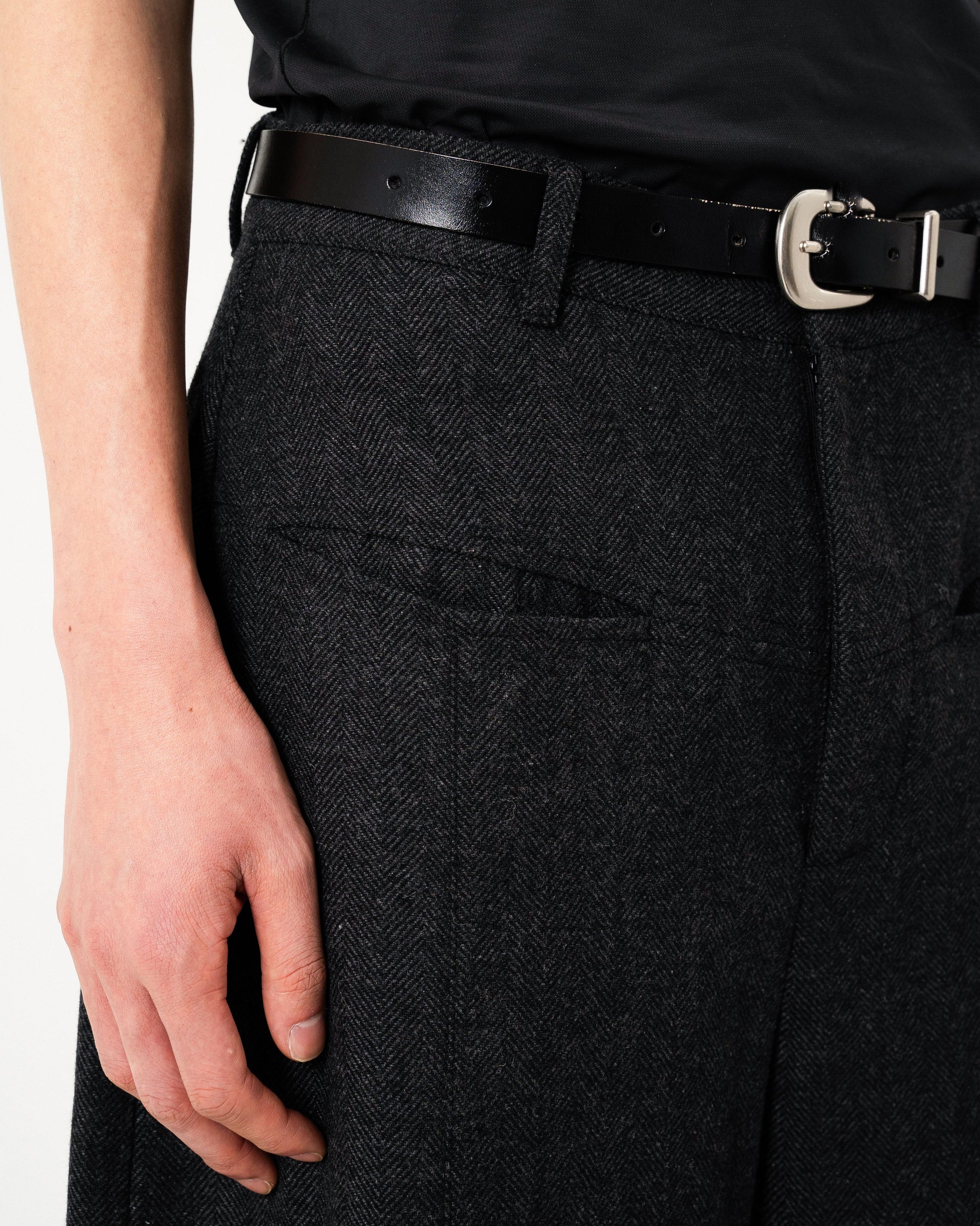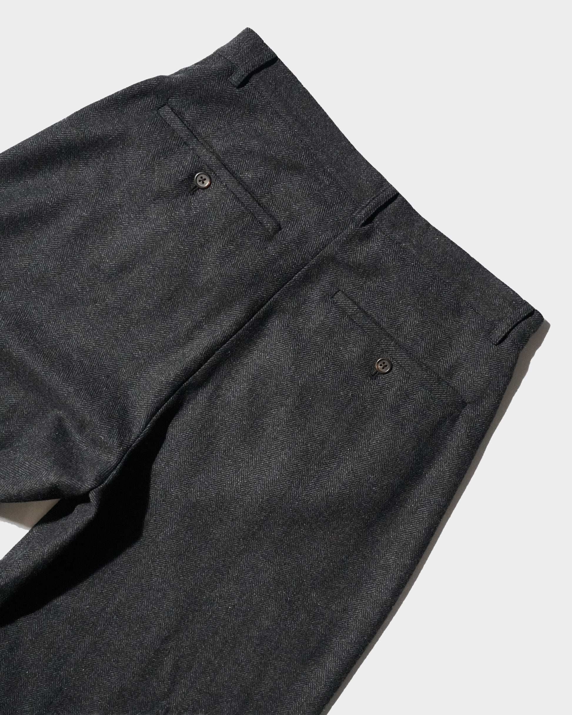 ブランドの定番として展開しているワイドバギーシルエットを、上品なウール混のヘリンボーン素材で再構築した一本。