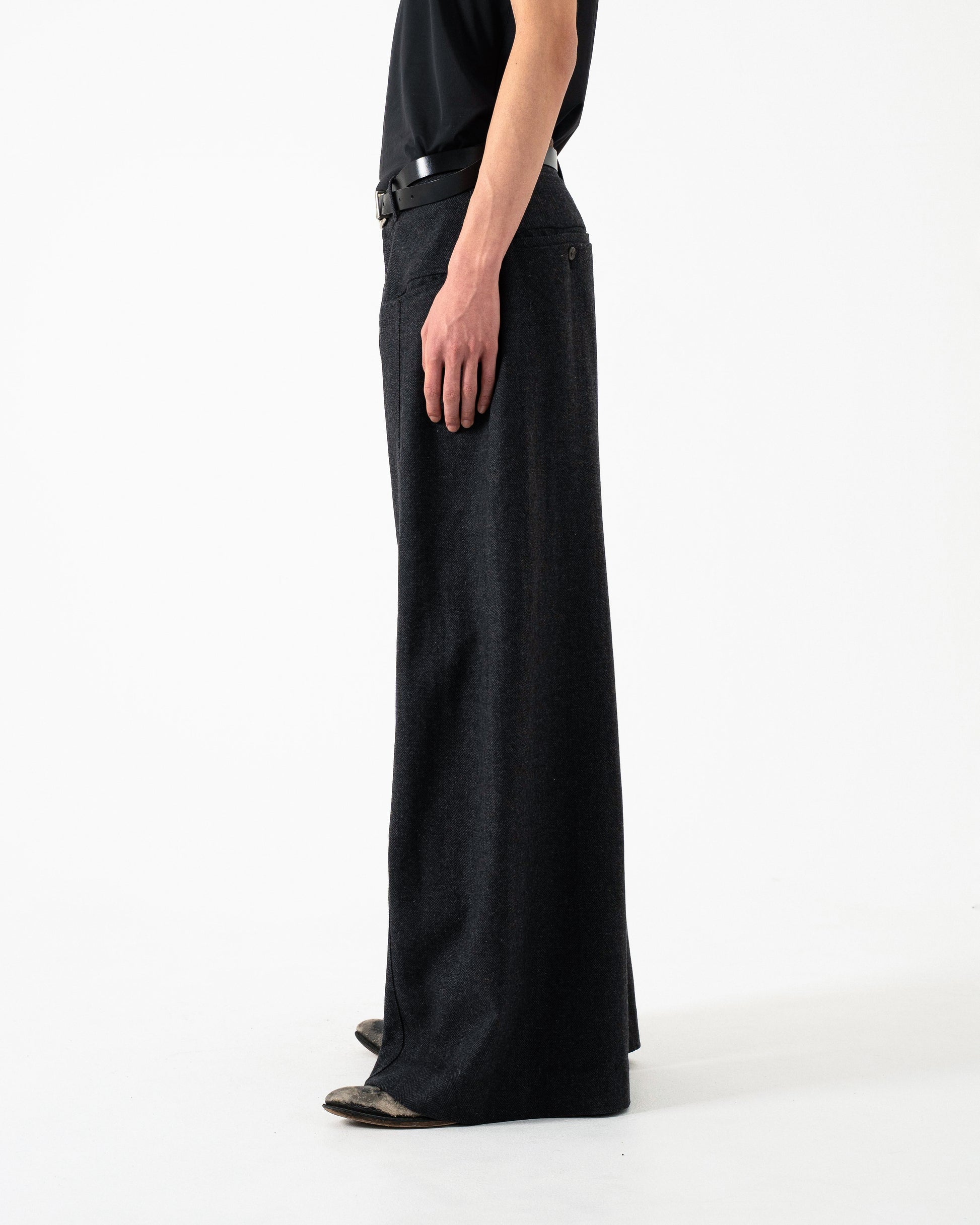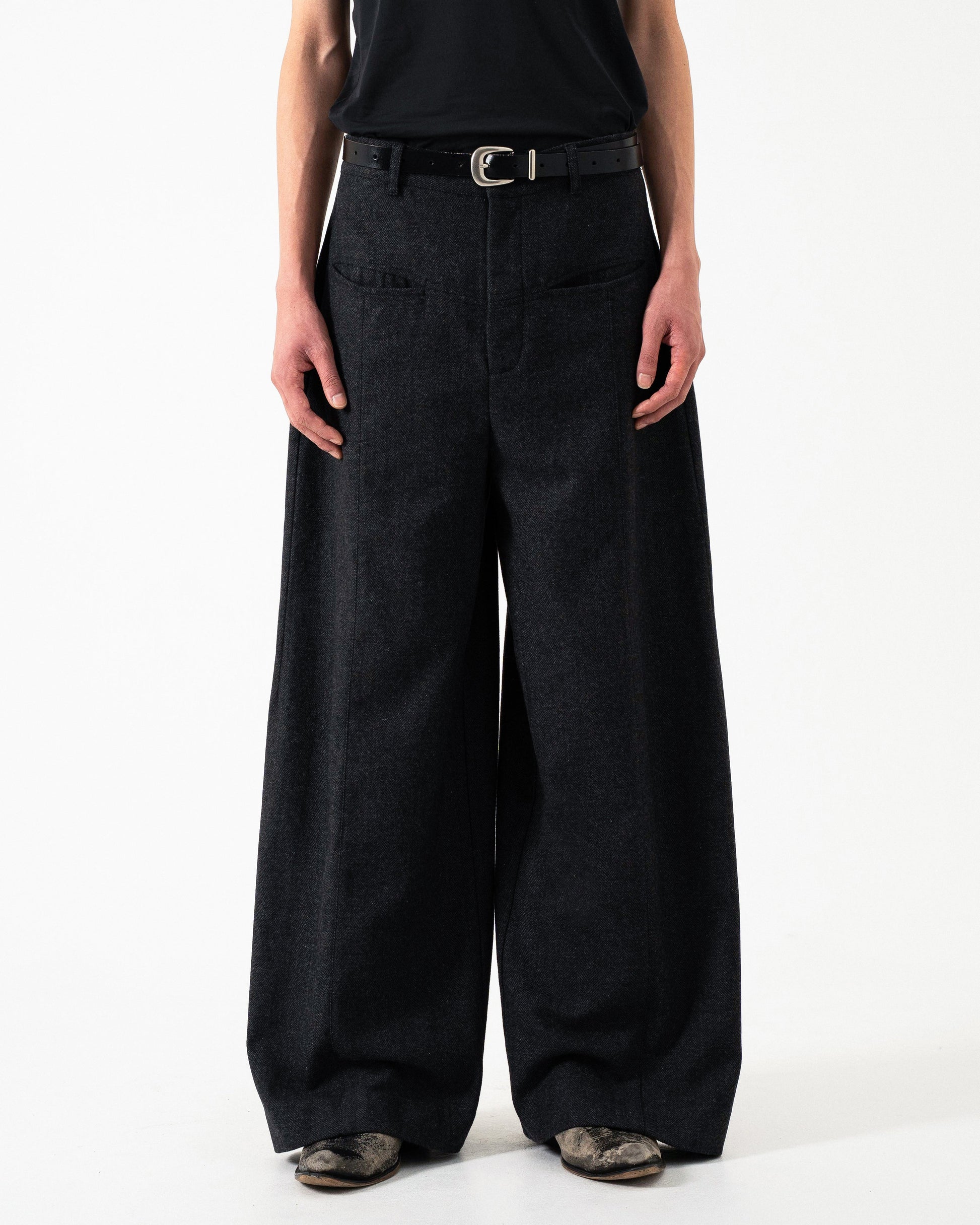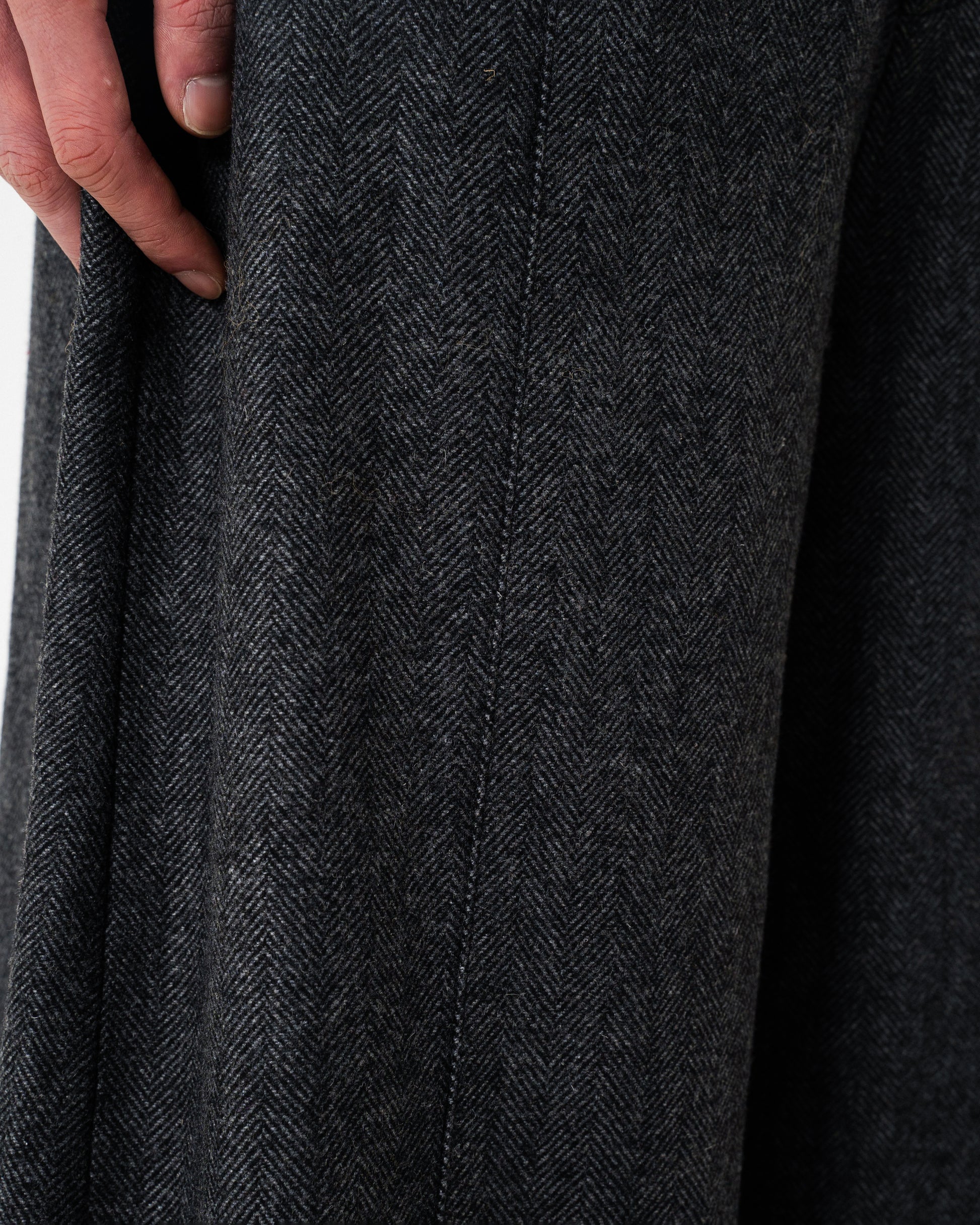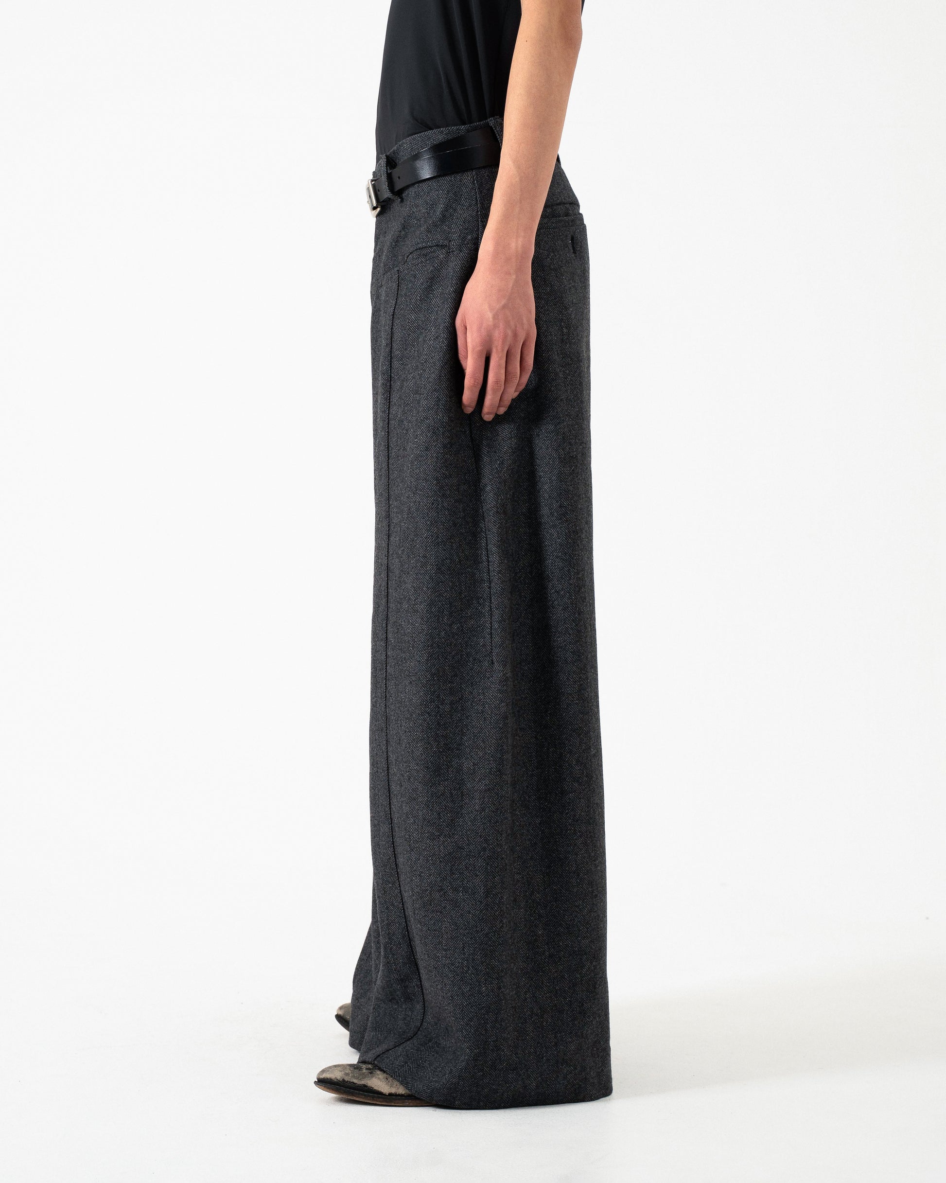 ブランドの定番として展開しているワイドバギーシルエットを、上品なウール混のヘリンボーン素材で再構築した一本。