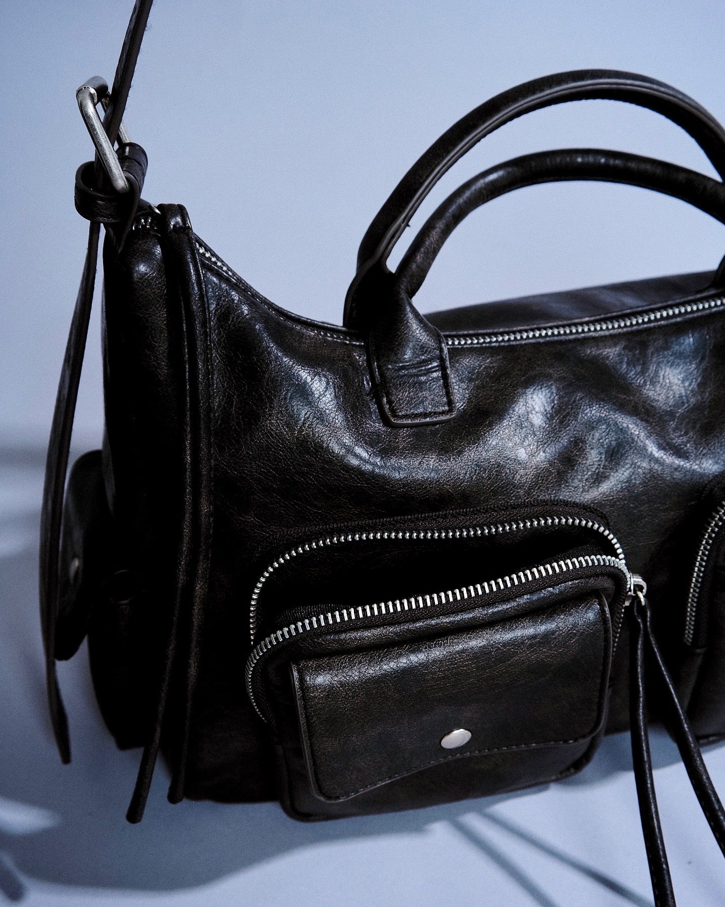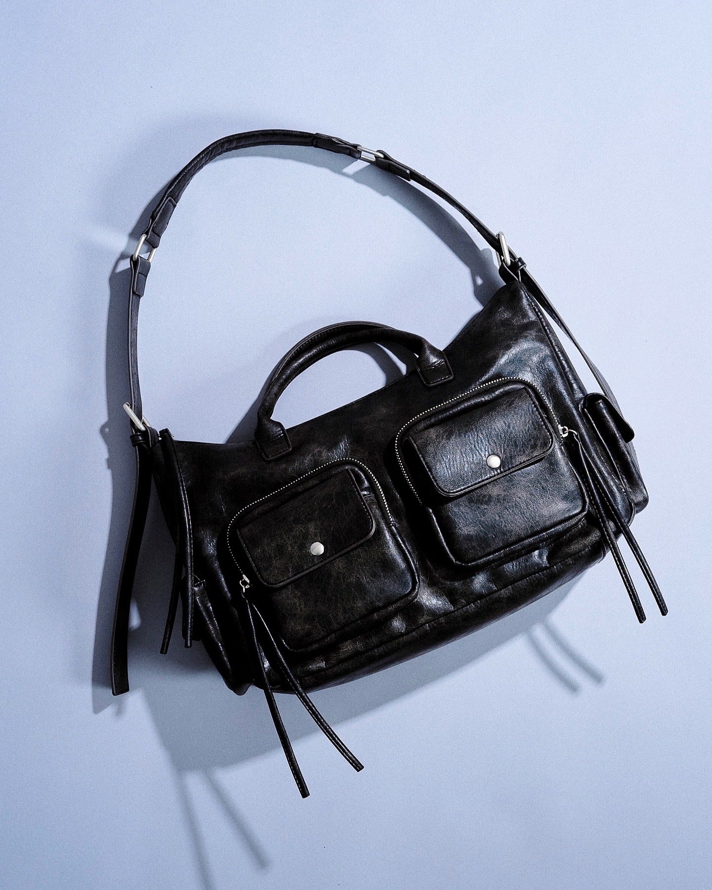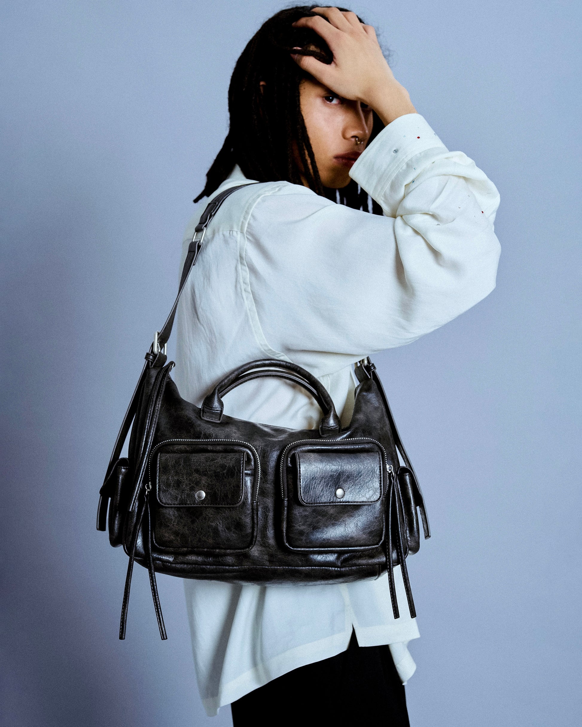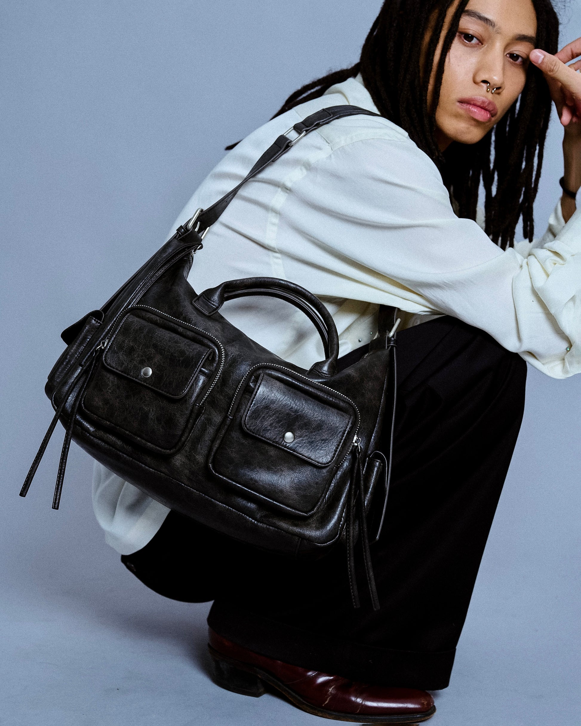 リアルレザーのような厚みを持つPUレザーを使用し、ヴィンテージのような表情と扱いやすさを兼ね備えた一点。ハンドキャリーとしてもショルダースタイルとしても扱える2way仕様に。