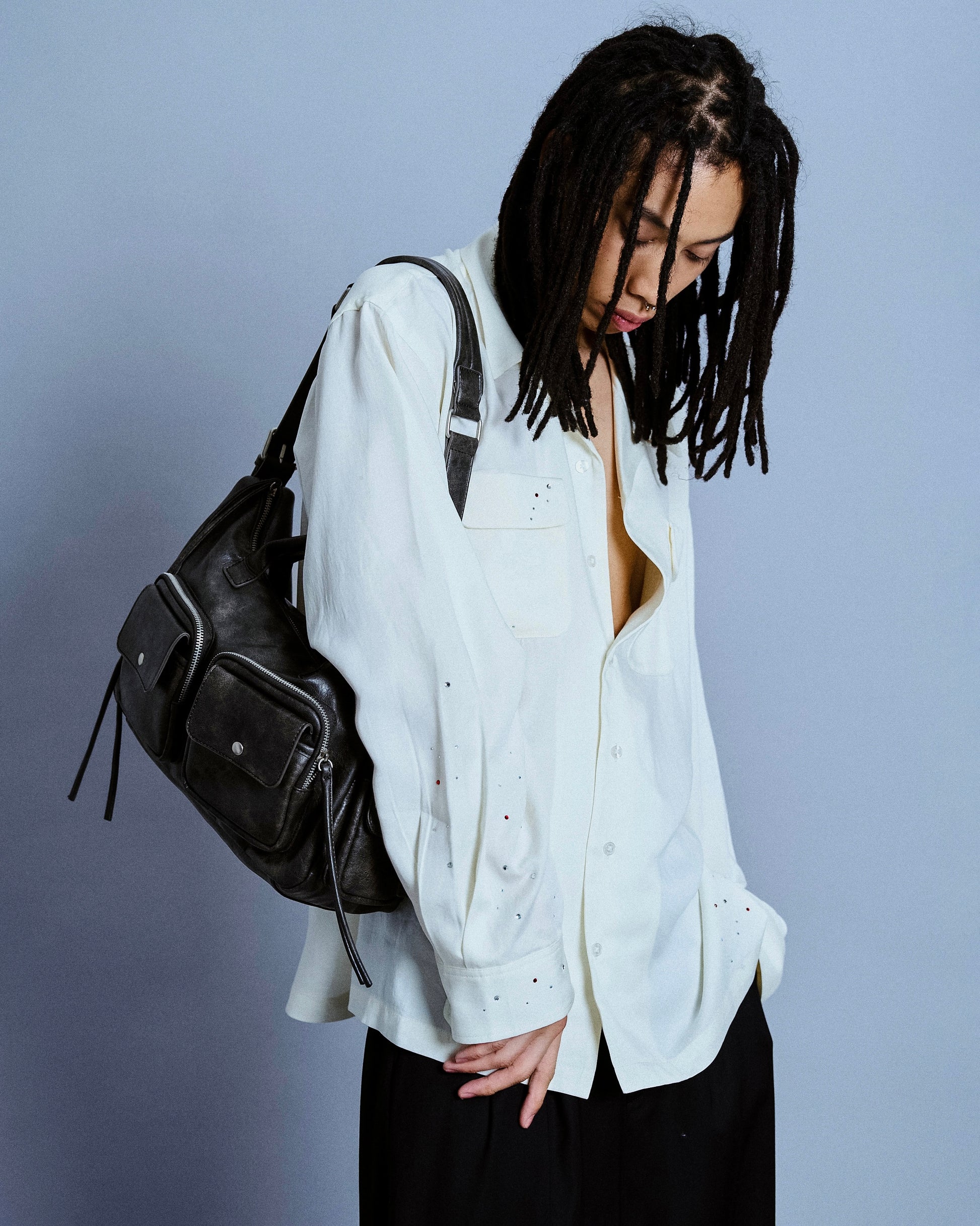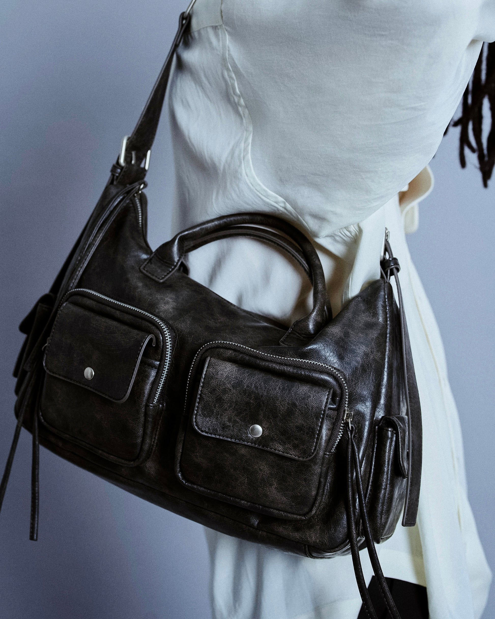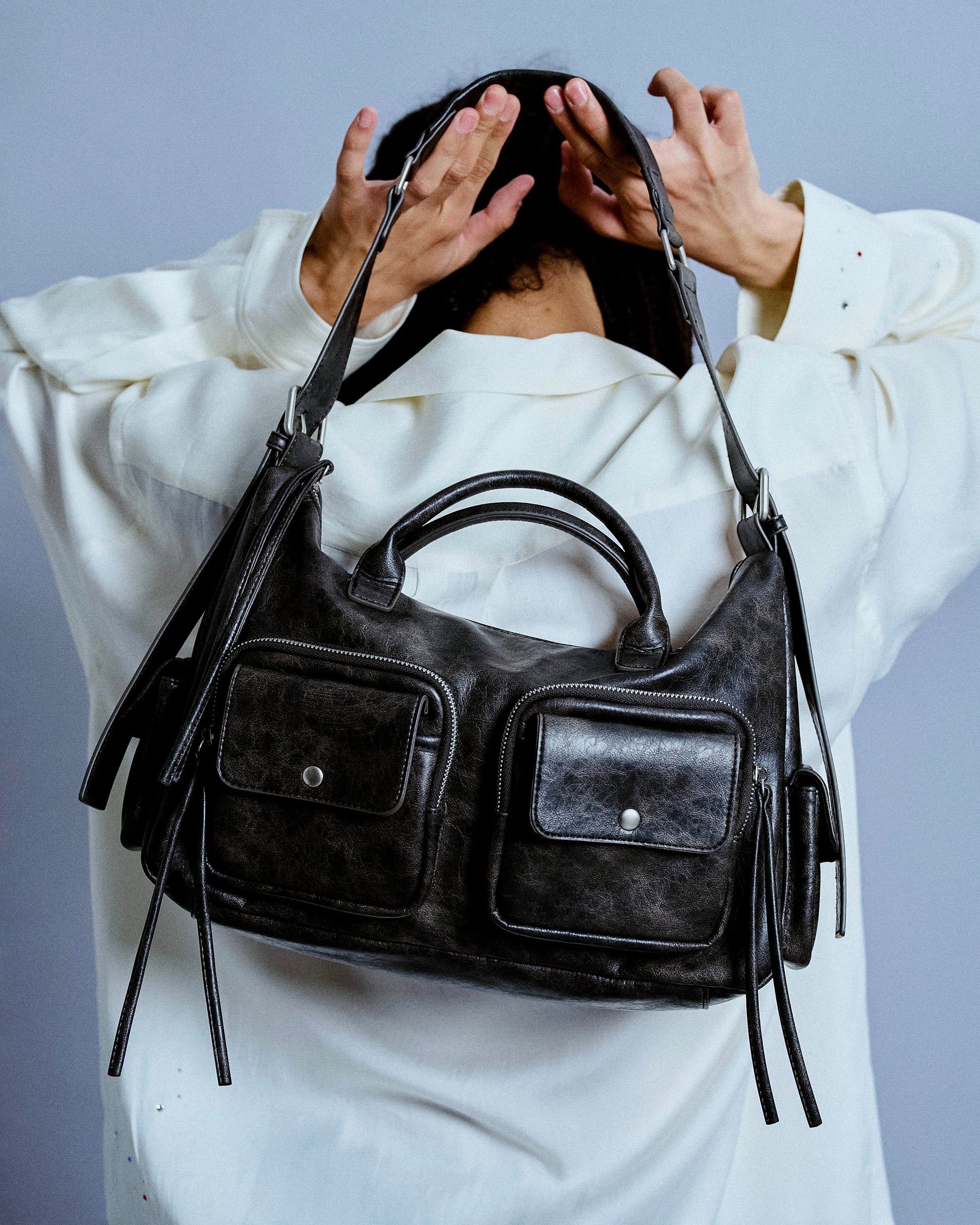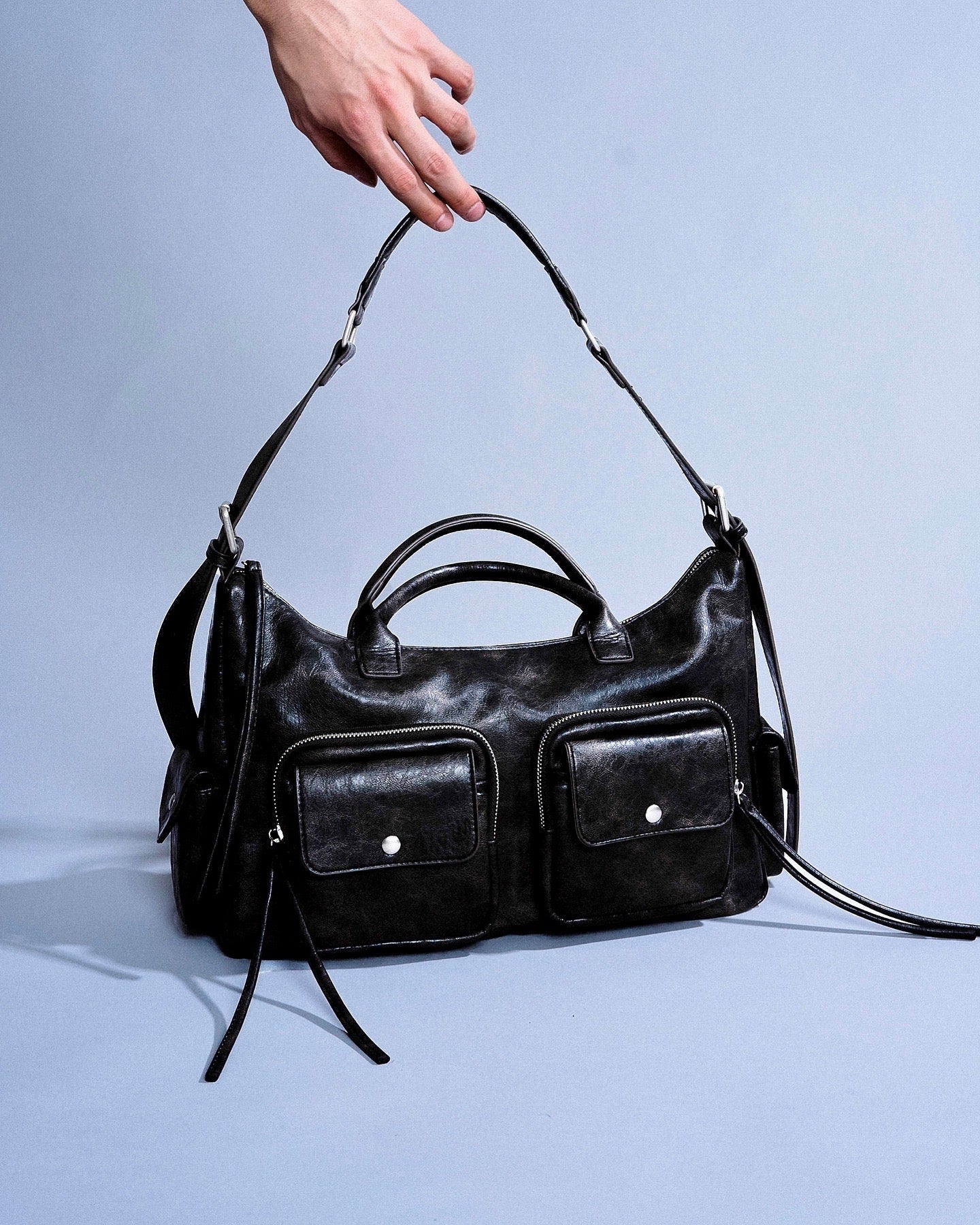 リアルレザーのような厚みを持つPUレザーを使用し、ヴィンテージのような表情と扱いやすさを兼ね備えた一点。ハンドキャリーとしてもショルダースタイルとしても扱える2way仕様に。