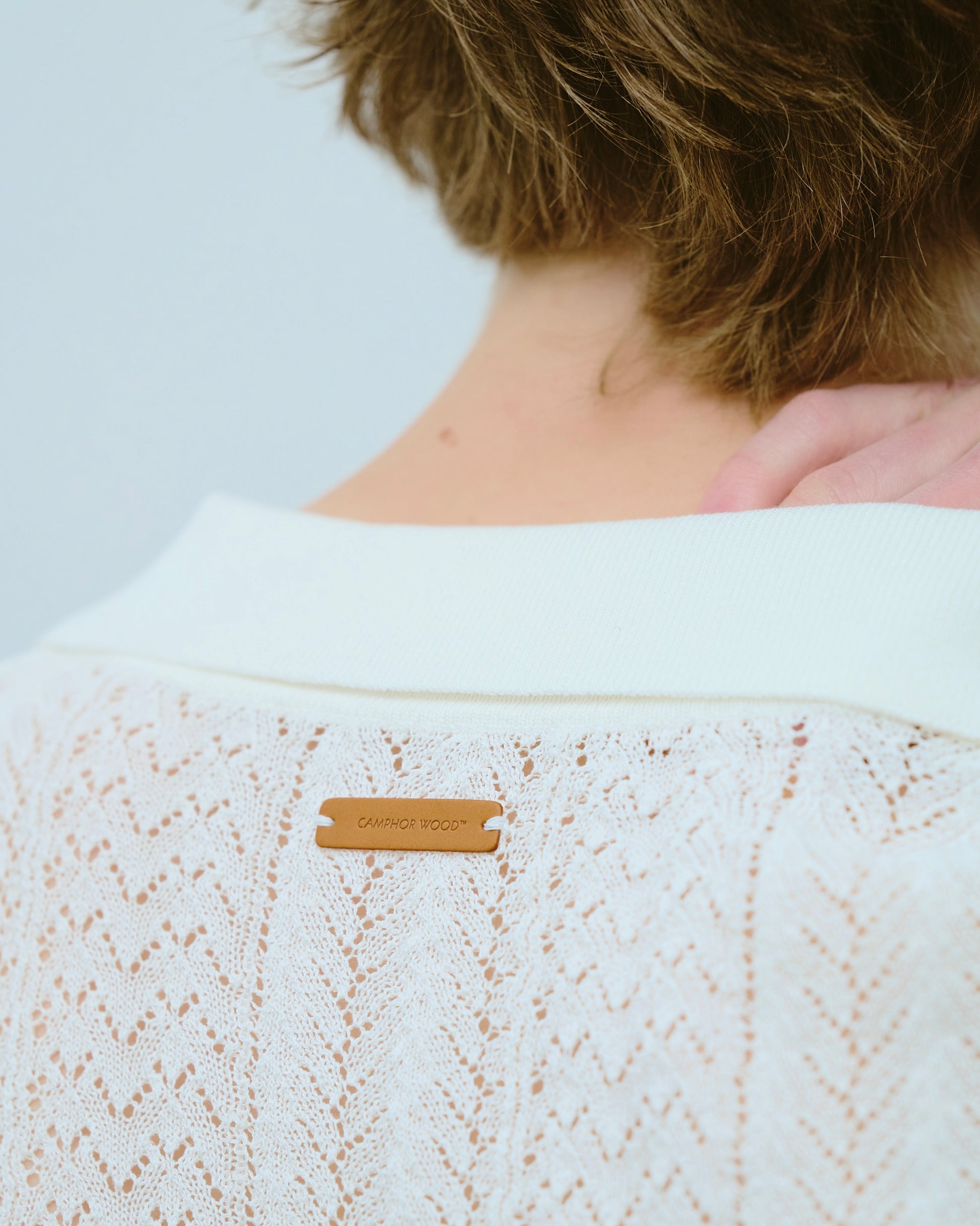 艶のあるシェルボタンを採用し、背面に配されたレザーピスネームをあしらうことでカジュアルながらも上品な印象に仕上げた。