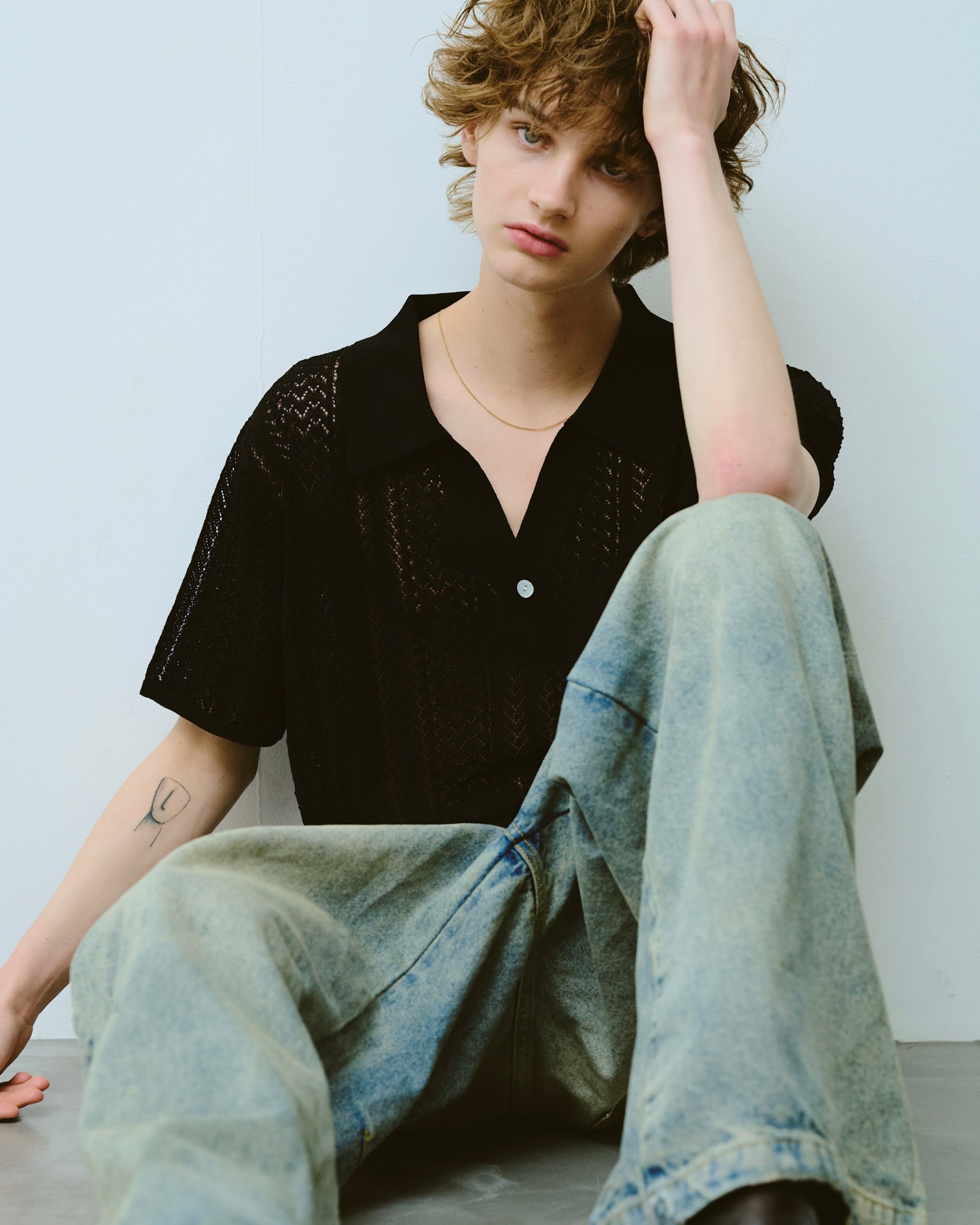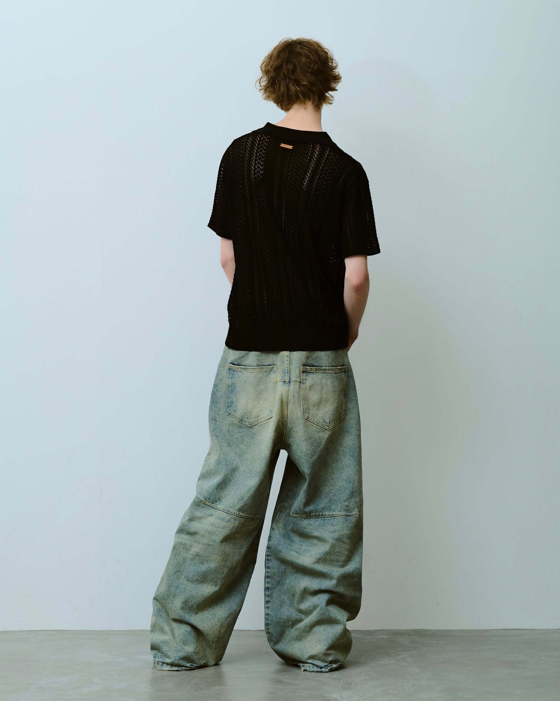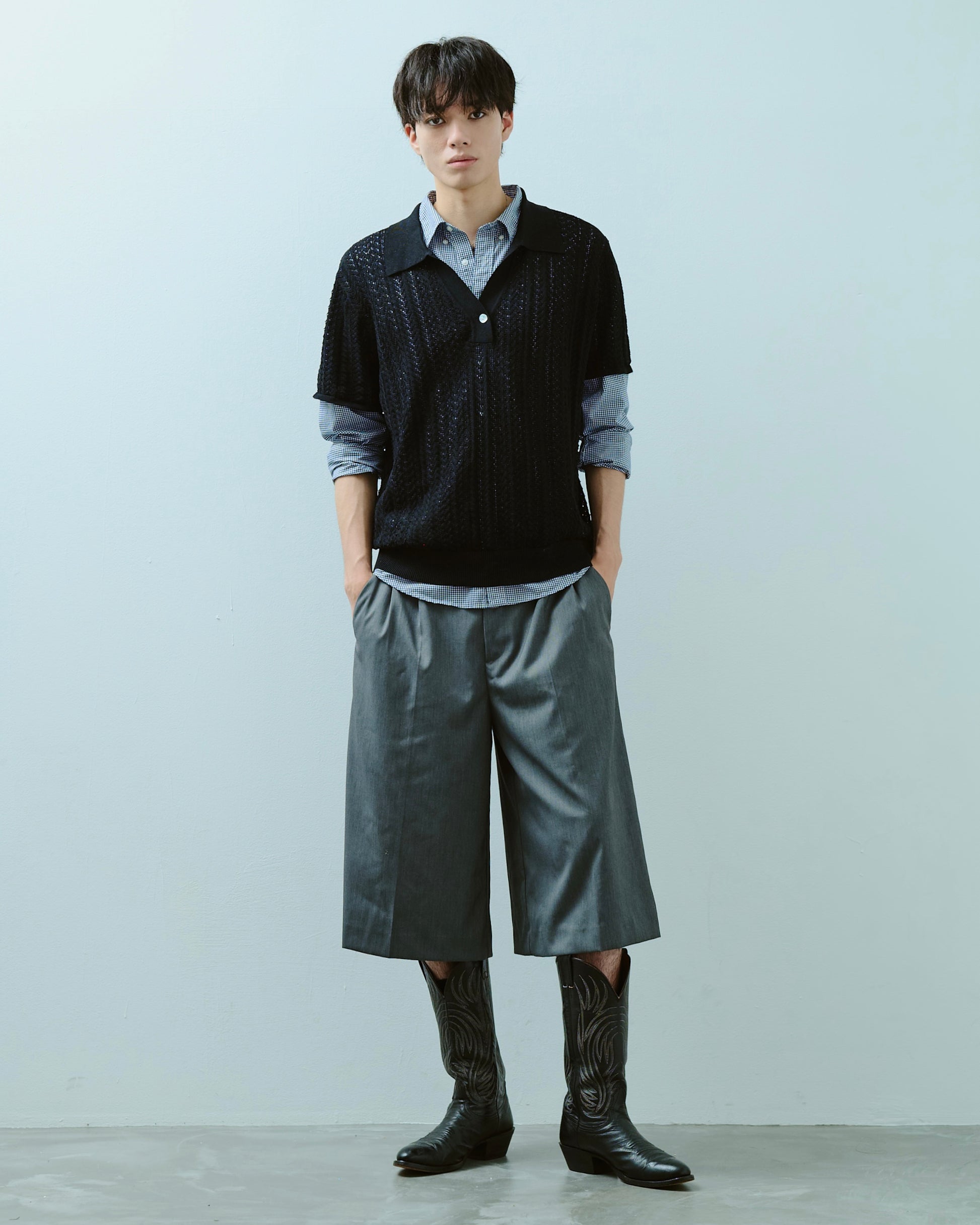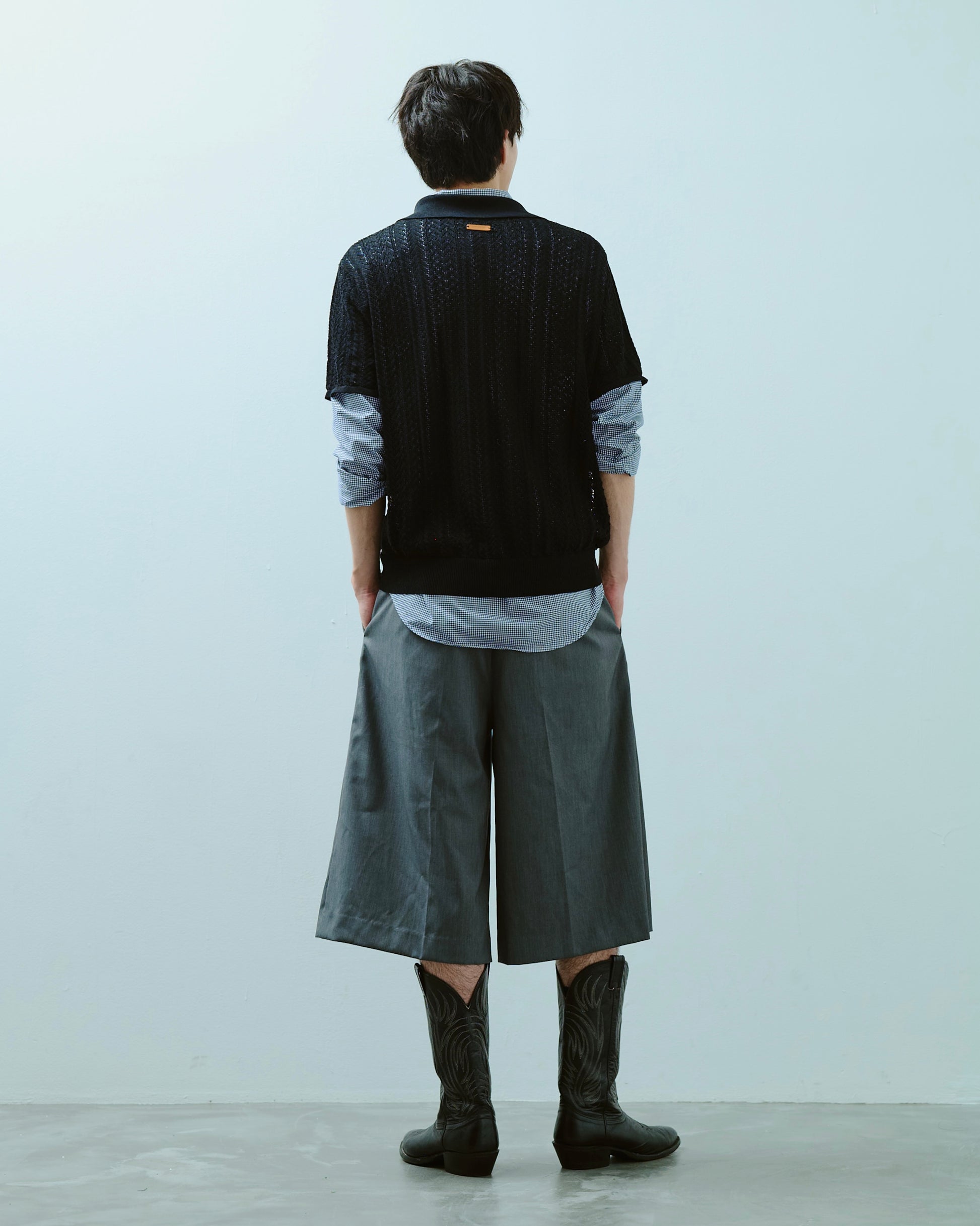 1970年代のスキッパーニットをデザインソースにしつつ、ゲームシャツのスキッパーディテールを加えることで、古さを感じさせない現代的な表情に仕上げた。