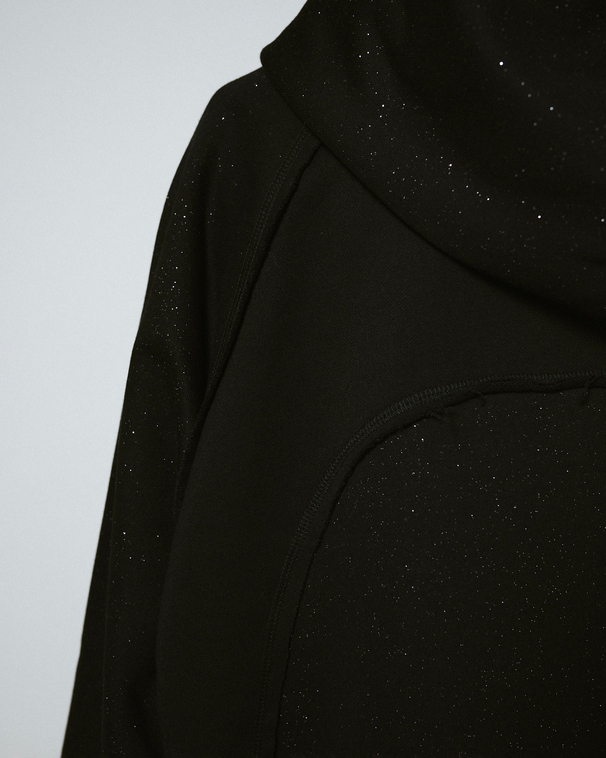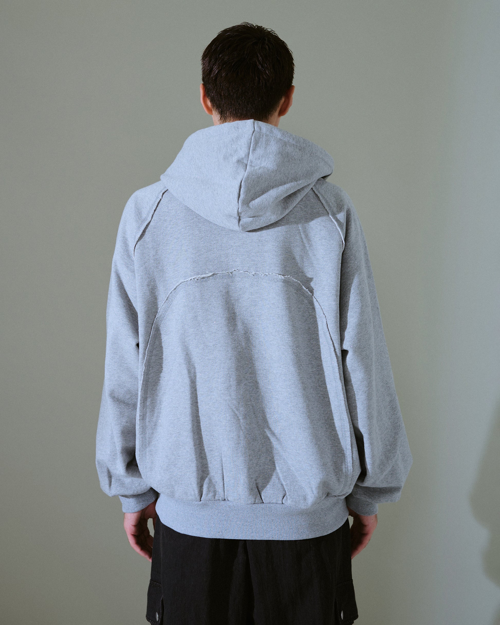 ラグランの切り替えを強調したデザインが特徴で、縫い代を外側に出したインサイドアウト仕様によって、古着のような使用感を演出している。