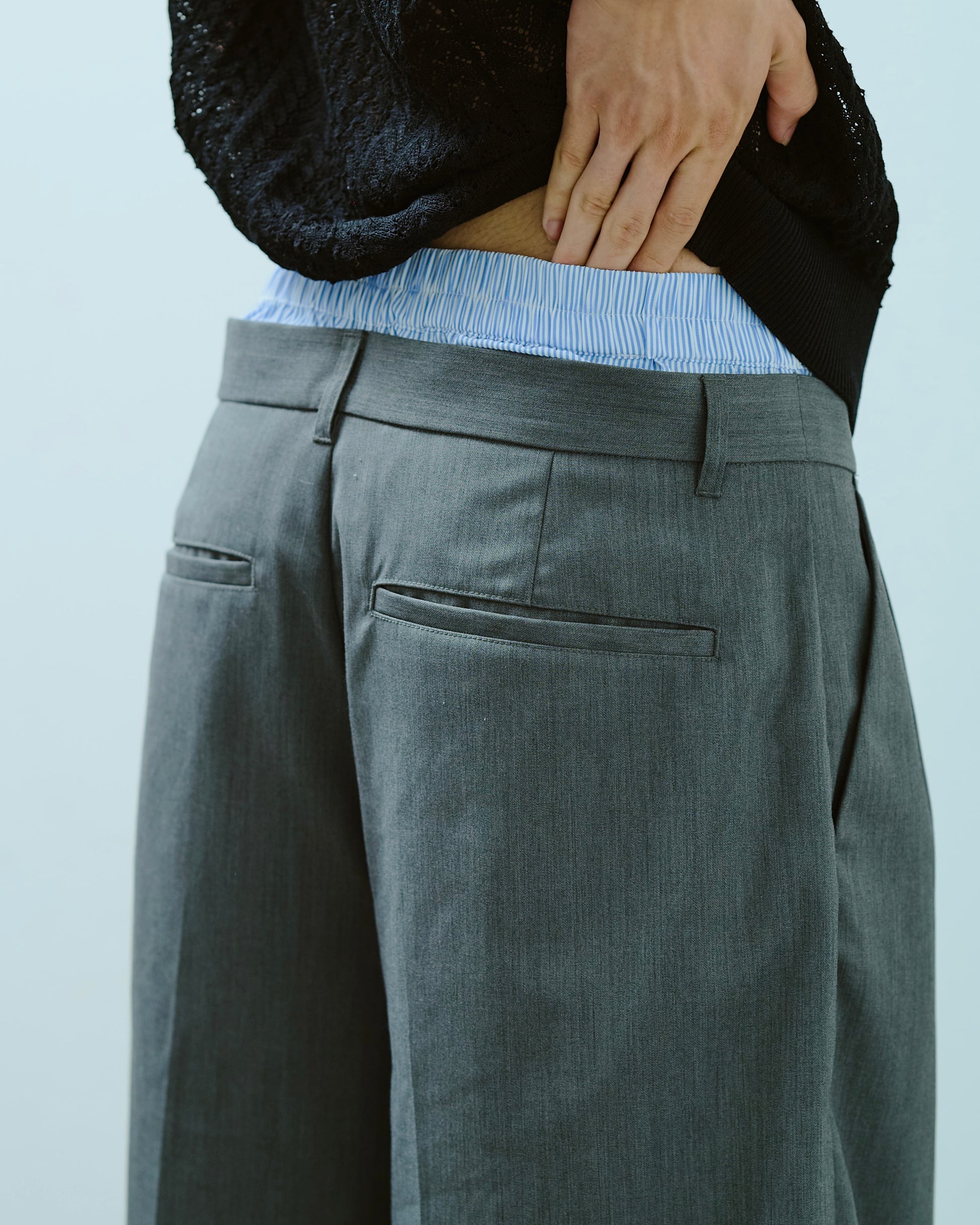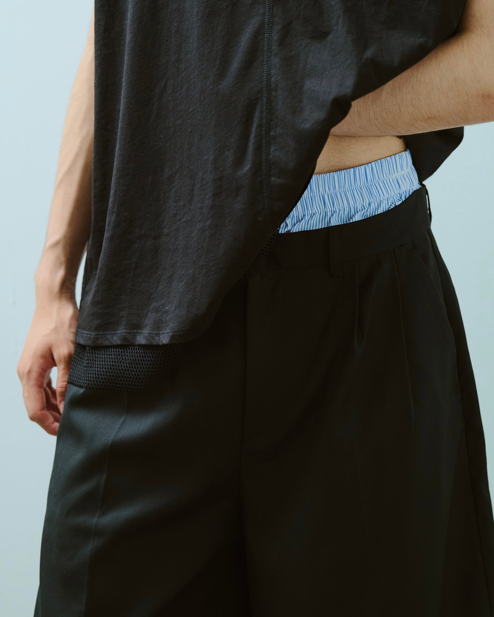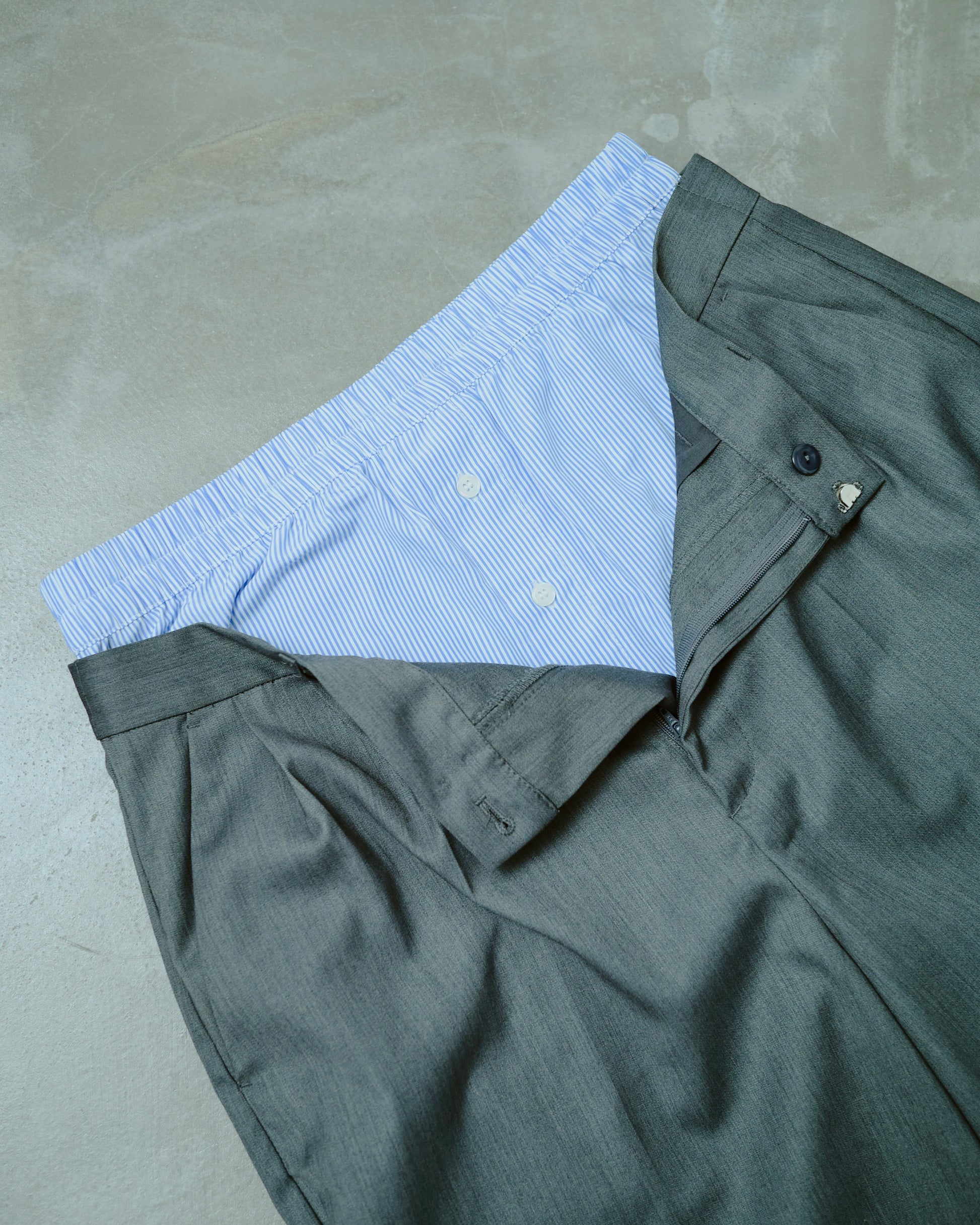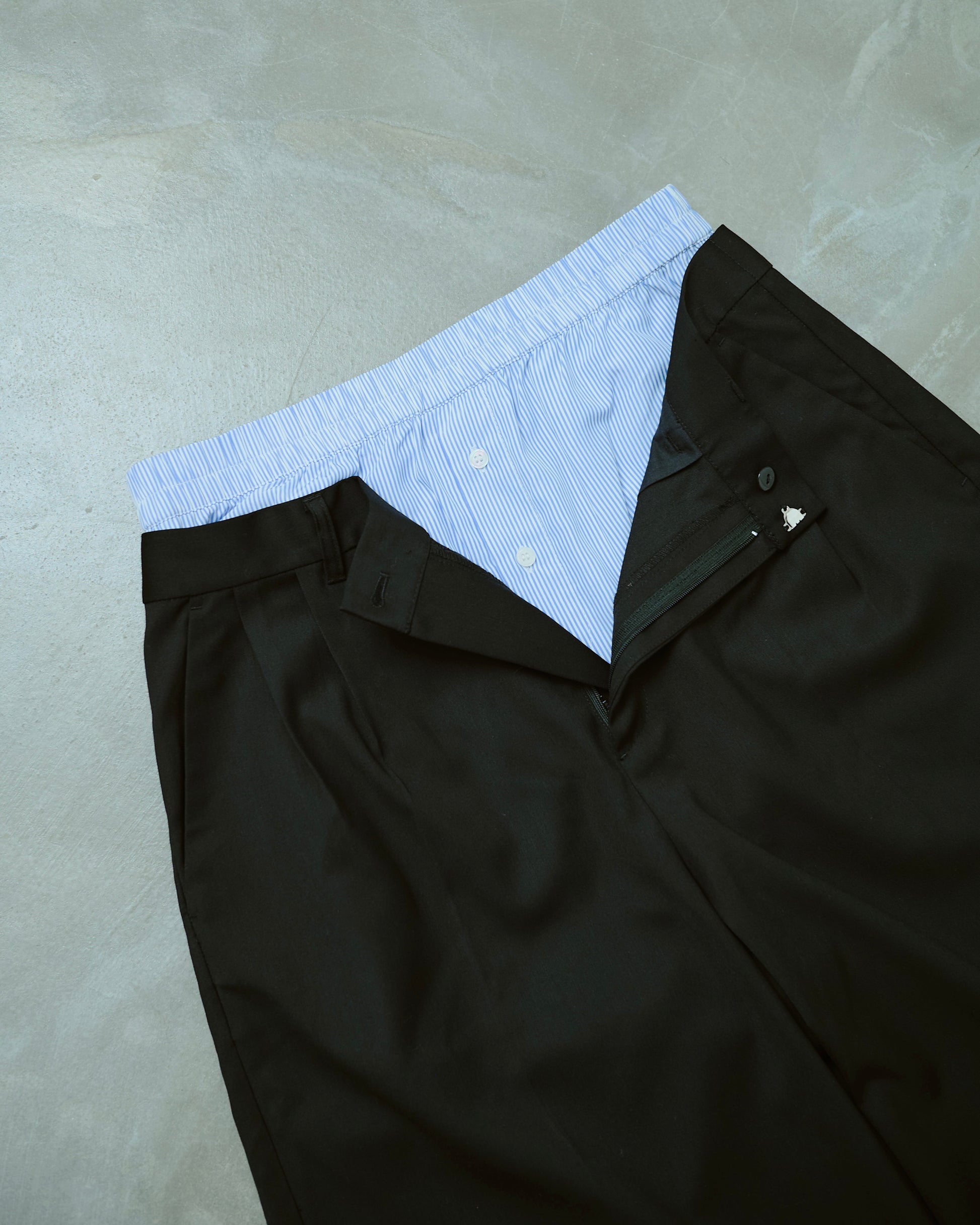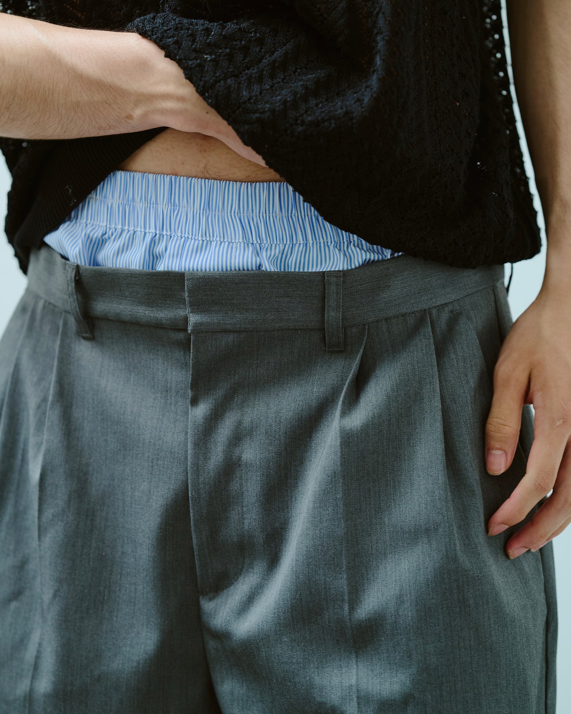 腰元には、インナーとしてトランクスをドッキングし、夏に単調になりがちなスタイリングに奥行きを生むアクセントピースに施した。
