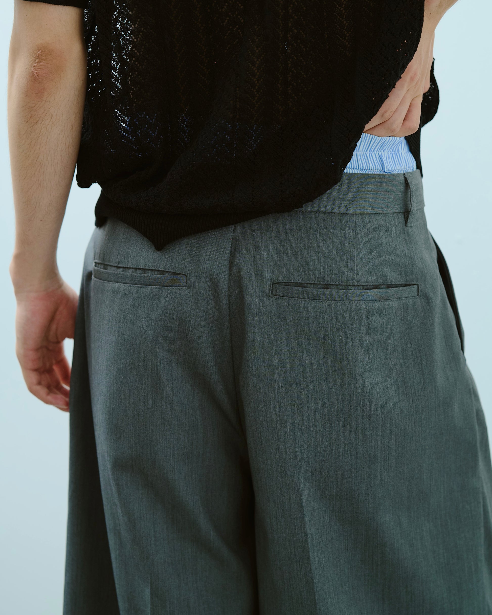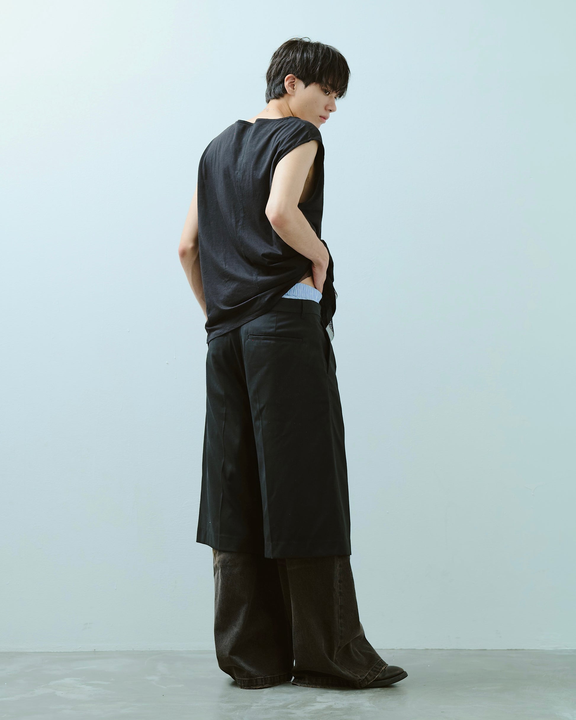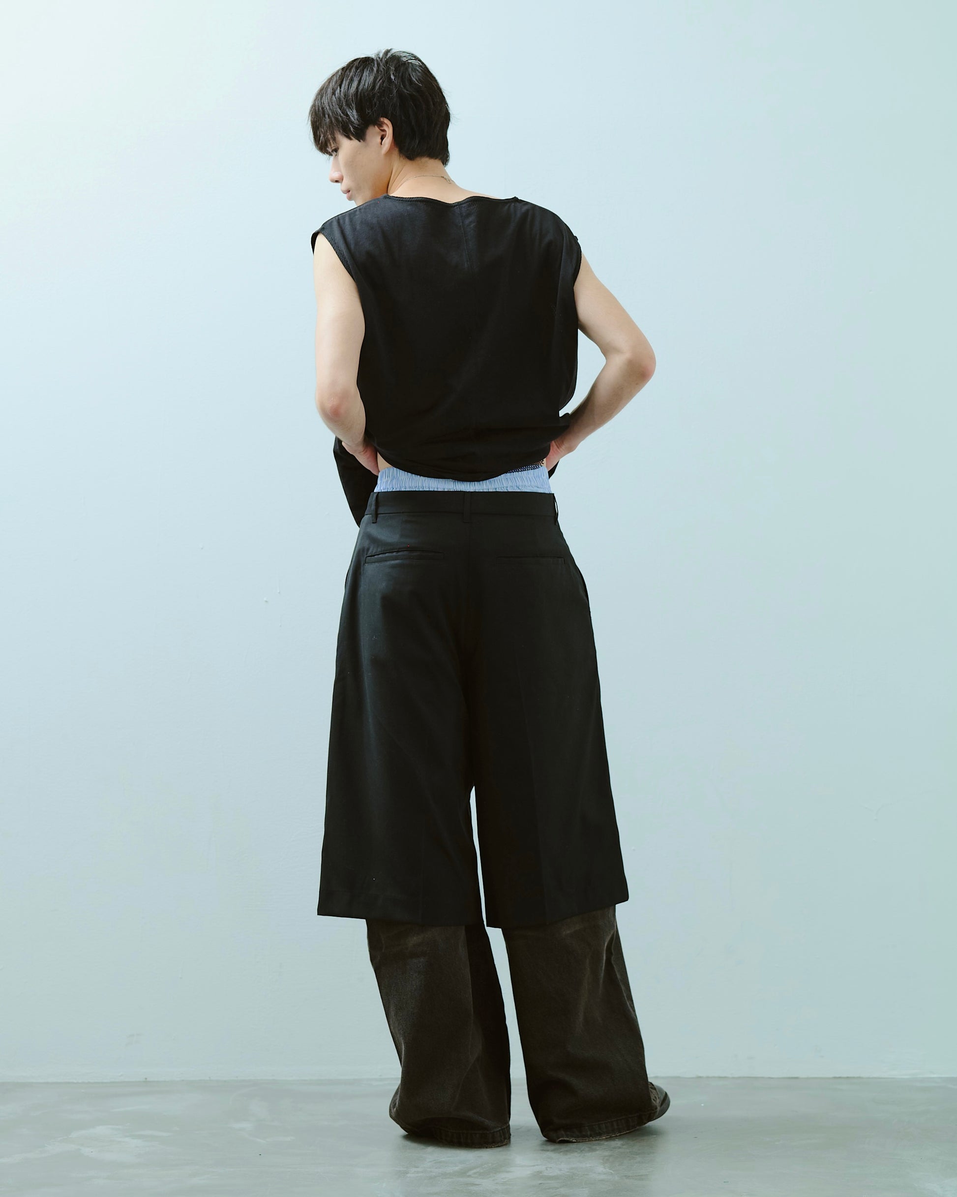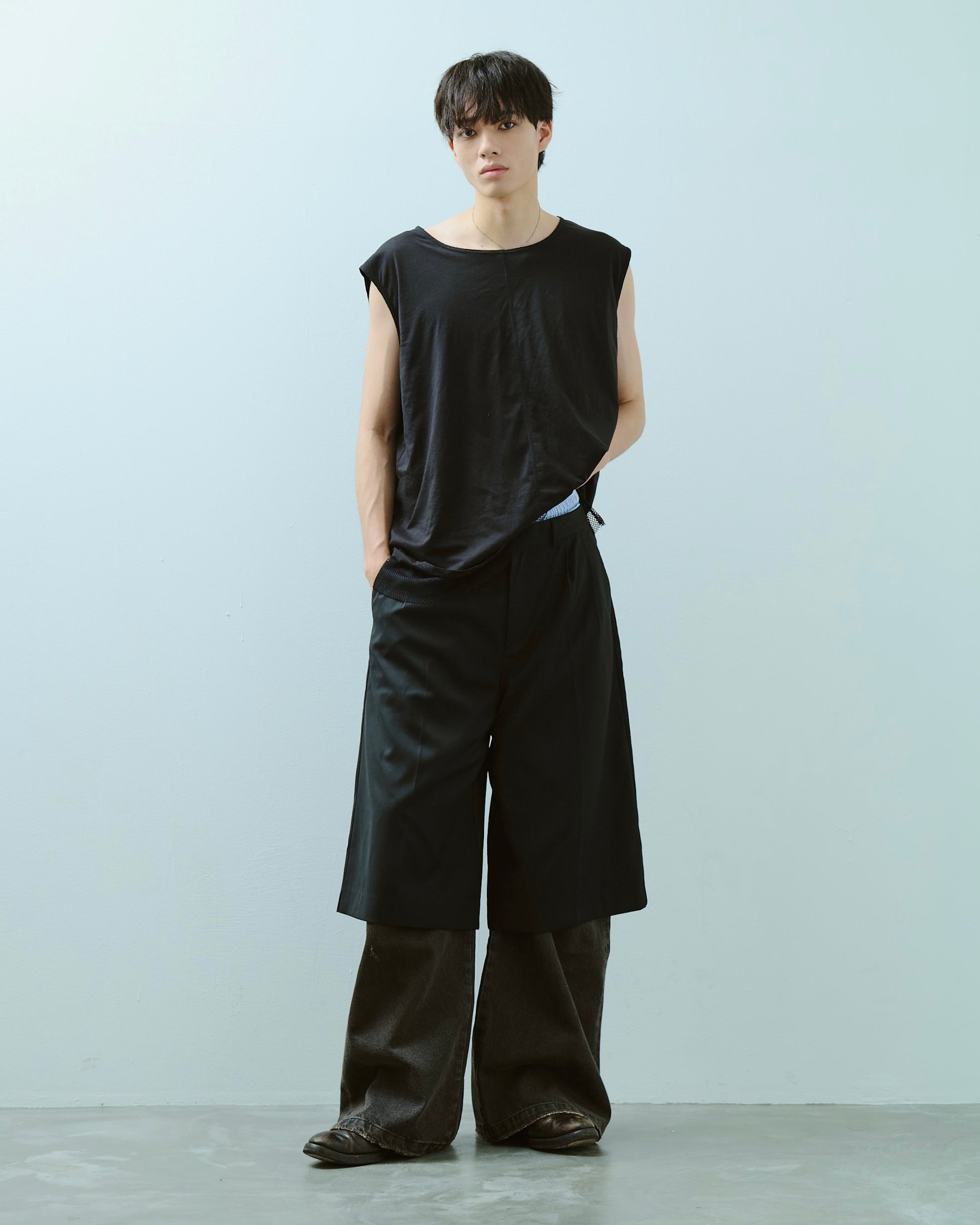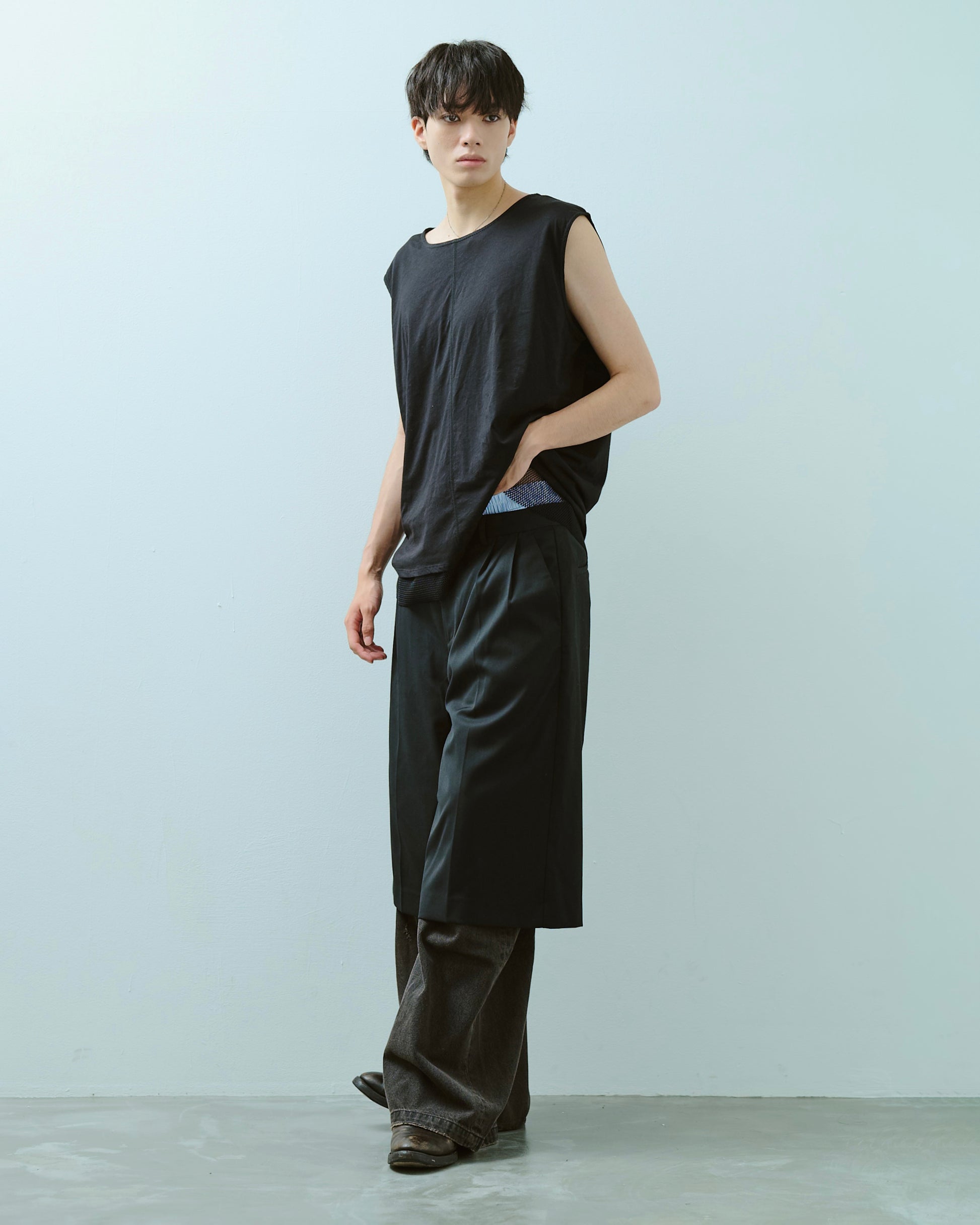 腰元には、インナーとしてトランクスをドッキングし、夏に単調になりがちなスタイリングに奥行きを生むアクセントピースに施した。
