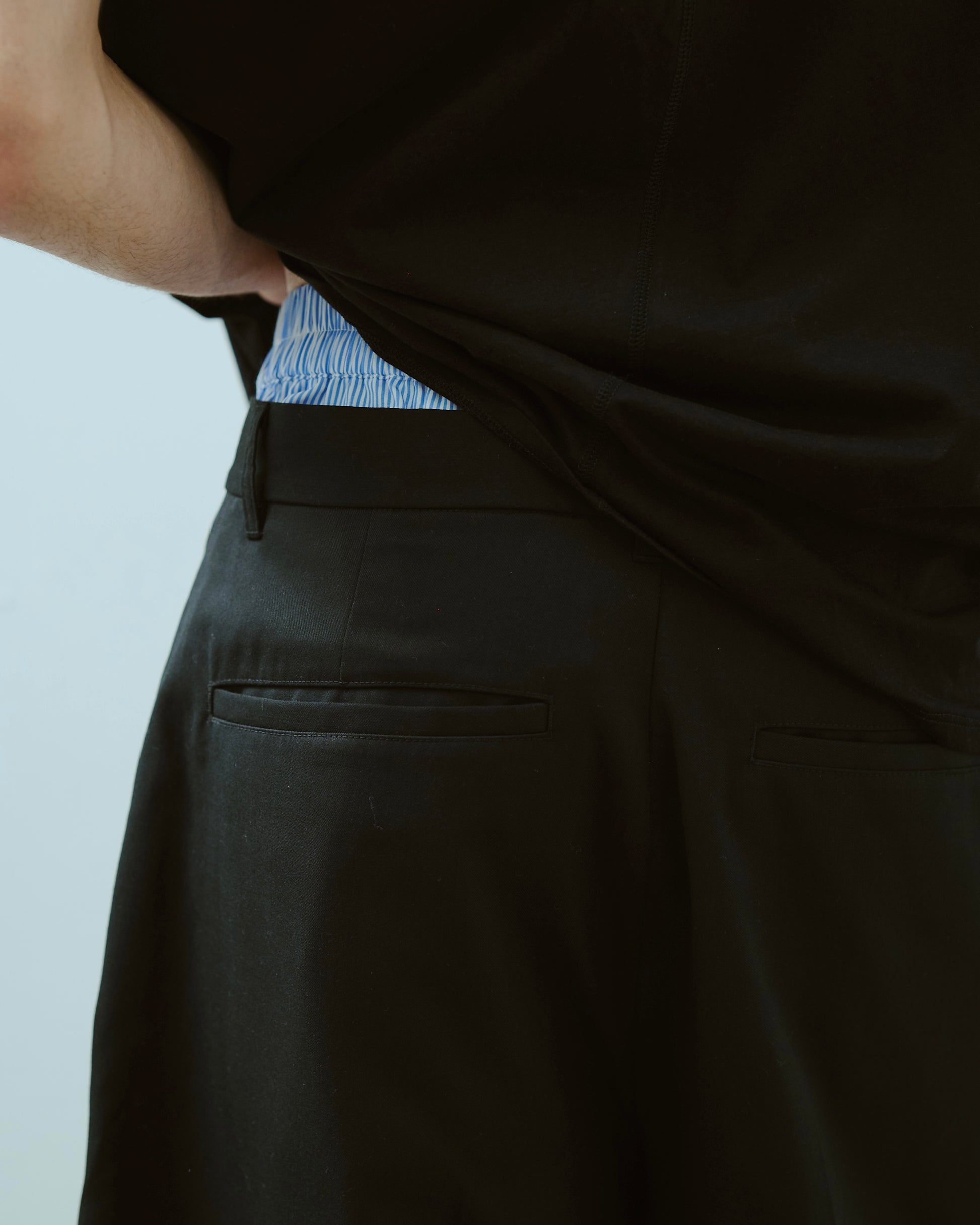また素材感は、従来のスラックス素材に比べて厚みとハリ感のある生地を採用する事で、裾に向かって広がる立体的なバギーシルエットに仕上げた。