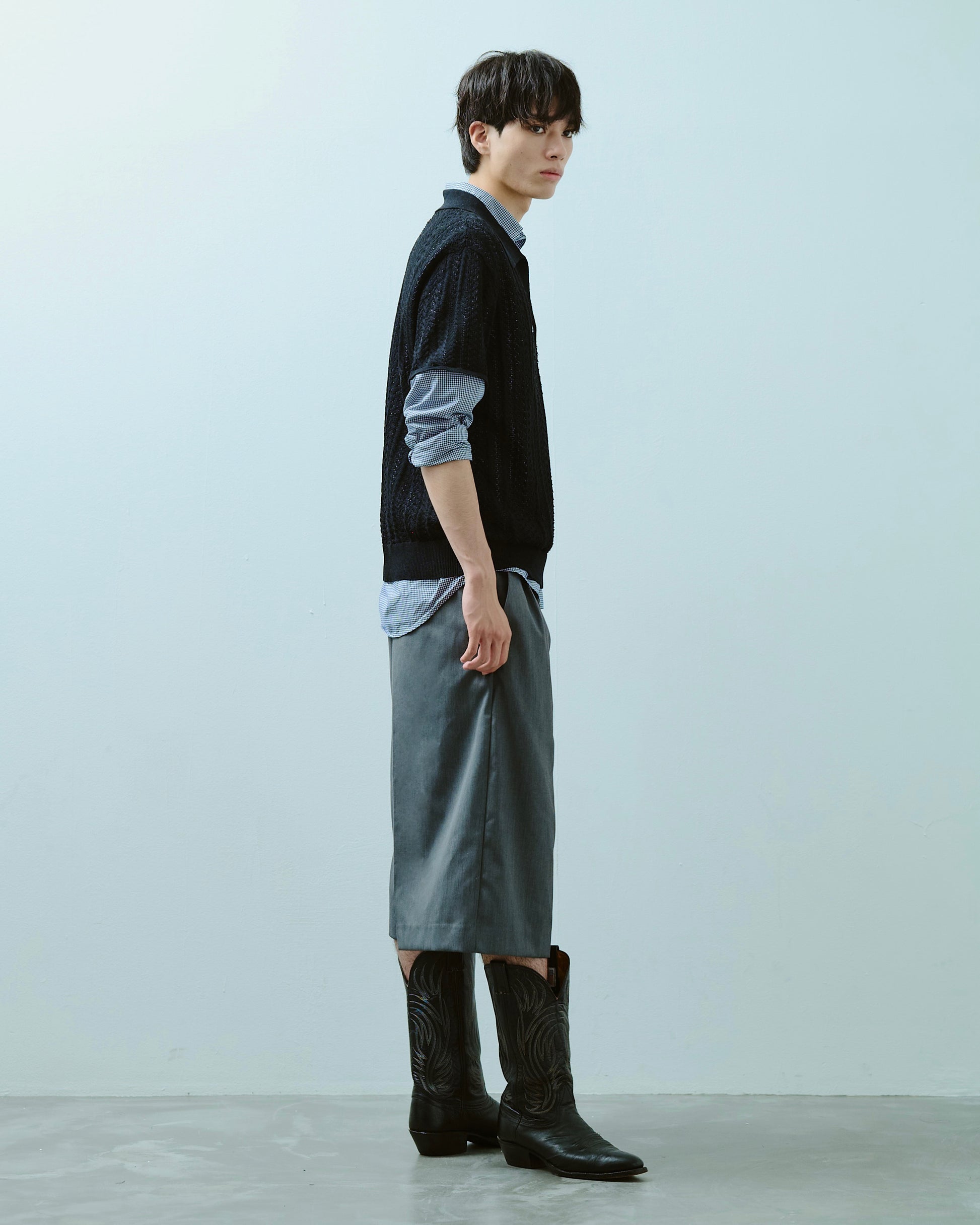 足元にはウエスタンブーツやロングブーツはもちろん、ローファーやボリュームスニーカーとの相性も良い本アイテム。