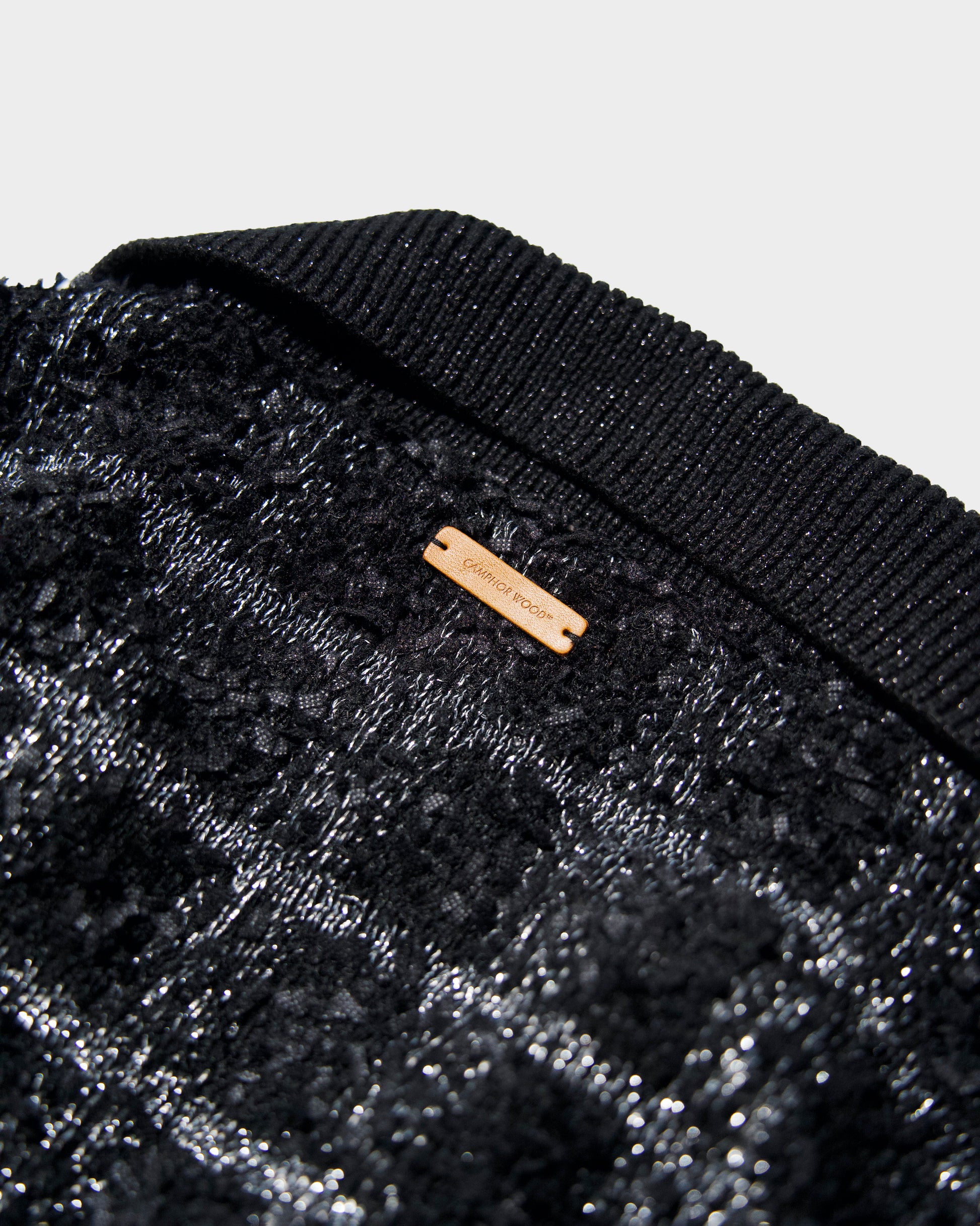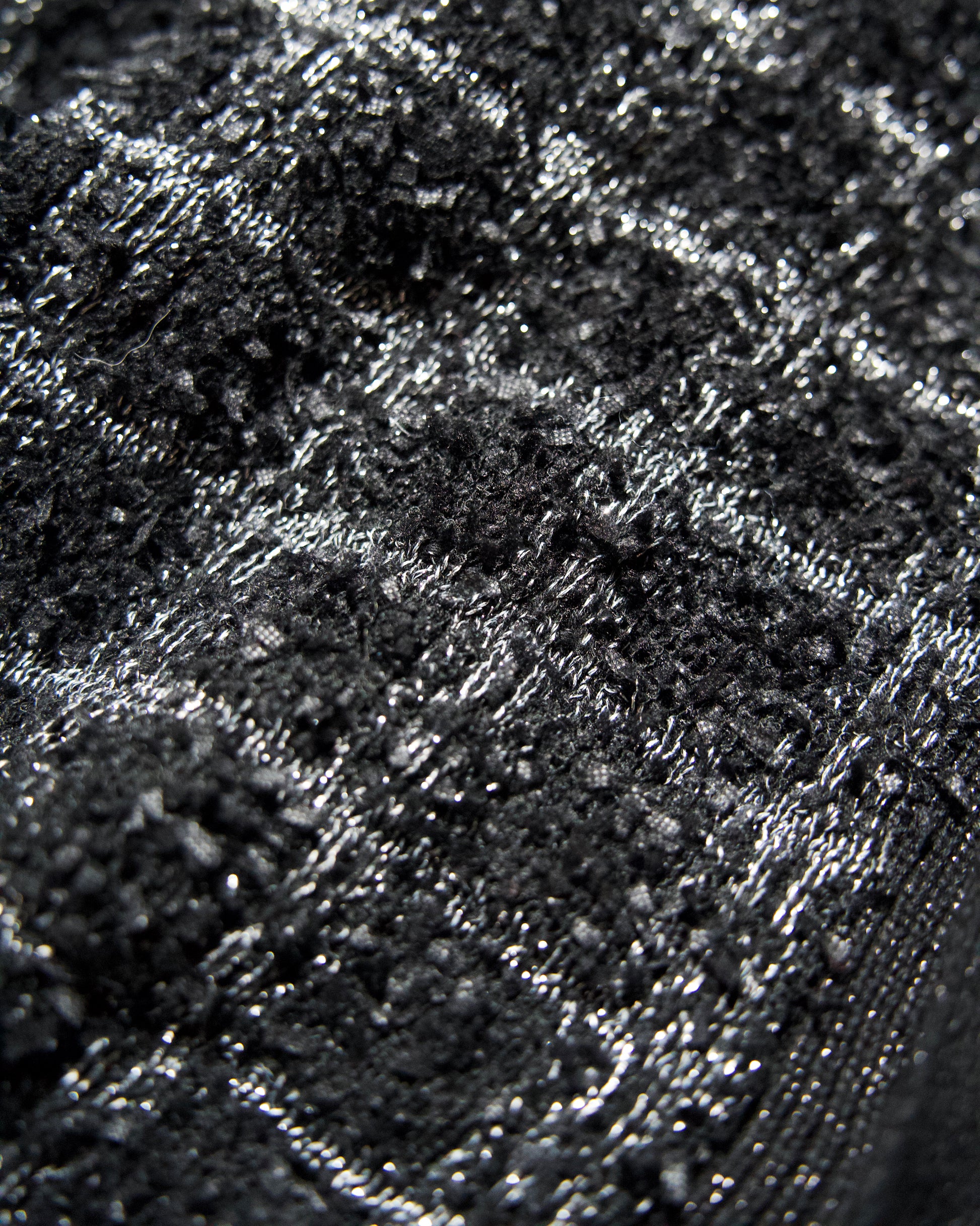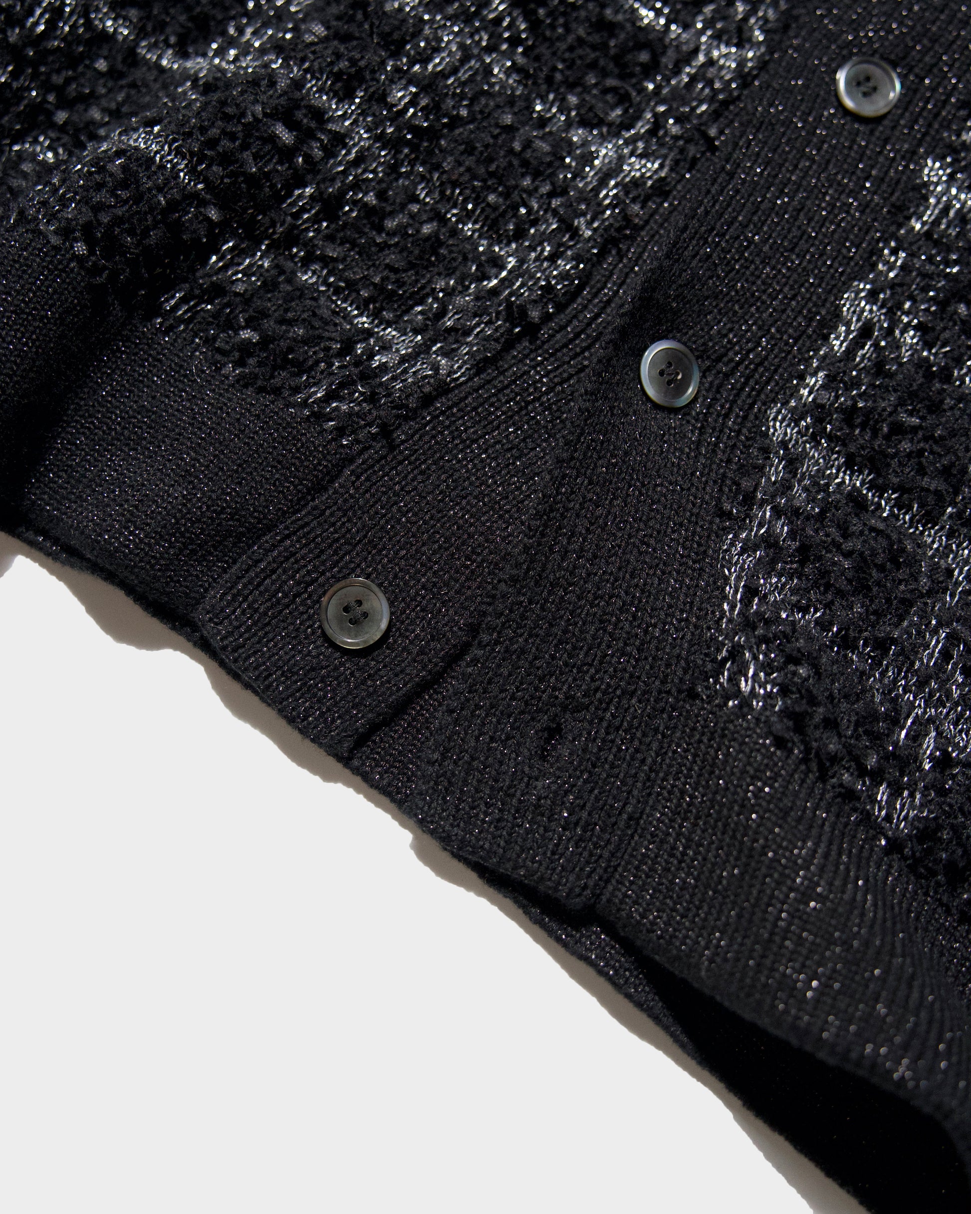 ラメ糸や意匠糸など複数の糸を複雑に編み込むことで、生地に豊かな立体感と奥行きを与え、上品な艶をまとわせている。