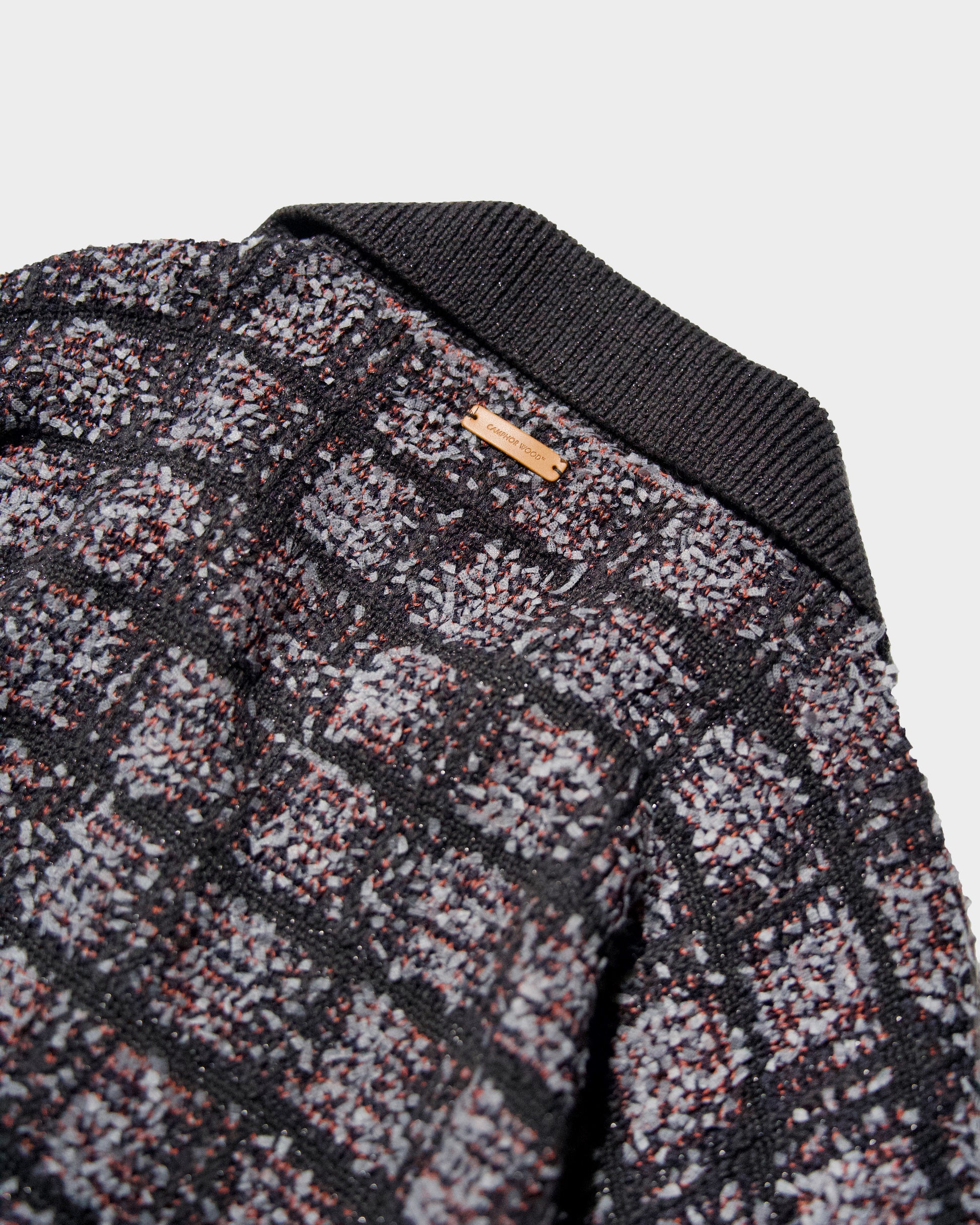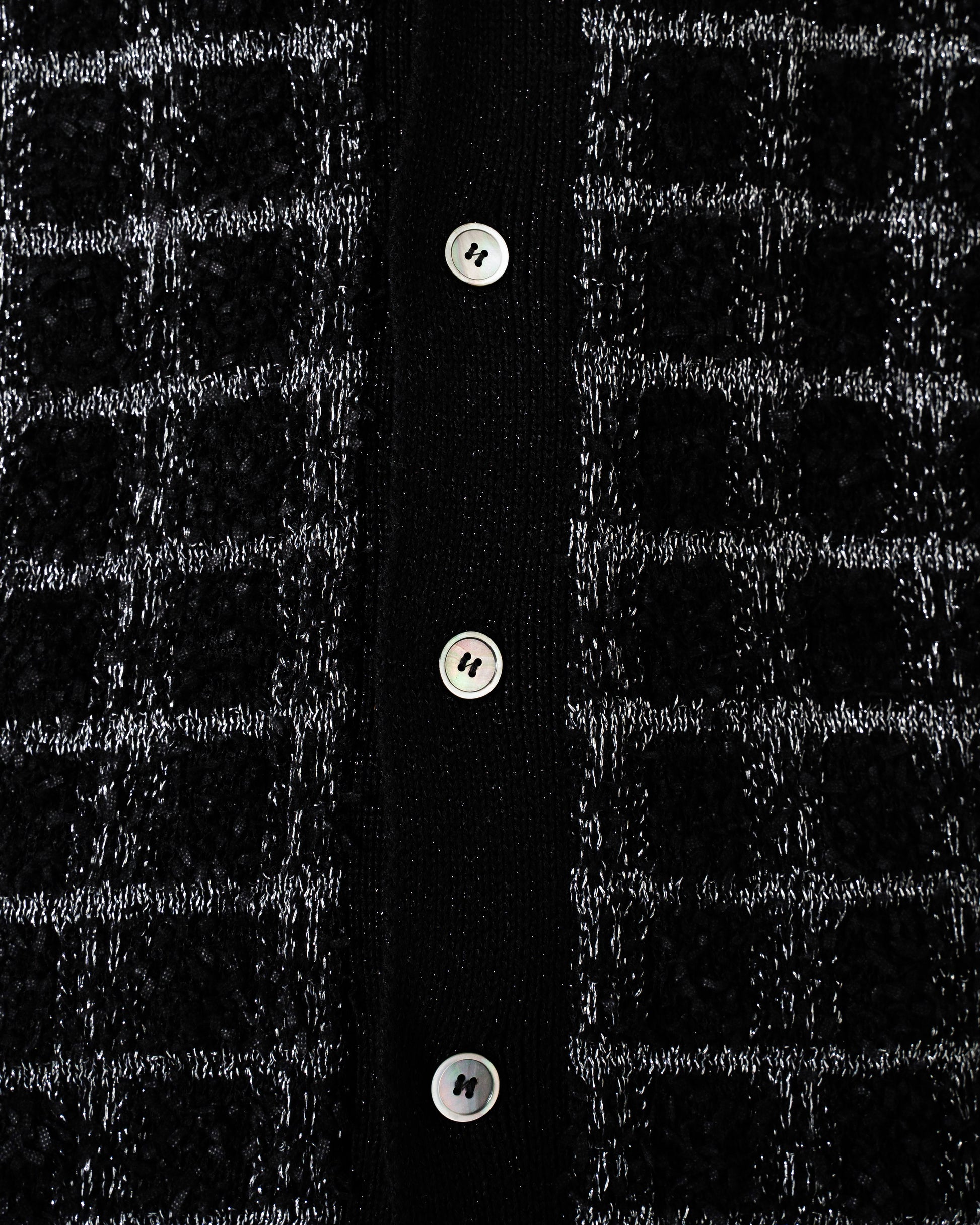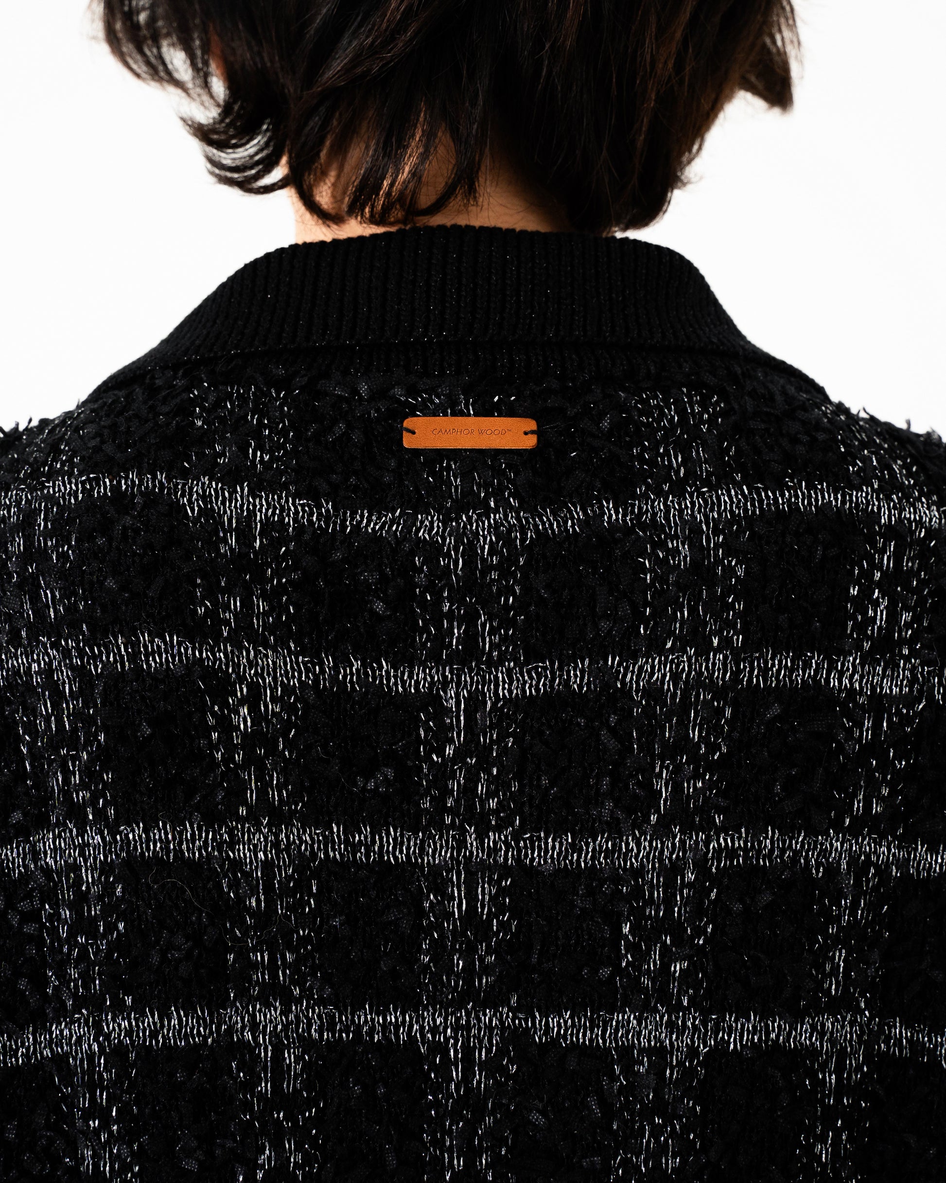 ラメ糸や意匠糸など複数の糸を複雑に編み込むことで、生地に豊かな立体感と奥行きを与え、上品な艶をまとわせている。