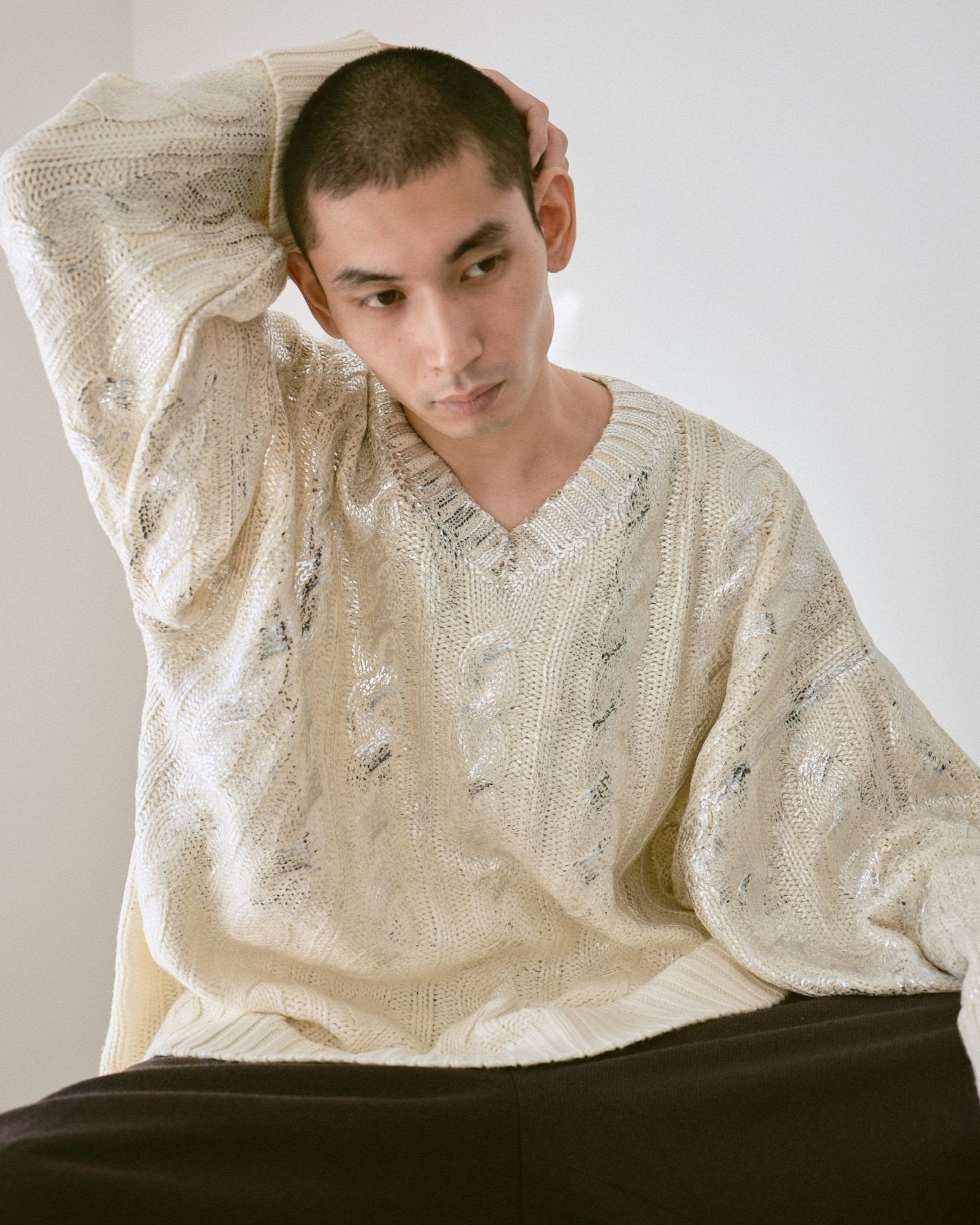 ご好評頂いている “ 箔加工 “ シリーズより、ヴィンテージハンドニットからサンプリングした銀箔加工ケーブルニットのリリース。