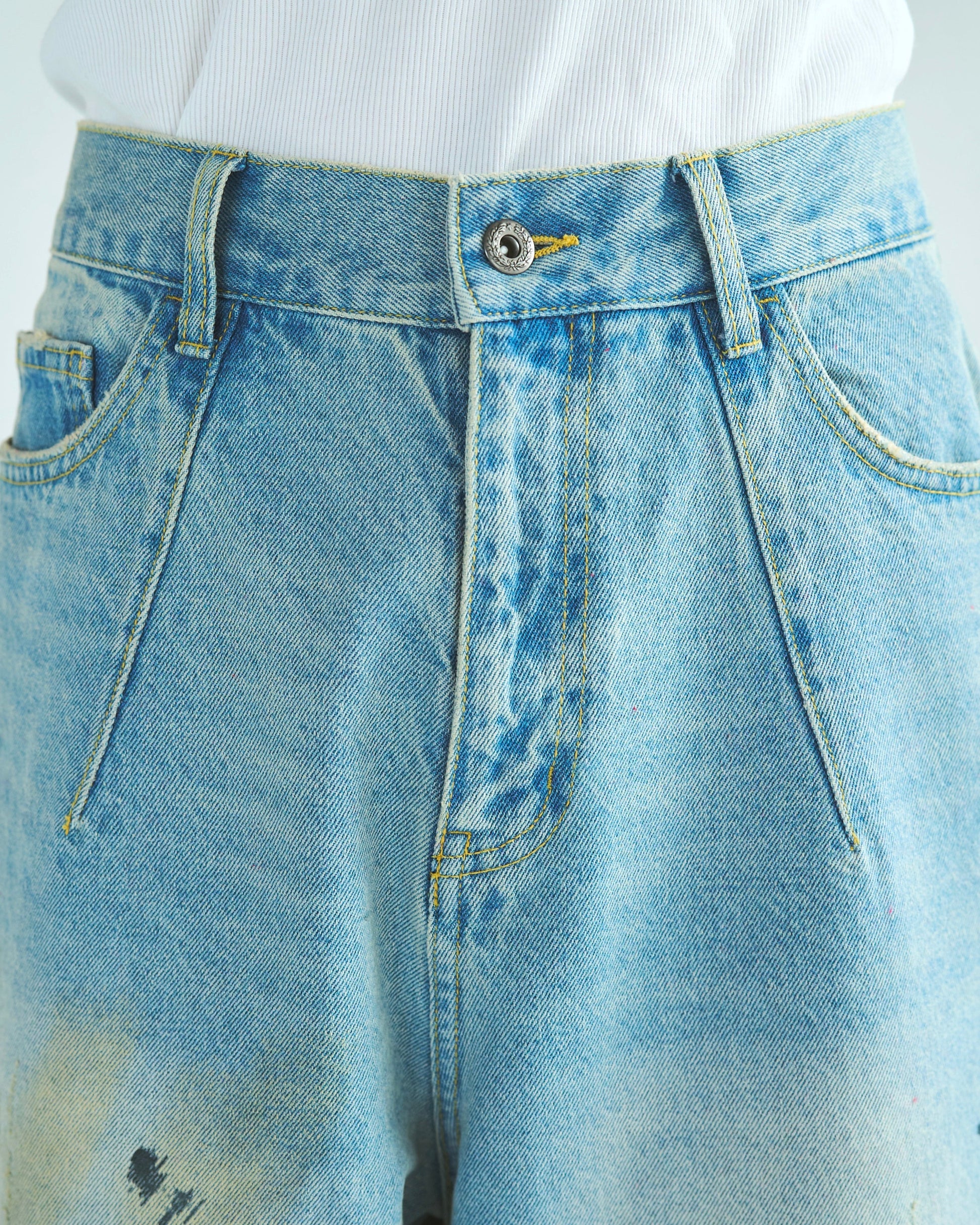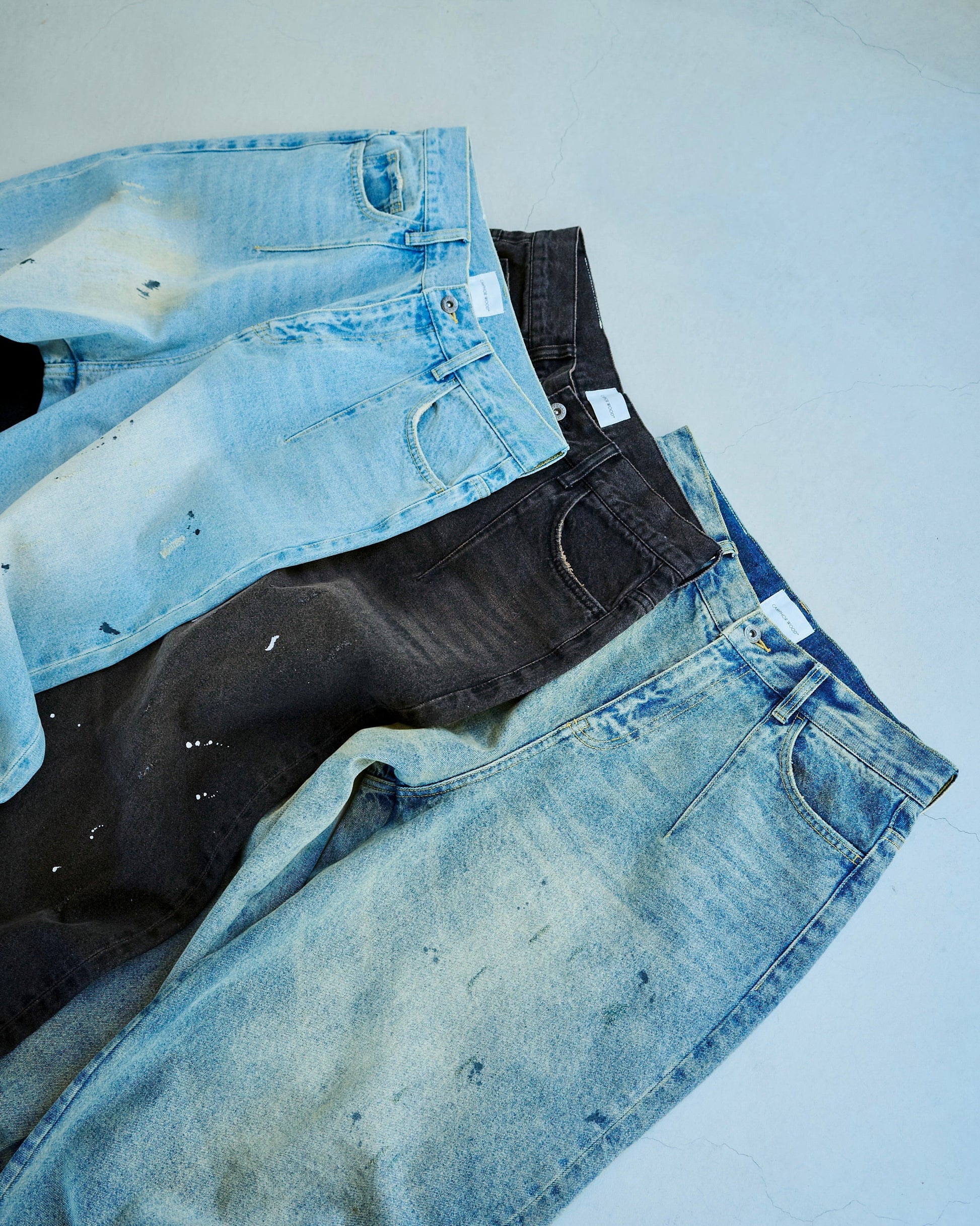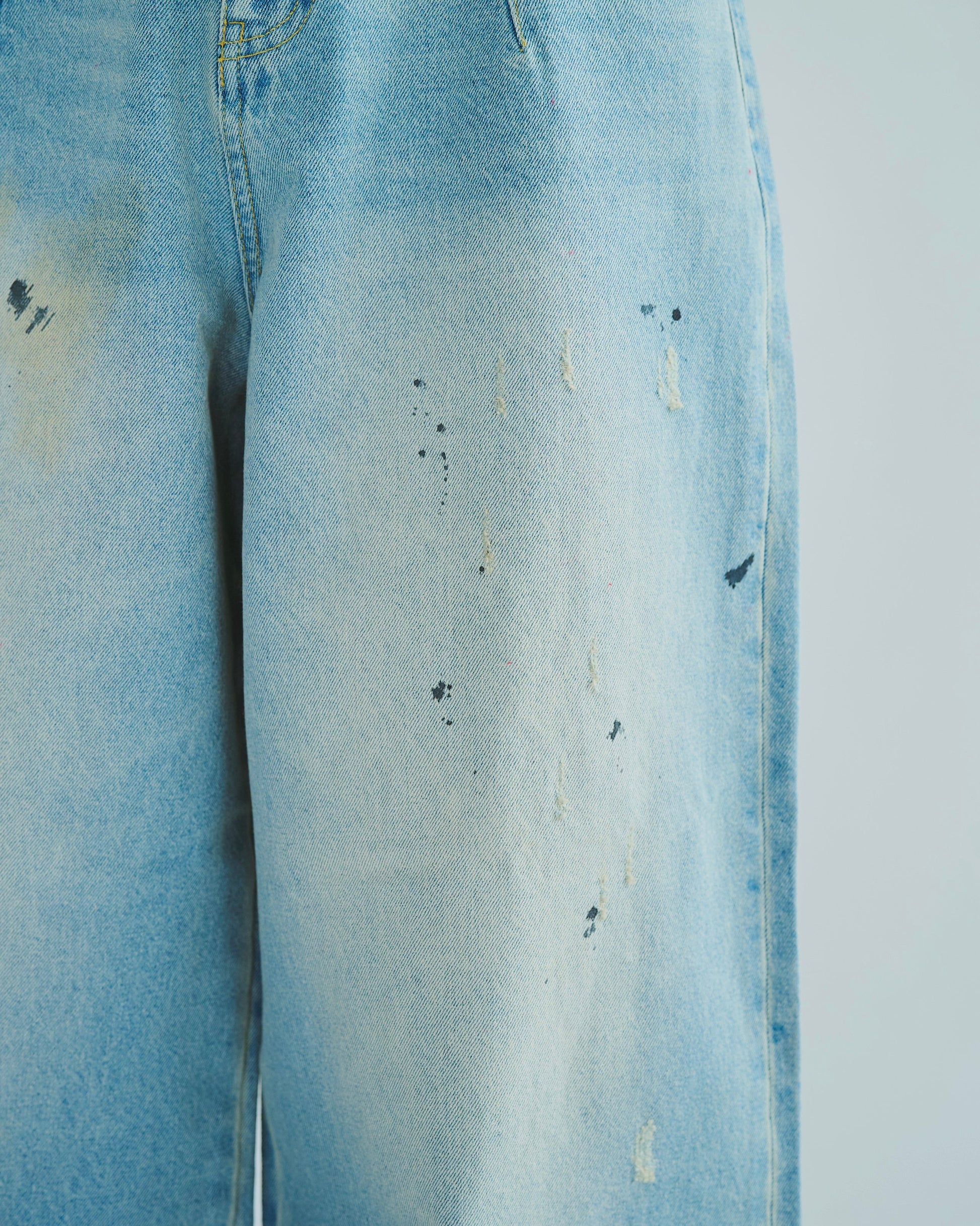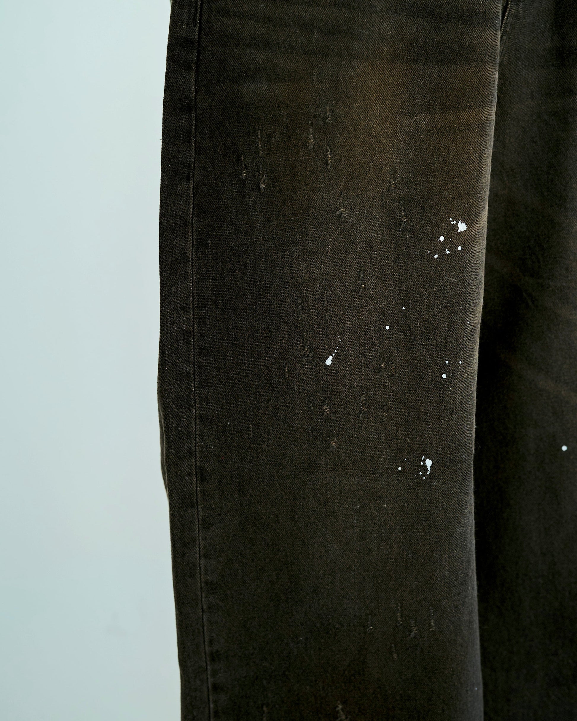 ディレクターが長年愛用し、履き潰したヴィンテージリーバイスをサンプリング。リアルな経年変化を感じさせるダメージや汚れの加工を施し、さらにオイルが飛び散ったようなペイント加工を細部に散りばめることで、完成度の高い一本に仕上りに。