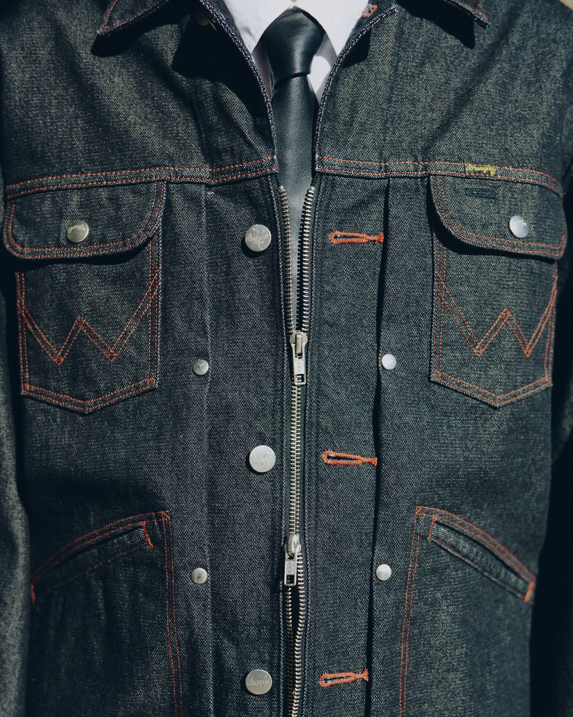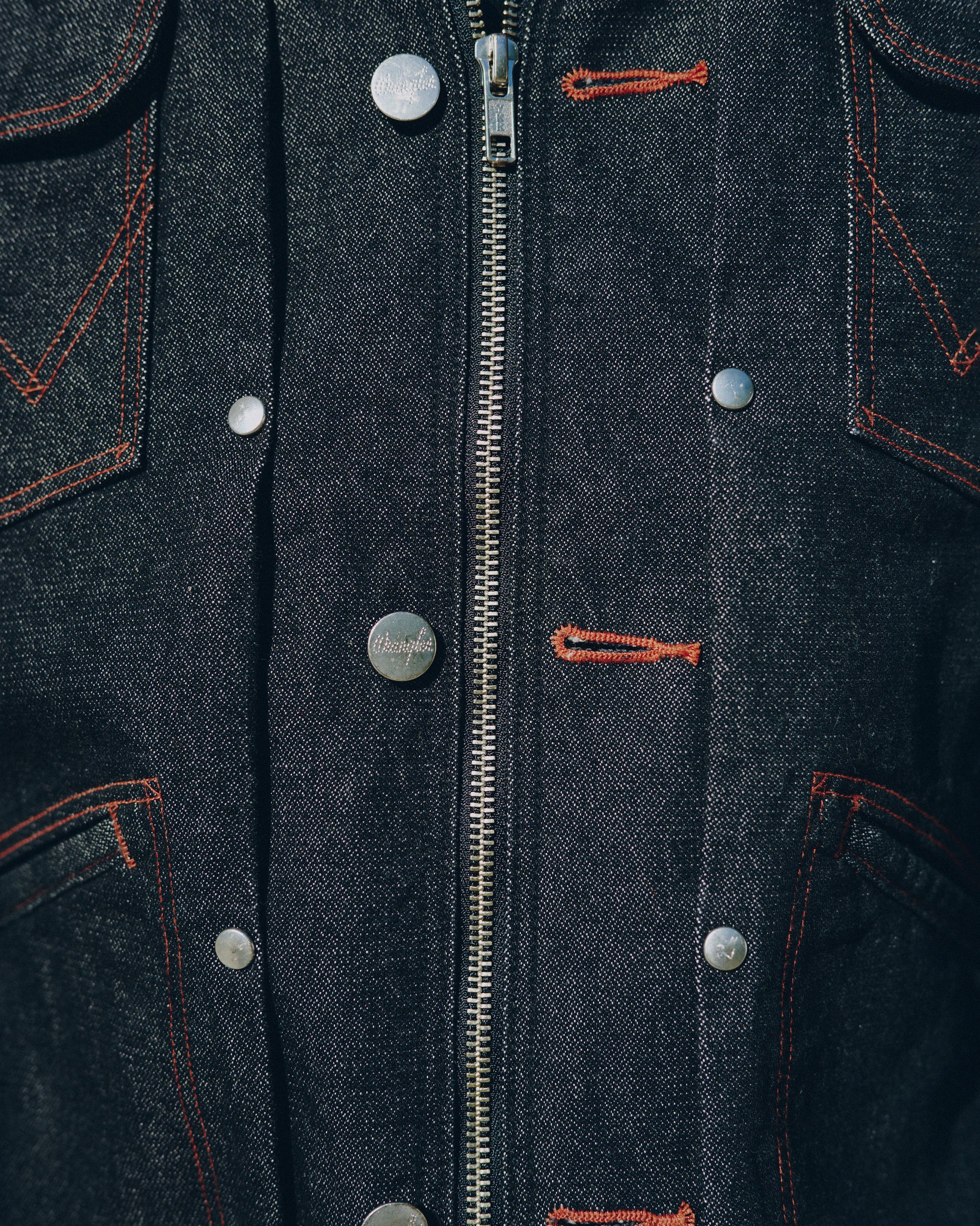 WRANGLERが誇る定番モデル「124MJ」と「24MJZ」をカスタムし、フロントをボタンとジップの2WAY仕様で構成したデニムトラッカージャケット。