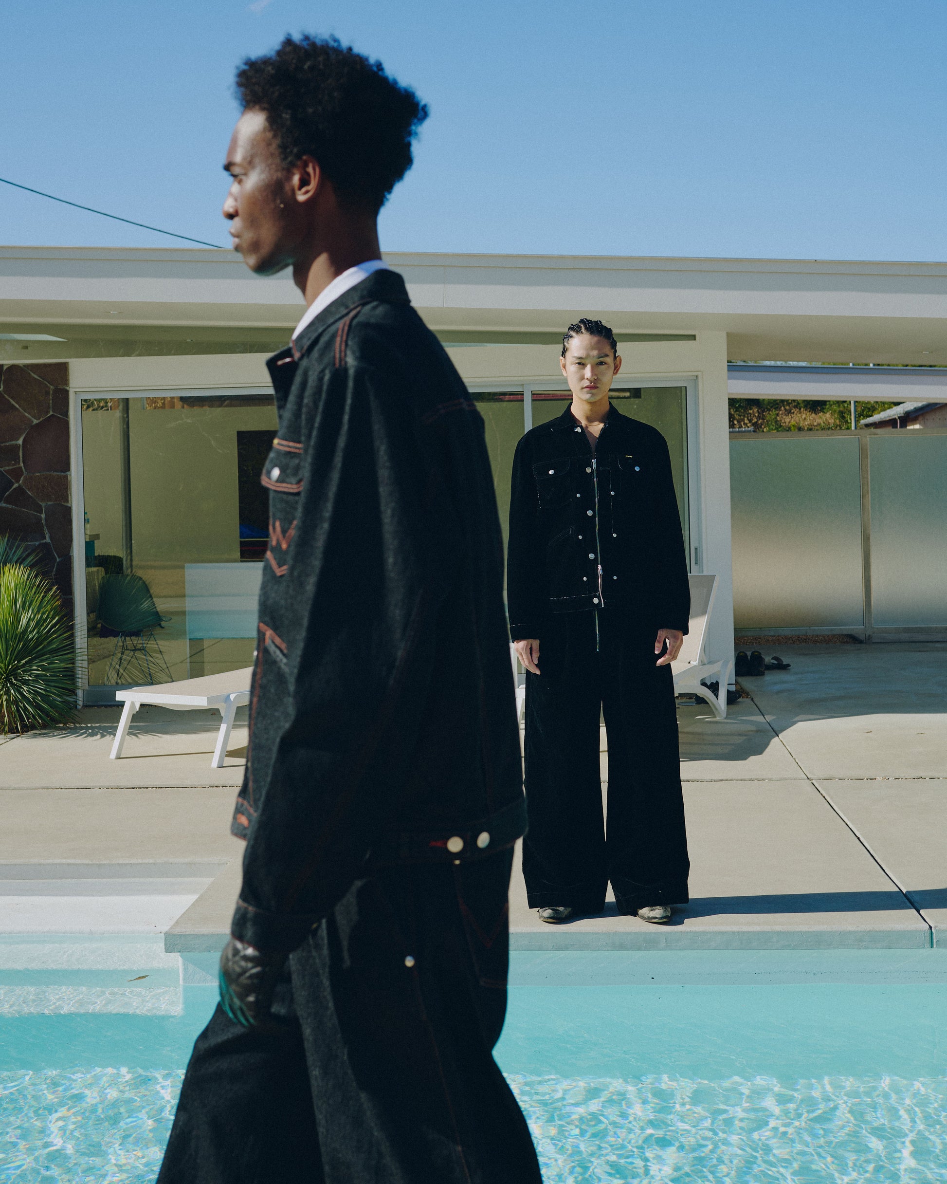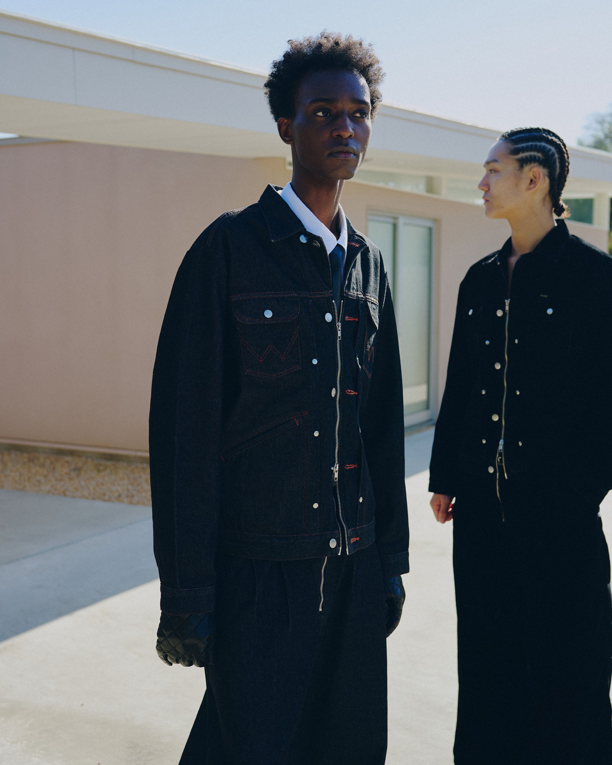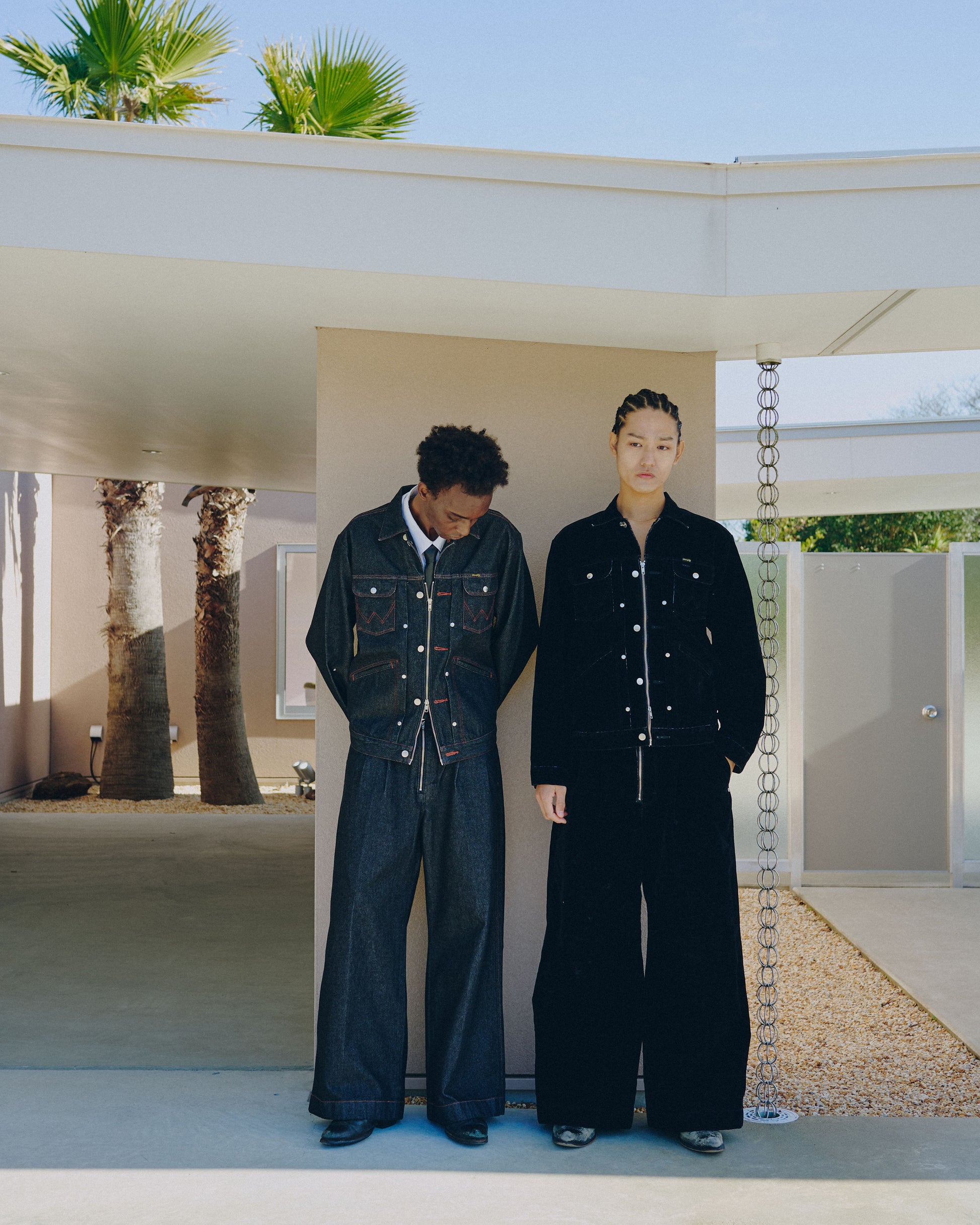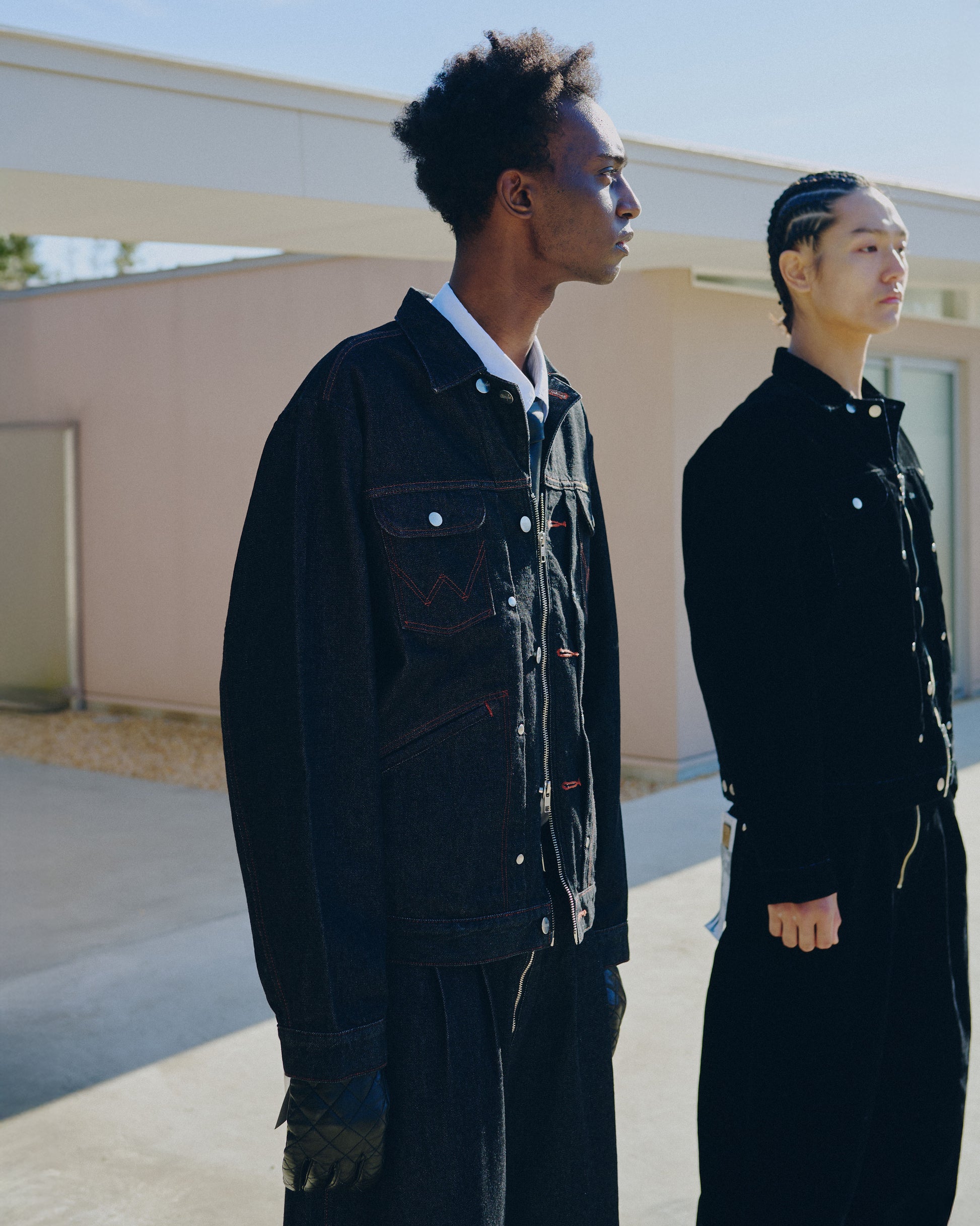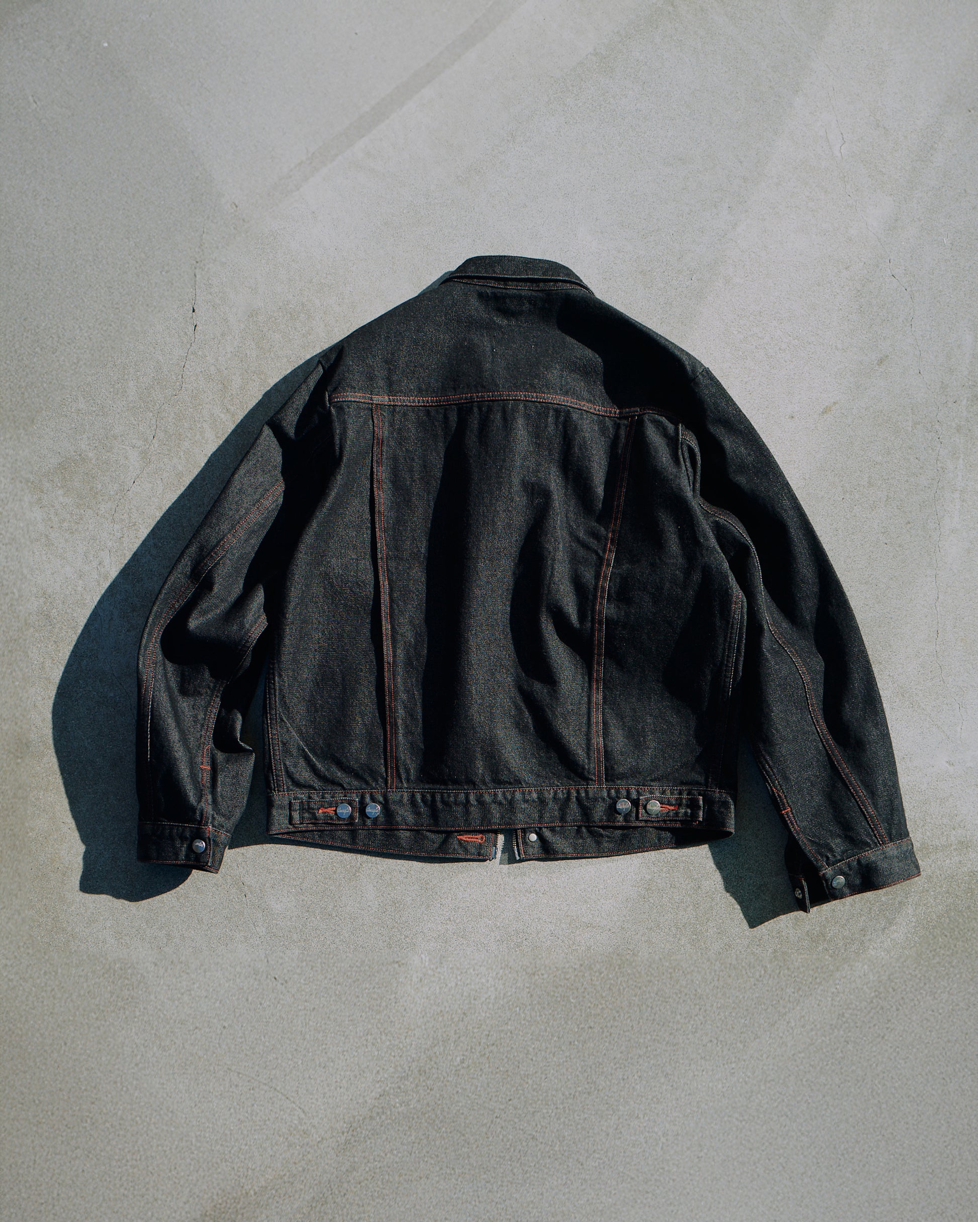 昨年ご好評いただいた「124MJ」タイプと「24MJZ」タイプをCamphorWood独自の解釈で再構築した2way仕様のトラッカージャケットと、定番ワイドバギーシルエットをベースとしたフロントジップ仕様のデニムトラウザーの計2型を軸に、新色「FLOCKY BLACK」を加えてリリース。