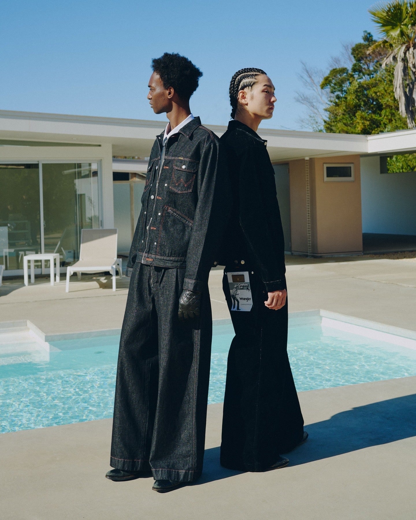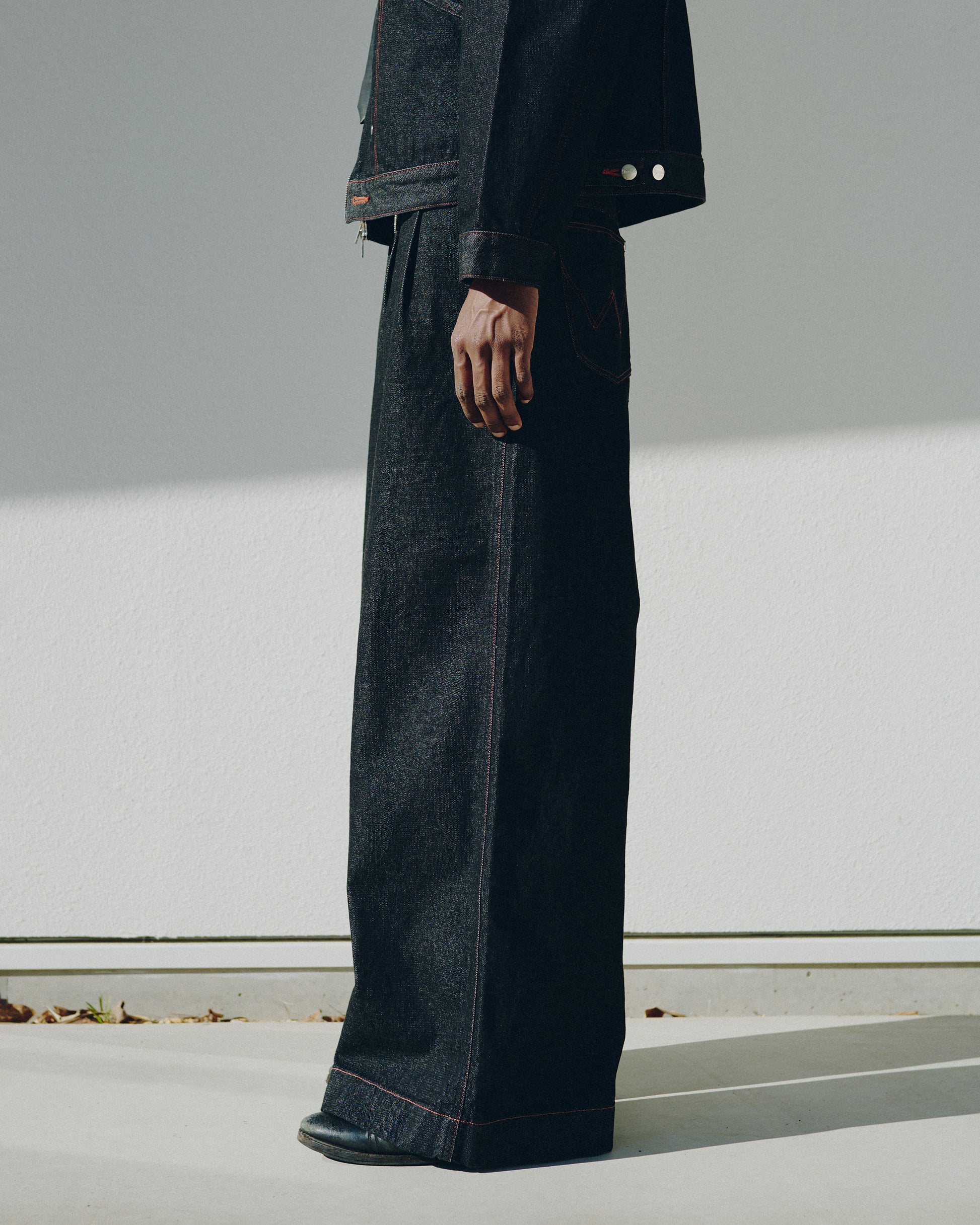 ブランド定番の2タックワイドバギーフレアスラックスをベースに、WRANGLERのブロークンデニムに落とし込んだワイドトラウザーズ。