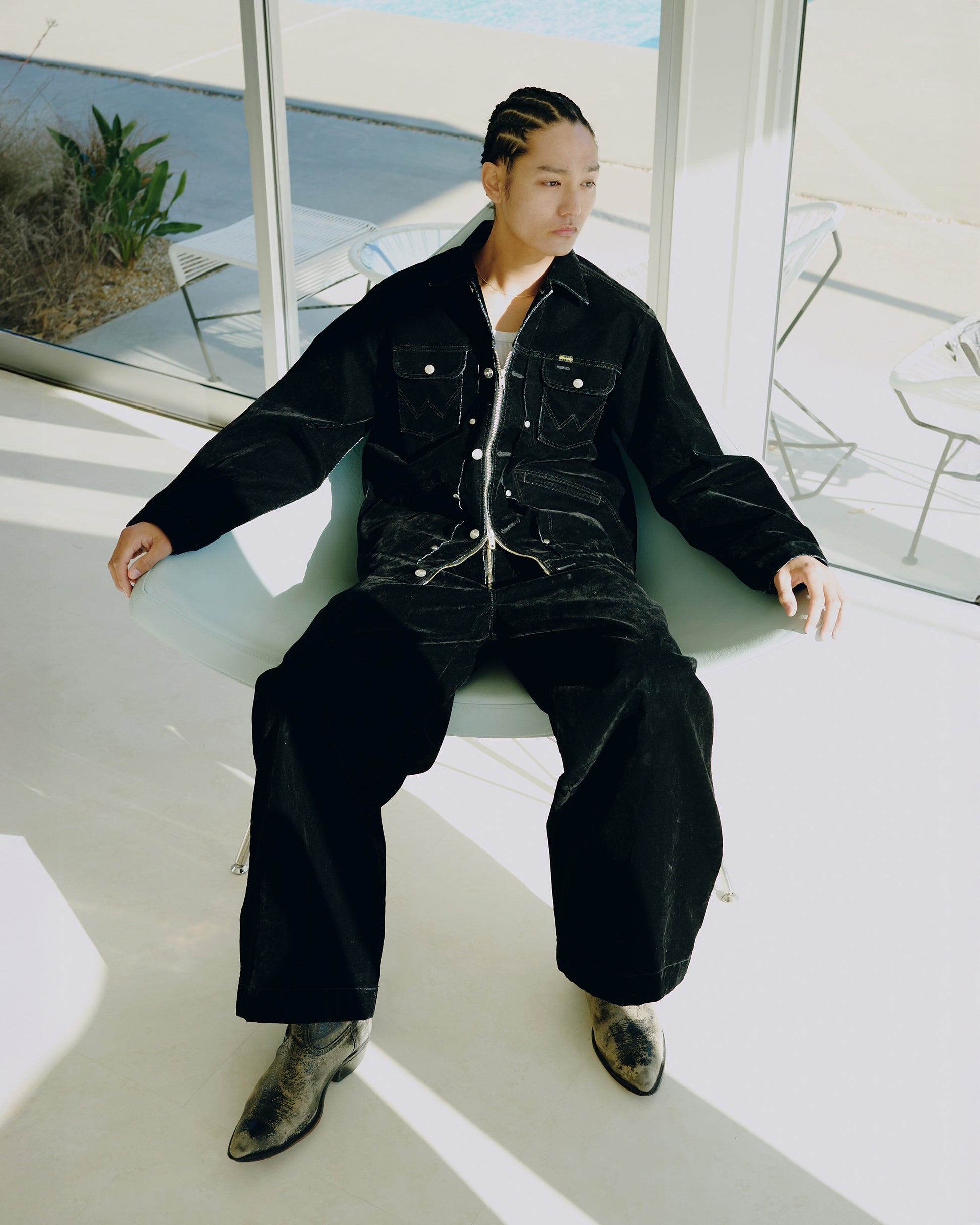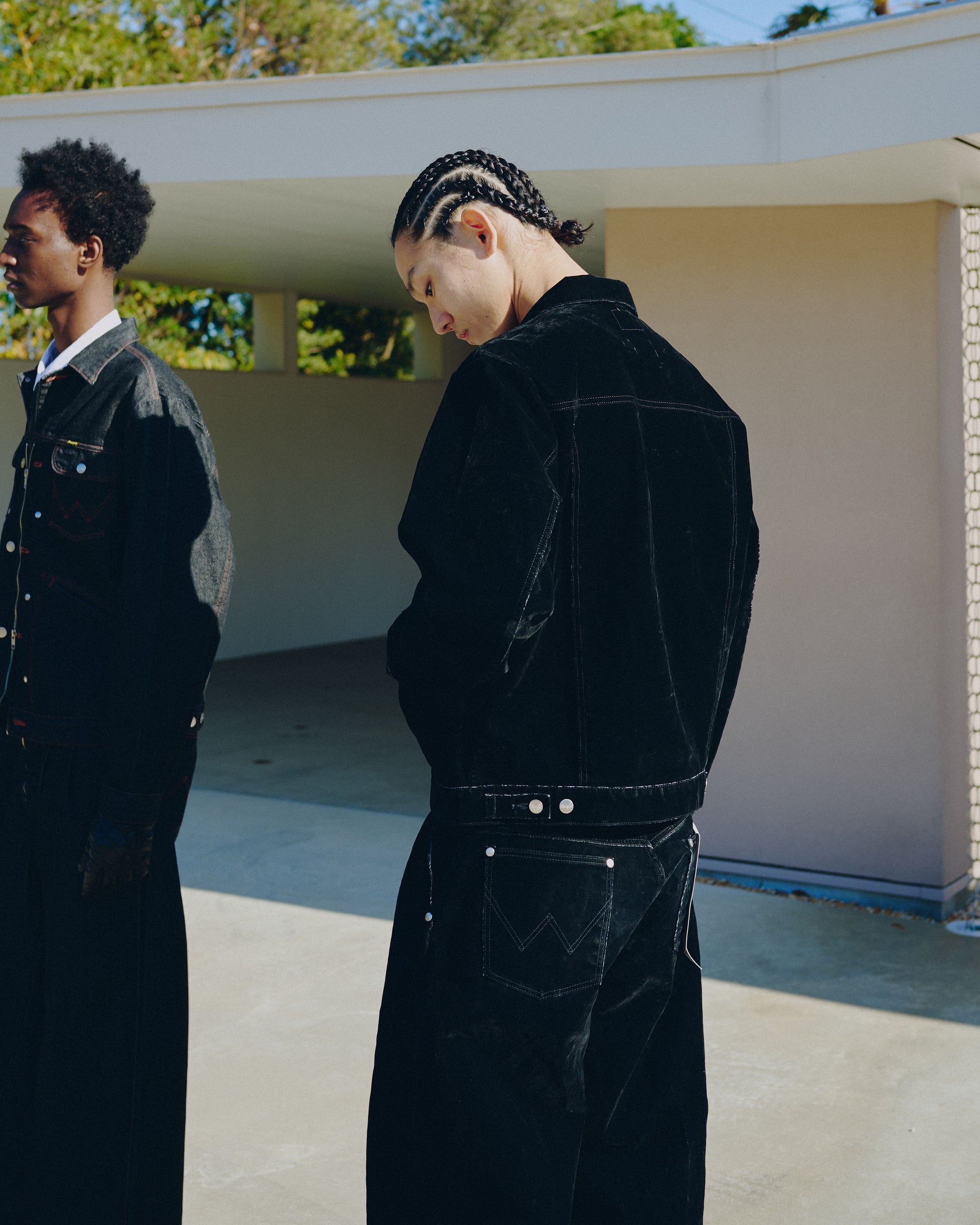 昨年ご好評いただいた「124MJ」タイプと「24MJZ」タイプをCamphorWood独自の解釈で再構築した2way仕様のトラッカージャケットと、定番ワイドバギーシルエットをベースとしたフロントジップ仕様のデニムトラウザーの計2型を軸に、新色「FLOCKY BLACK」を加えてリリース。