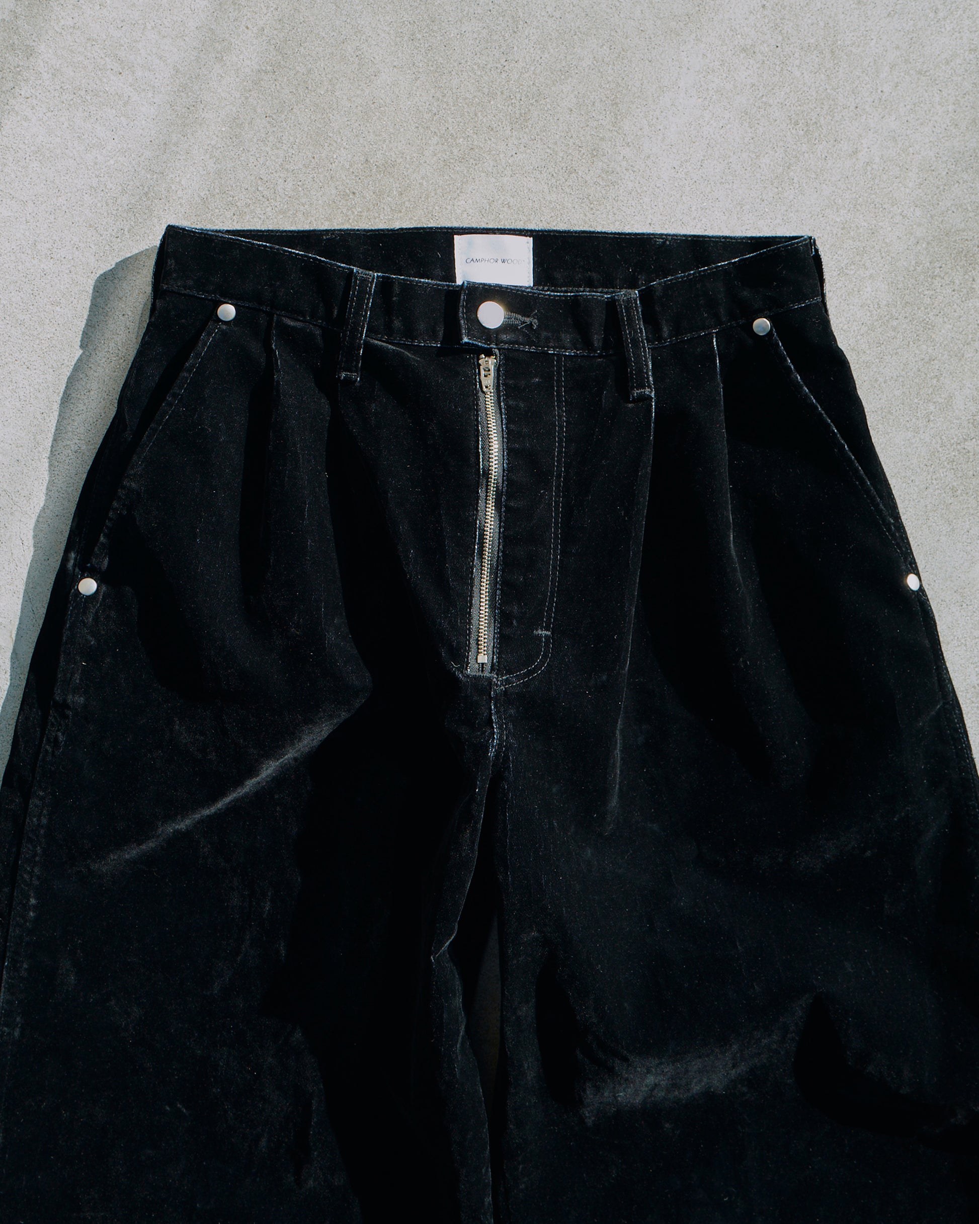 ZIPを剥き出しにしたフロントが特徴的で、ジャケットとのセットアップはもちろん、単体でも成立する存在感のある1本に。